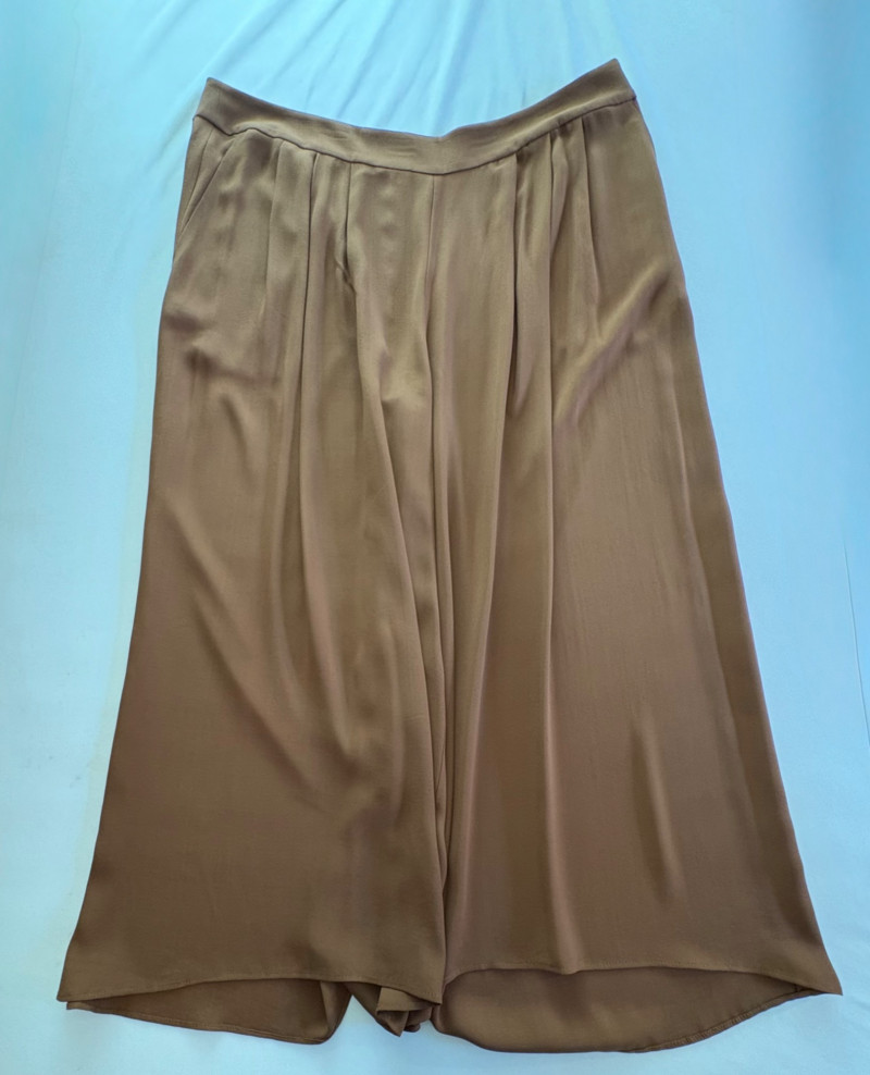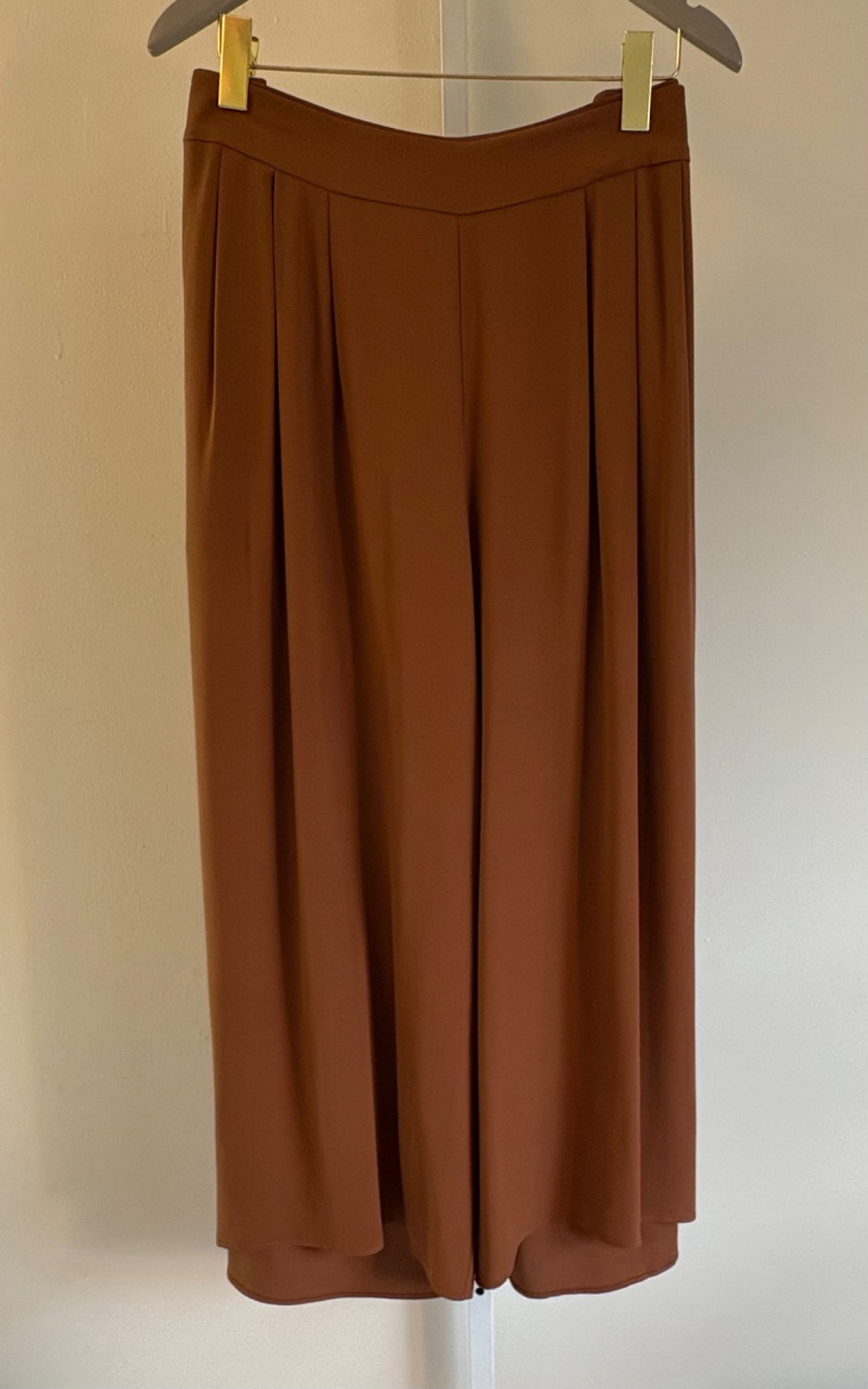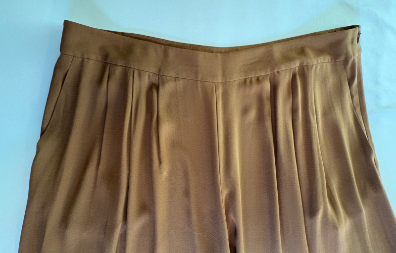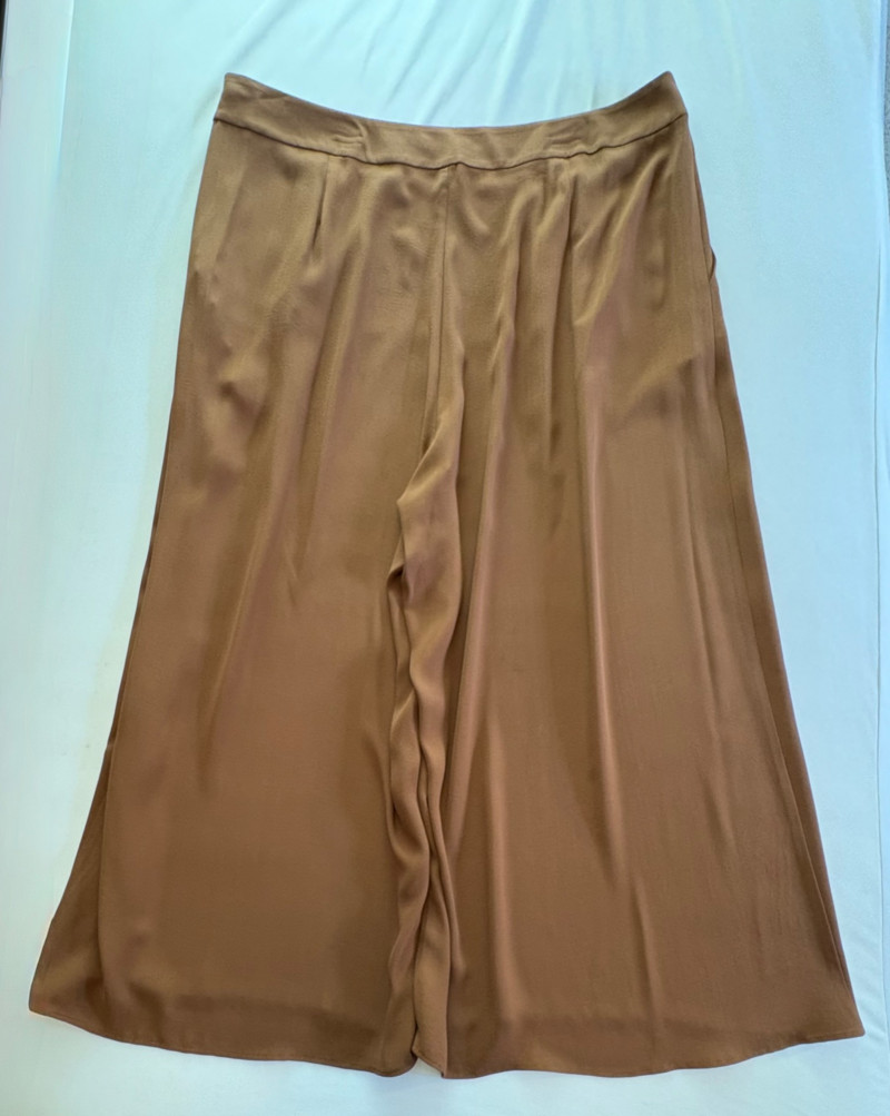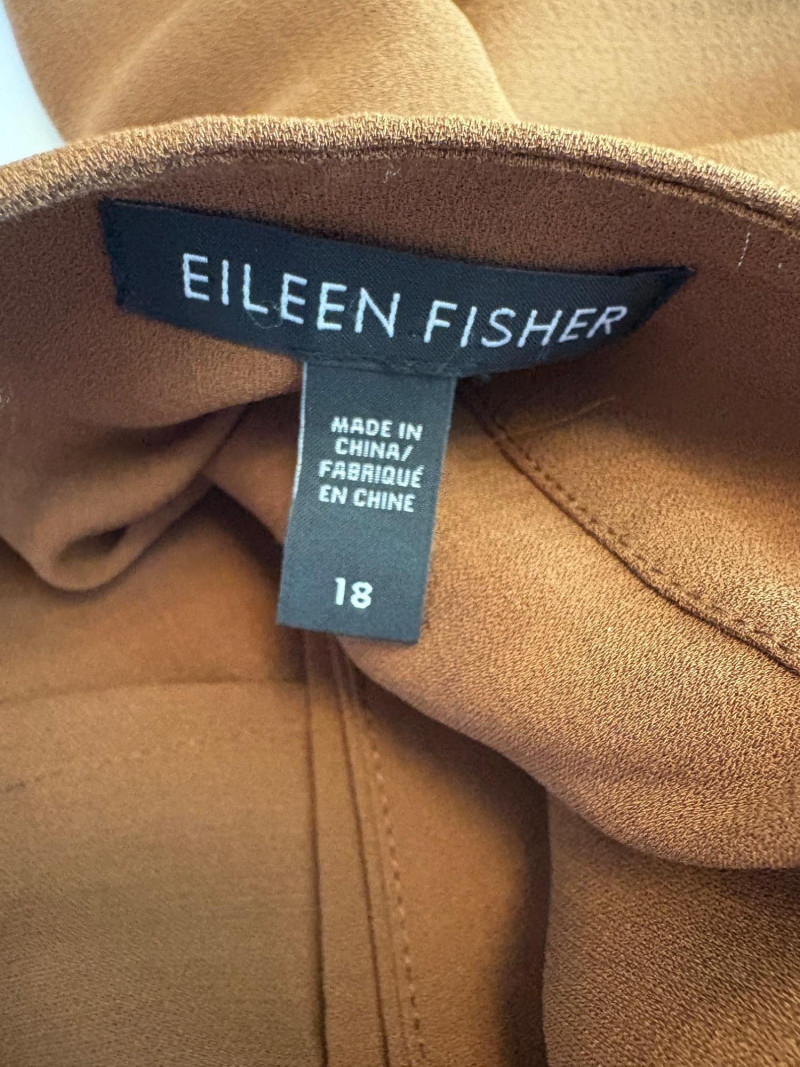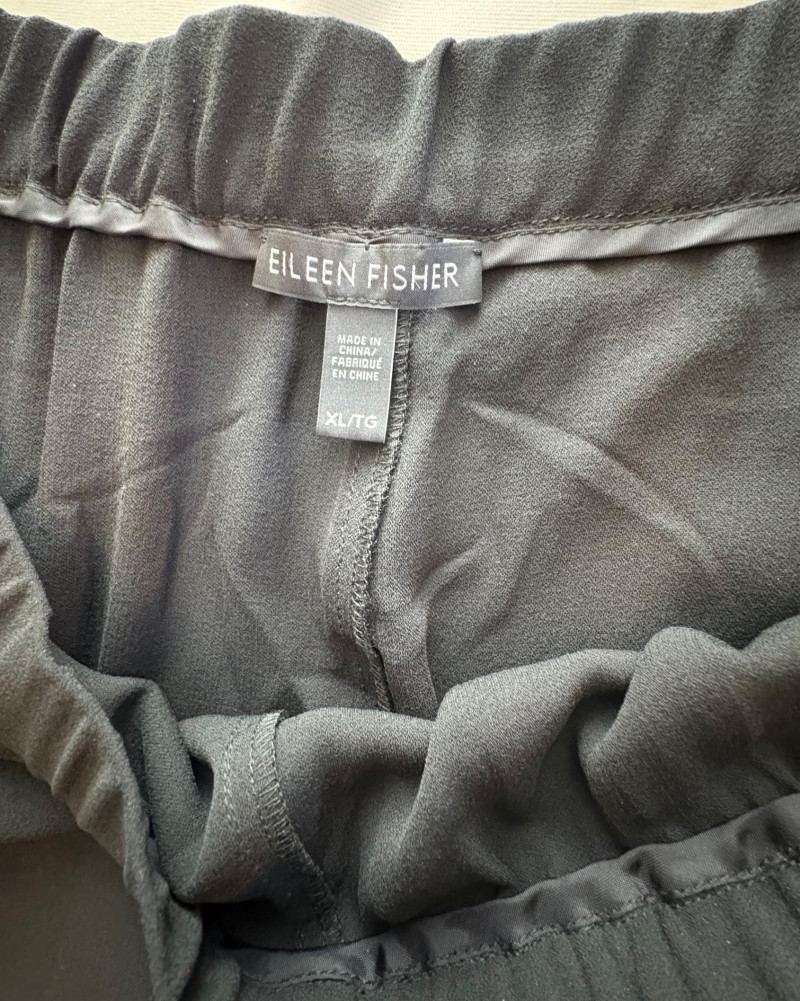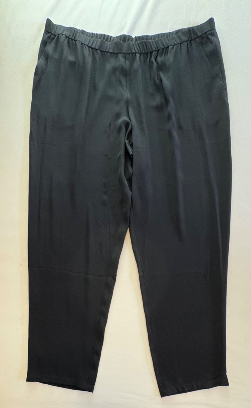 Two pairs of incredibly gorgeous 100% silk pants from Eileen Fisher. Both are in excellent condition. Brown pair has front pleats, set-in side pockets, wide fitted waistband, back waistline darts, and invisible side zip closure with wide legs (measure 18" wide!). Measure 20" side to side at waist with 24" inseam. Size tag says 18. Black pants have elasticated waistband, set-in side front pockets, back waist line darts, and tapered leg. Measure 20" side to side at waist with 28.5" inseam. Size tag says XL. NOTE: as larger gals, we hate when people display pants in our size with the waistband folded back to make them look smaller - it doesn't give the true shape/size of the pants. Thus, the photos of both of these pairs of pants hanging up aren't ideal. However, since they are silk, the whole beauty of the pants is the flowing "hang" which is lost when laid flat. In order to get the photo with the correct "hang" we folded the waistbands - mea culpa, but now you can see how beautiful they are!