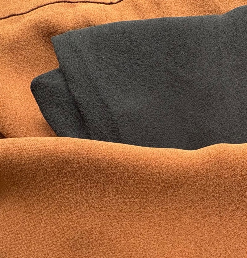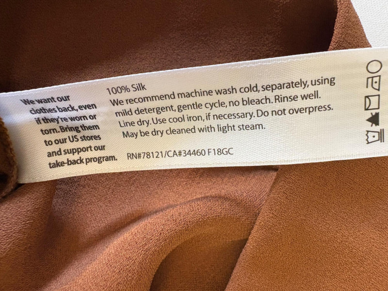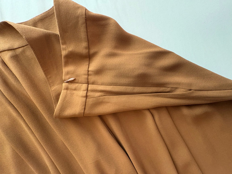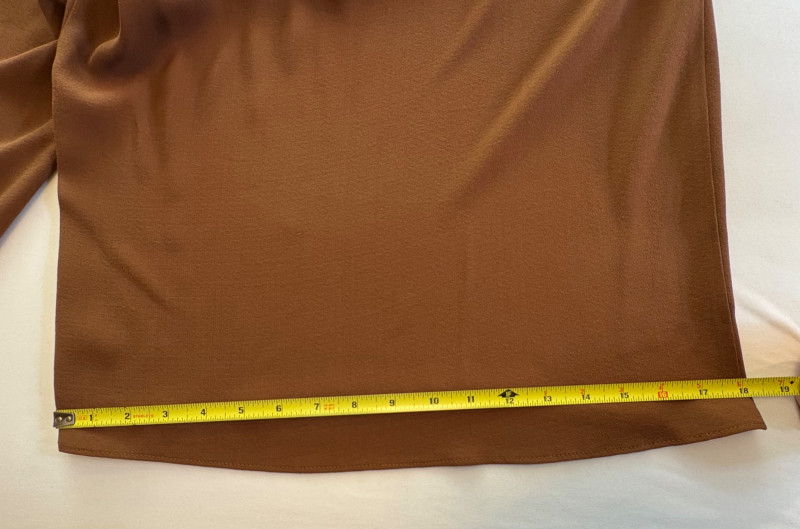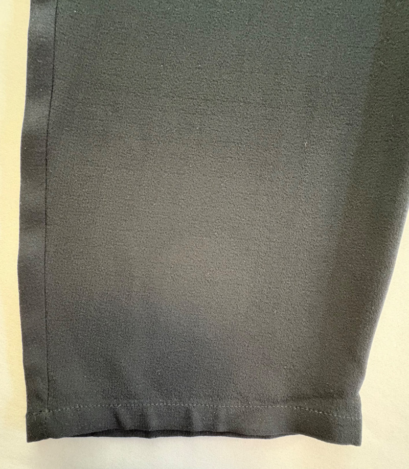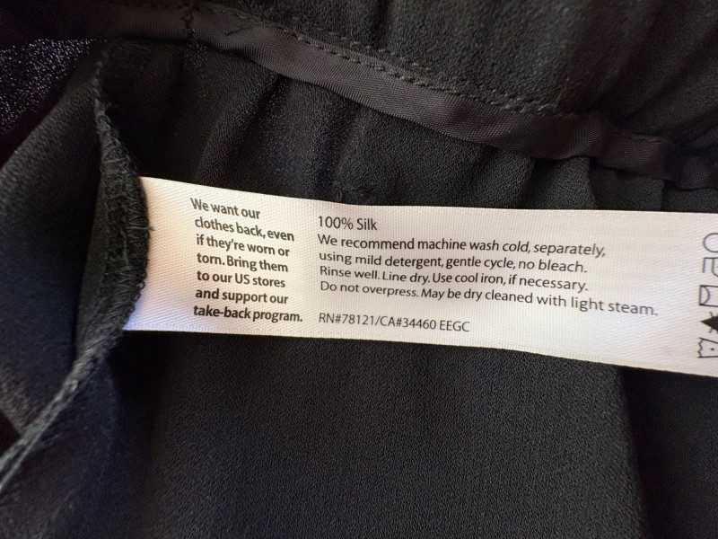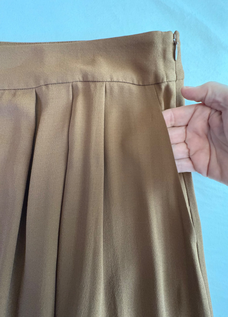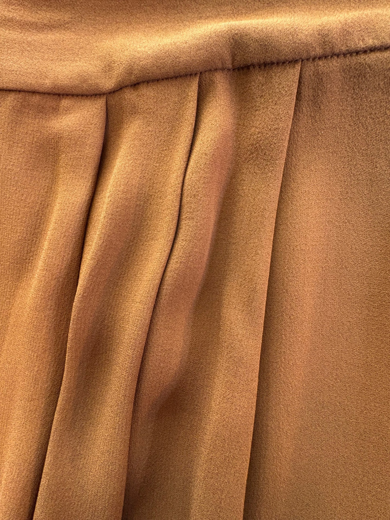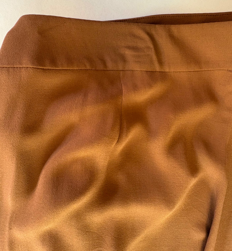 Two pairs of incredibly gorgeous 100% silk pants from Eileen Fisher. Both are in excellent condition. Brown pair has front pleats, set-in side pockets, wide fitted waistband, back waistline darts, and invisible side zip closure with wide legs (measure 18" wide!). Measure 20" side to side at waist with 24" inseam. Size tag says 18. Black pants have elasticated waistband, set-in side front pockets, back waist line darts, and tapered leg. Measure 20" side to side at waist with 28.5" inseam. Size tag says XL. NOTE: as larger gals, we hate when people display pants in our size with the waistband folded back to make them look smaller - it doesn't give the true shape/size of the pants. Thus, the photos of both of these pairs of pants hanging up aren't ideal. However, since they are silk, the whole beauty of the pants is the flowing "hang" which is lost when laid flat. In order to get the photo with the correct "hang" we folded the waistbands - mea culpa, but now you can see how beautiful they are!
