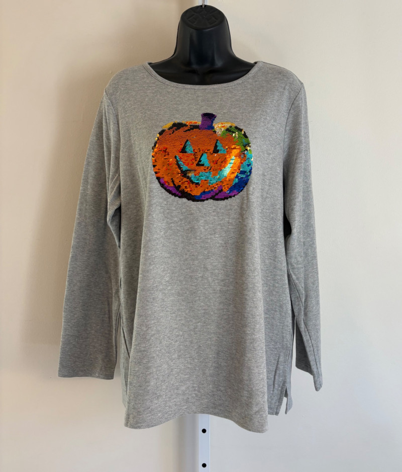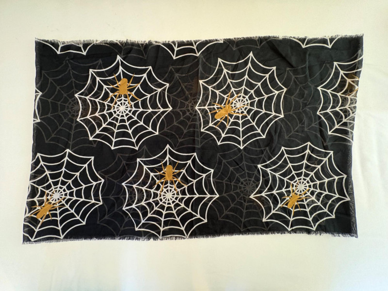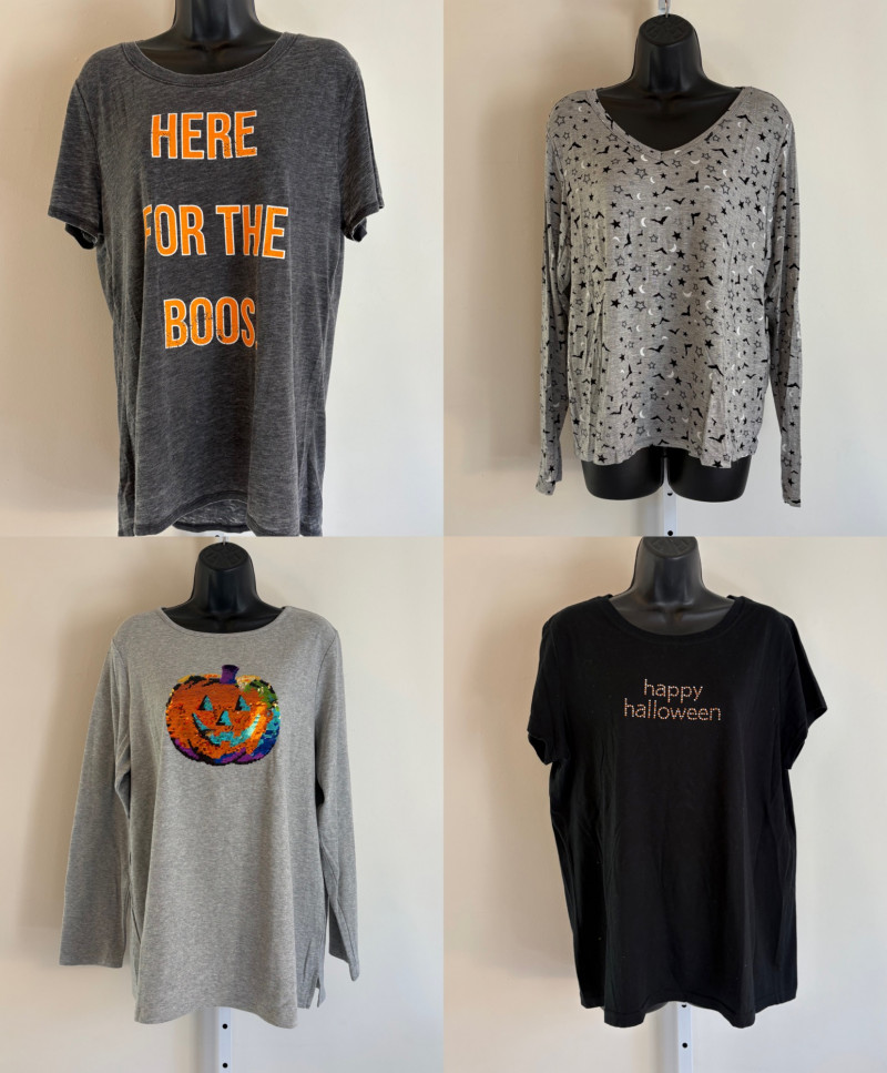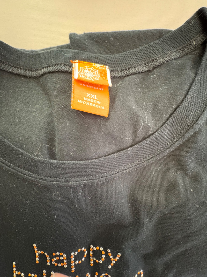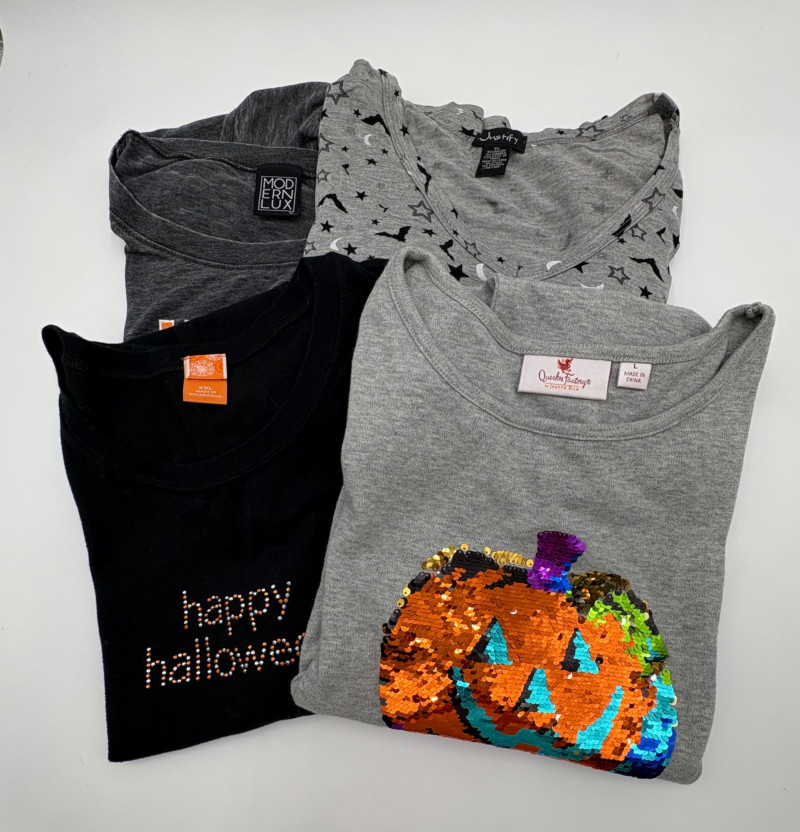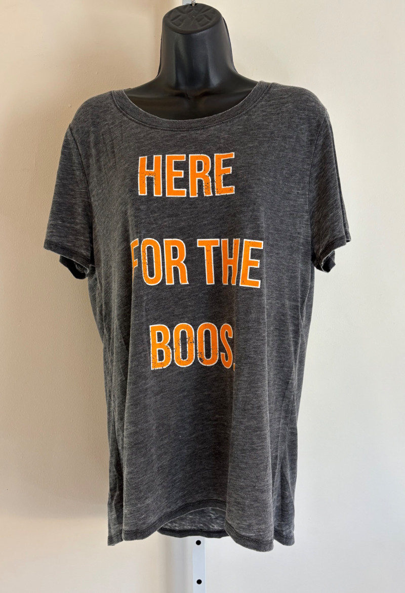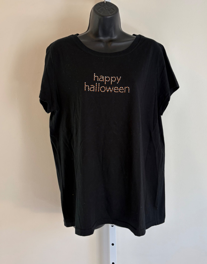 Four shirts with a Halloween theme from various makers. . Black scoop neck t-shirt with "Happy Halloween" in orange and silver dots. In good condition. Shirt measures 20.5" pit to pit and 25.5" from the back neck seam to bottom hem. Maker unknown. Size tag says XXL. Gray heavy t-shirt with sequin jack-o’-lantern from Quacker Factory. In great condition. Measures 22.5" pit to pit and 26.5" from back neckline to back bottom hem. Size tag says L. Grey bats and stars t-shirt with a V-neck line from Justify. Measures 22.5" pit to pit and 22" from back neckline to back hem. In used condition. Size tag says XL. Dark grey "Here for the Boos" t-shirt with orange lettering from Modern Lux. In used condition. Measures 20" pit to pit and 28" from back neckline to bottom hem. BONUS - black circular scarf with spiderwebs & gold spiders - 100% polyester.