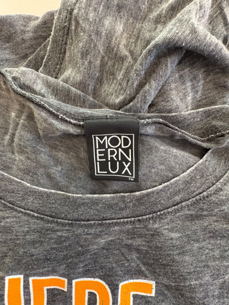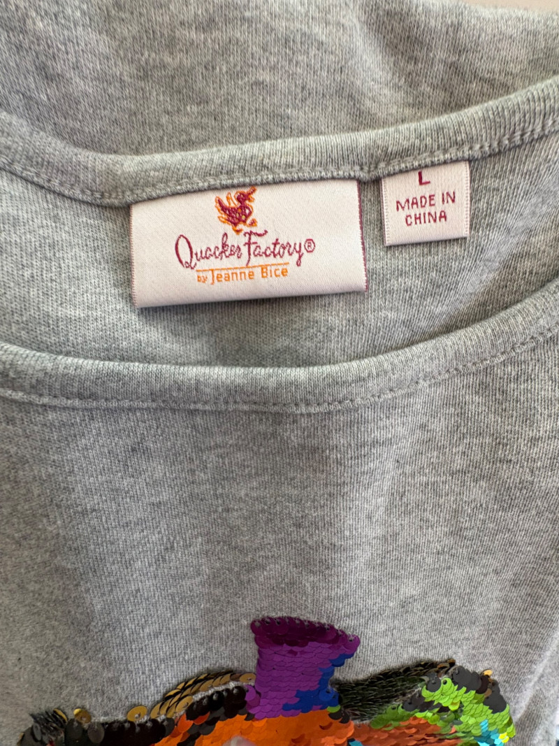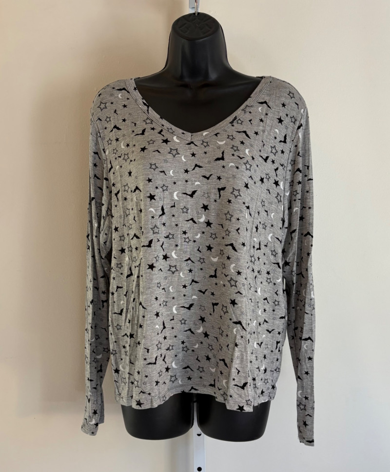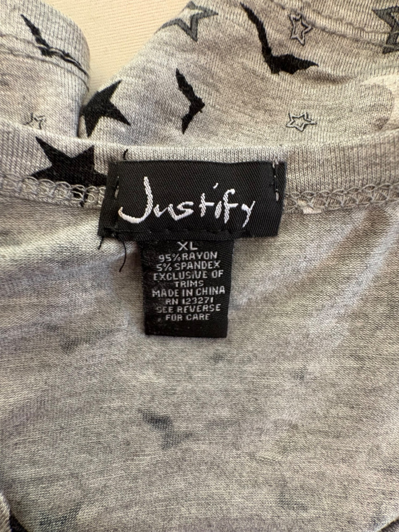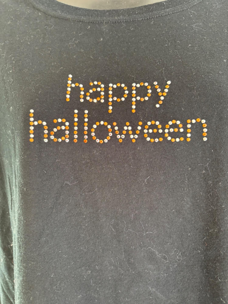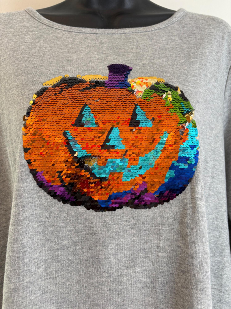 Four shirts with a Halloween theme from various makers. . Black scoop neck t-shirt with "Happy Halloween" in orange and silver dots. In good condition. Shirt measures 20.5" pit to pit and 25.5" from the back neck seam to bottom hem. Maker unknown. Size tag says XXL. Gray heavy t-shirt with sequin jack-o’-lantern from Quacker Factory. In great condition. Measures 22.5" pit to pit and 26.5" from back neckline to back bottom hem. Size tag says L. Grey bats and stars t-shirt with a V-neck line from Justify. Measures 22.5" pit to pit and 22" from back neckline to back hem. In used condition. Size tag says XL. Dark grey "Here for the Boos" t-shirt with orange lettering from Modern Lux. In used condition. Measures 20" pit to pit and 28" from back neckline to bottom hem. BONUS - black circular scarf with spiderwebs & gold spiders - 100% polyester.