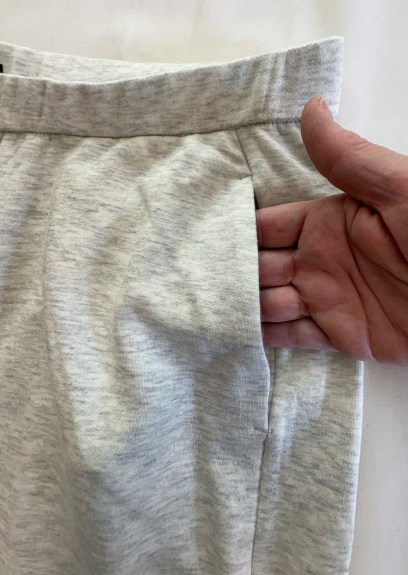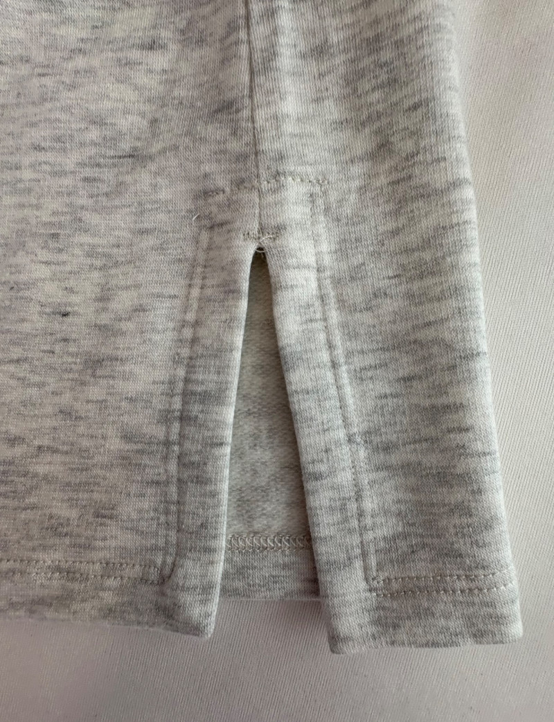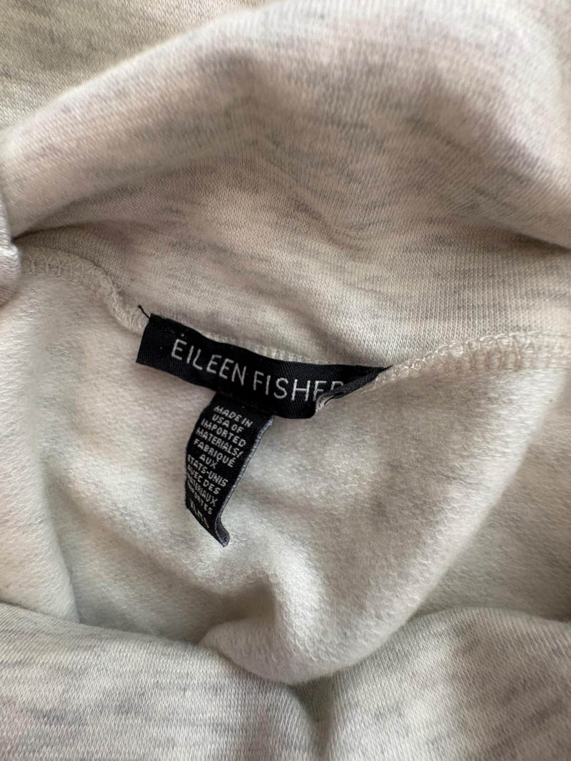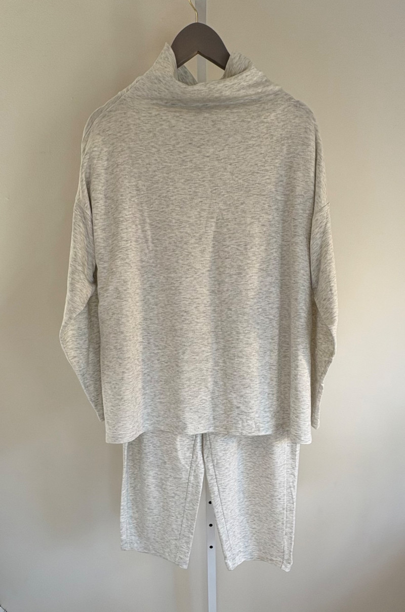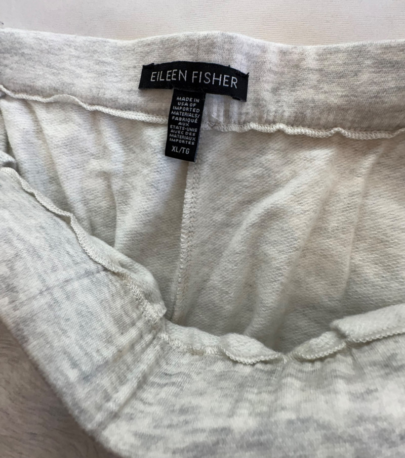 Super soft and comfortable lounge pant & top set from Eileen Fisher. (A bit heavier than some of the other lounge sets up for auction - could possibly be worn with a cardigan & tennis shoes to the supermarket) Smooth and stretchy in pale marled grey & white fabric. Long-sleeve top has funnel neck, dropped shoulder seams, and split hem. In excellent condition. 65% Tencel and 28" cotton with 7% elastane. Measures 26" pit to pit and 24.5" from back collar to bottom back hem. Size tag says XL. Straight leg pants have flat elasticated waistband and in-seam side pockets. In excellent condition. 65% Tencel and 28% cotton with 7% elastane. Measures 17.5" side to side at waist with 27" inseam. Size tag says XL.