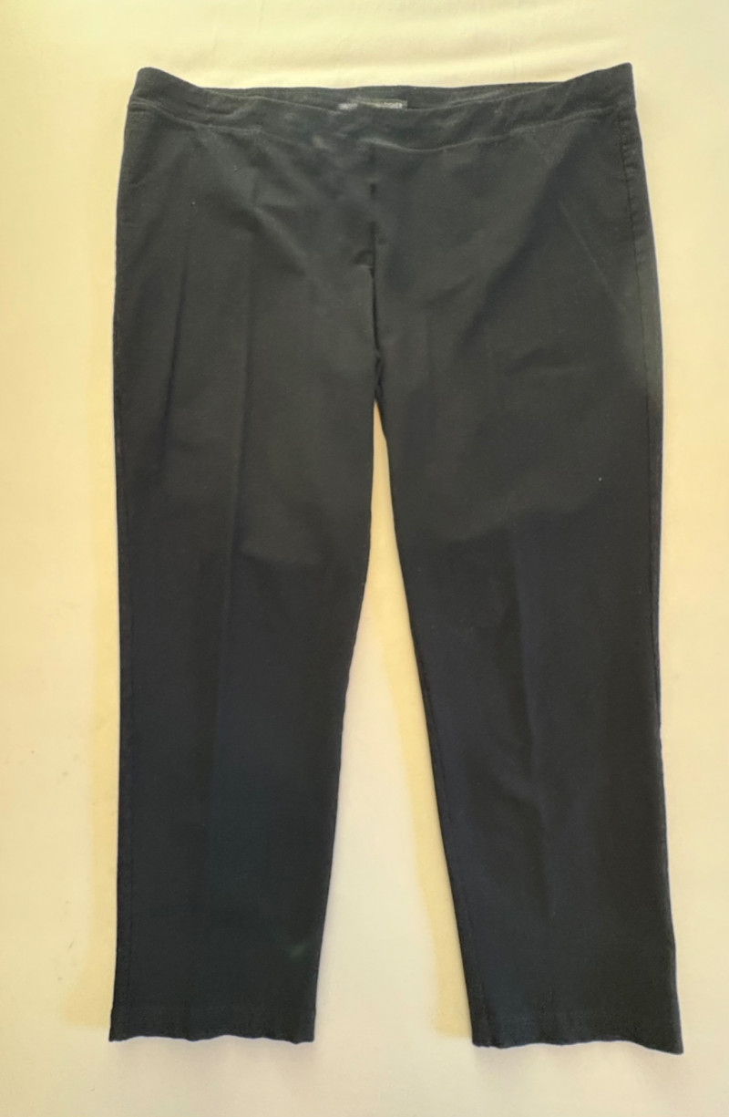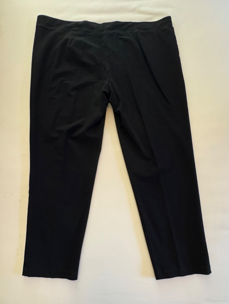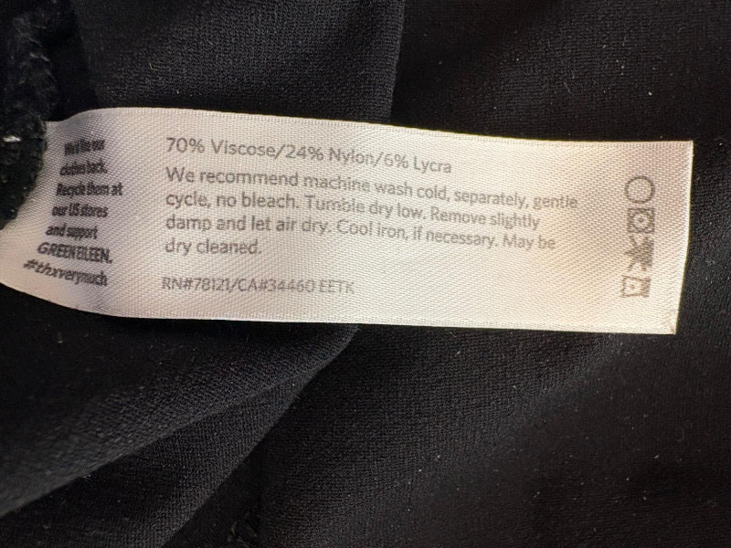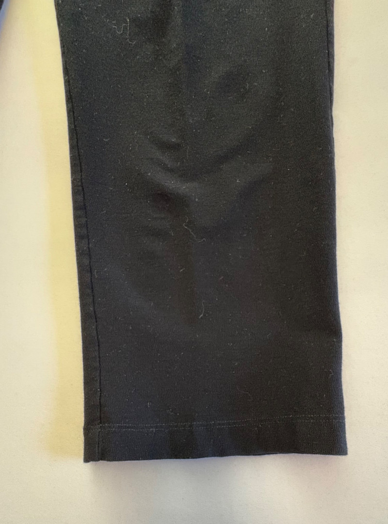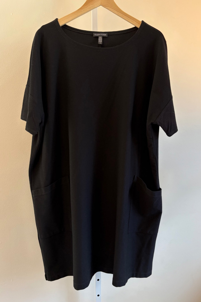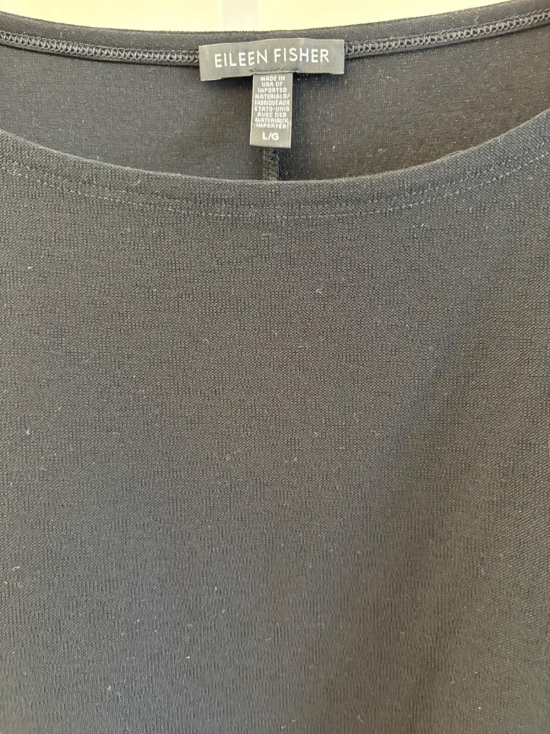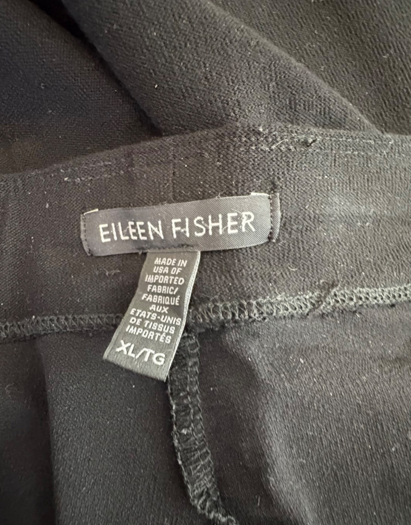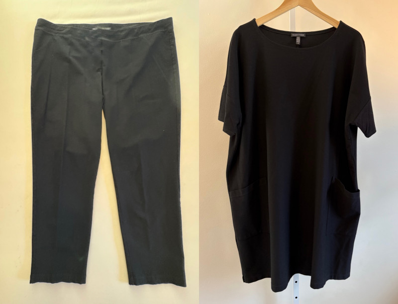 Basic black duo that can be dress up or down from Eileen Fisher. Both in 70% viscose with 24% nylon and 6% spandex.* Black tunic top (could also be worn as a dress) has curved neckline, short sleeves, and angled front patch pockets and a slight split hem. Stretchy heavy knit feel. In very good used condition. Measures 25.5" pit to pit and 35" from back neckline to back hemline. Size tag says L/G. Pants have elasticated flat waist, back darts, and narrow tapered legs for a very slim but comfortable fit - not quite leggings but the same feel in pants. In very good used condition. Measures 19.5" side to side at waist with 26" inseam. Size tag says XL. *Despite the photos variance, the pants and top are the same exact color & fabric.