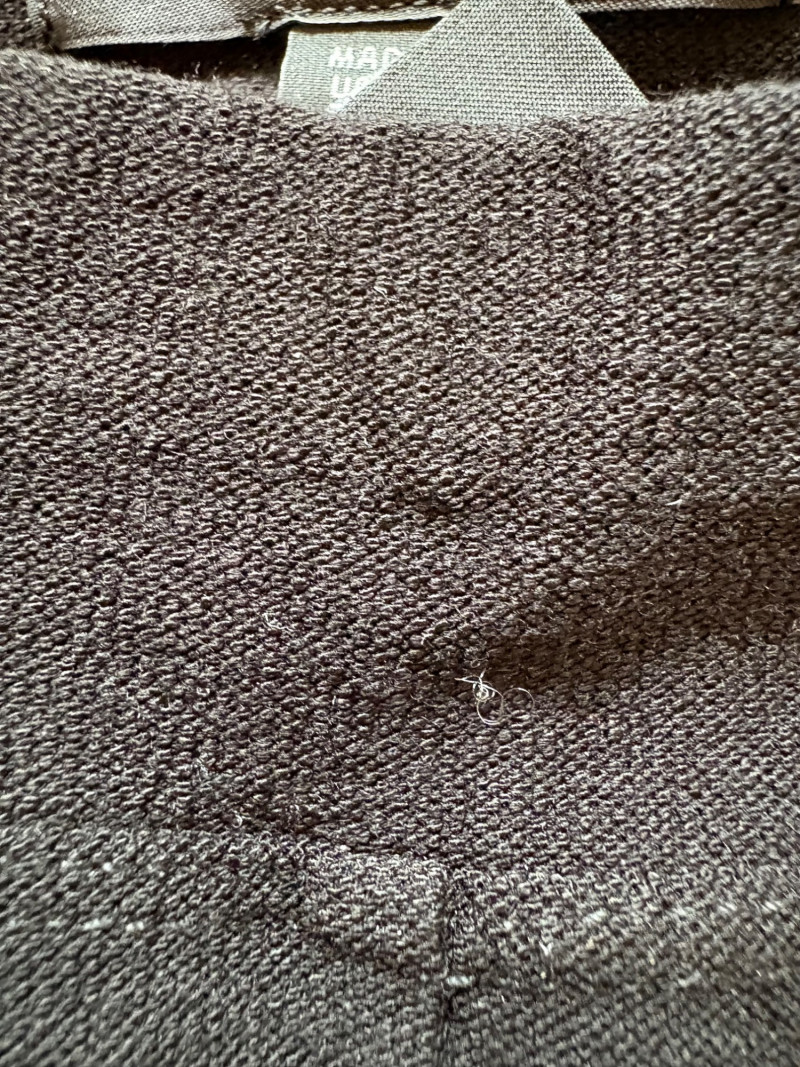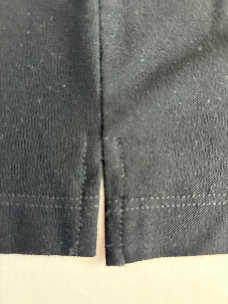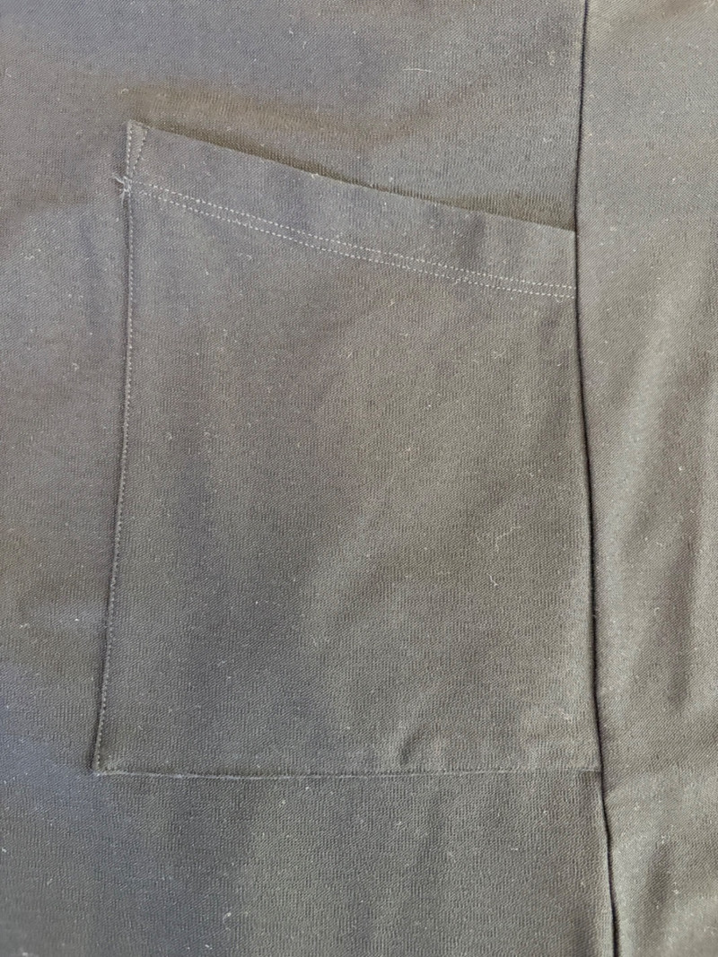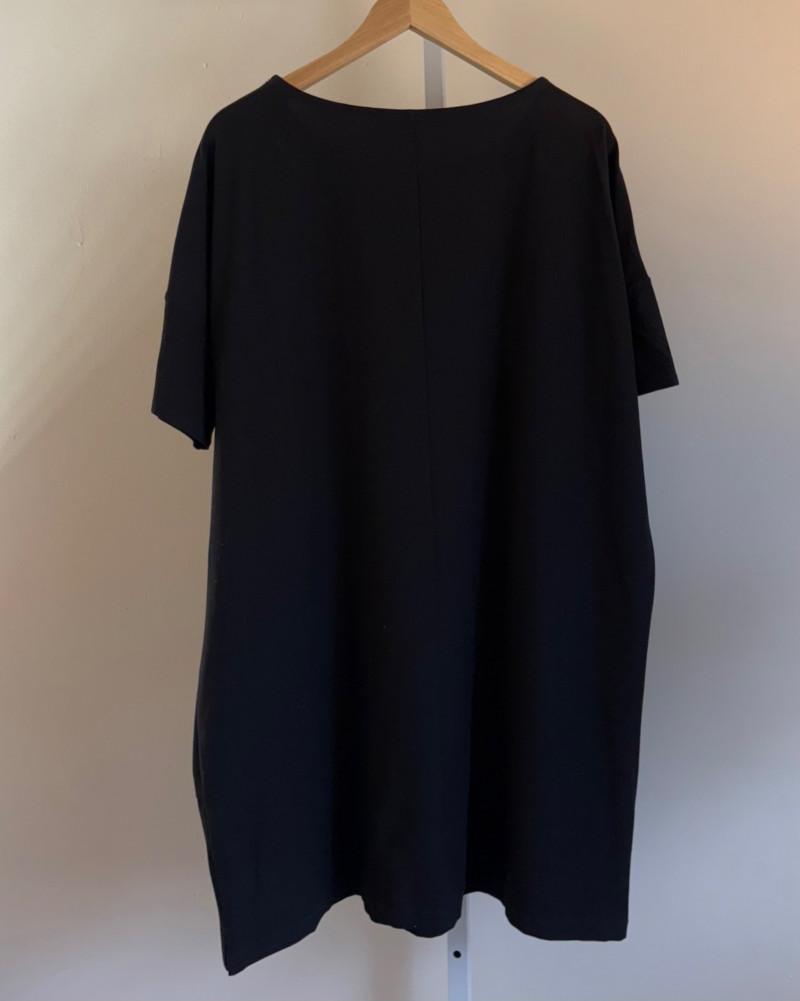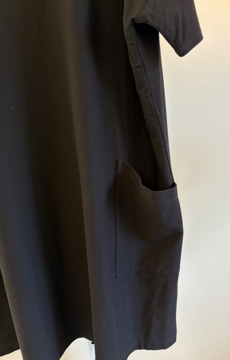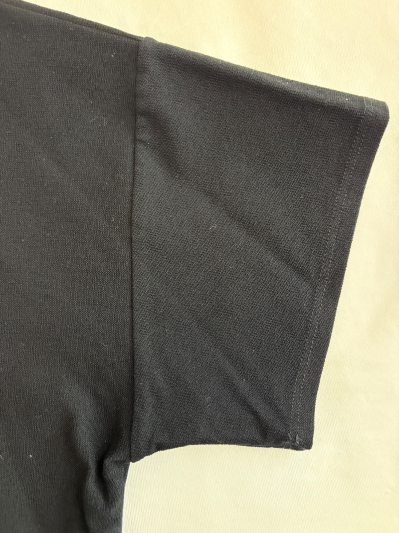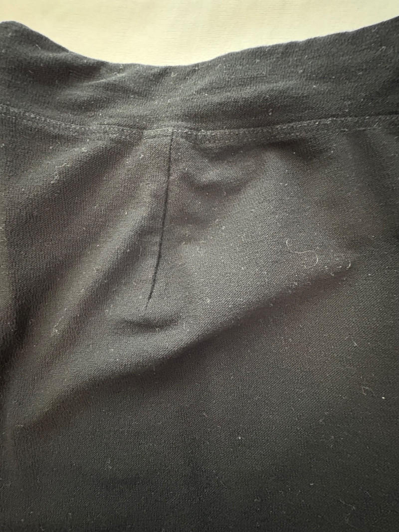 Basic black duo that can be dress up or down from Eileen Fisher. Both in 70% viscose with 24% nylon and 6% spandex.* Black tunic top (could also be worn as a dress) has curved neckline, short sleeves, and angled front patch pockets and a slight split hem. Stretchy heavy knit feel. In very good used condition. Measures 25.5" pit to pit and 35" from back neckline to back hemline. Size tag says L/G. Pants have elasticated flat waist, back darts, and narrow tapered legs for a very slim but comfortable fit - not quite leggings but the same feel in pants. In very good used condition. Measures 19.5" side to side at waist with 26" inseam. Size tag says XL. *Despite the photos variance, the pants and top are the same exact color & fabric.