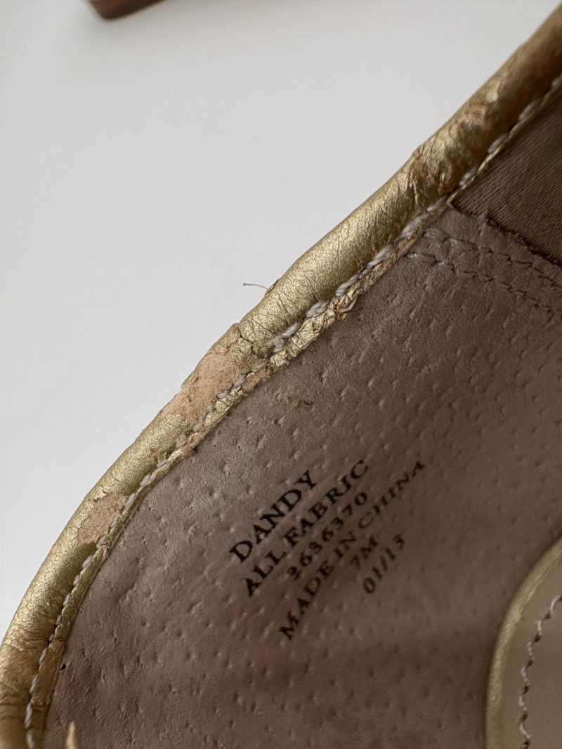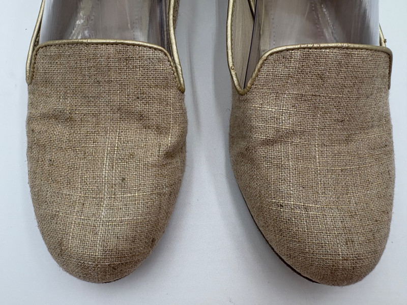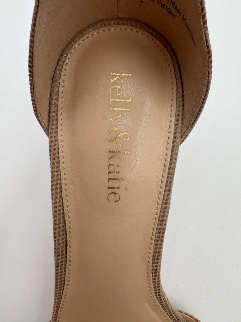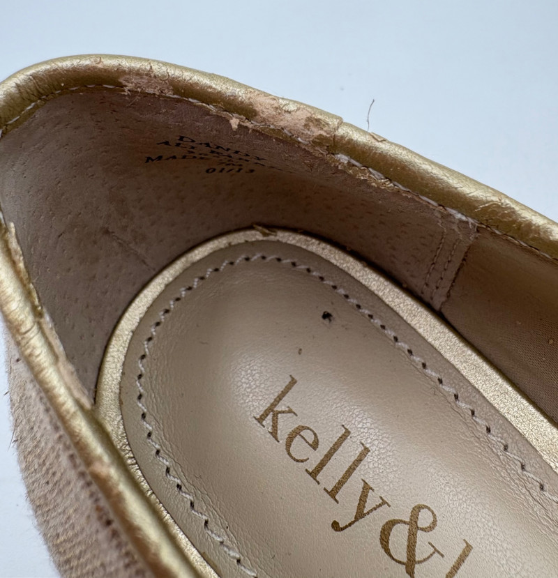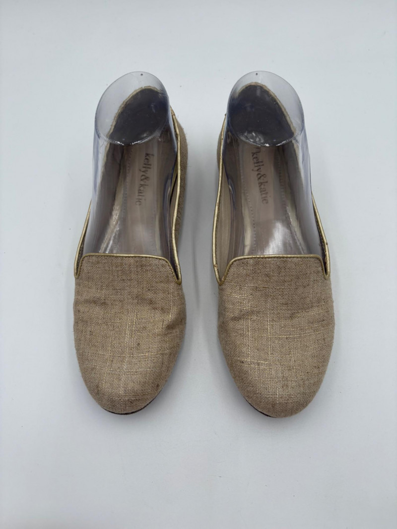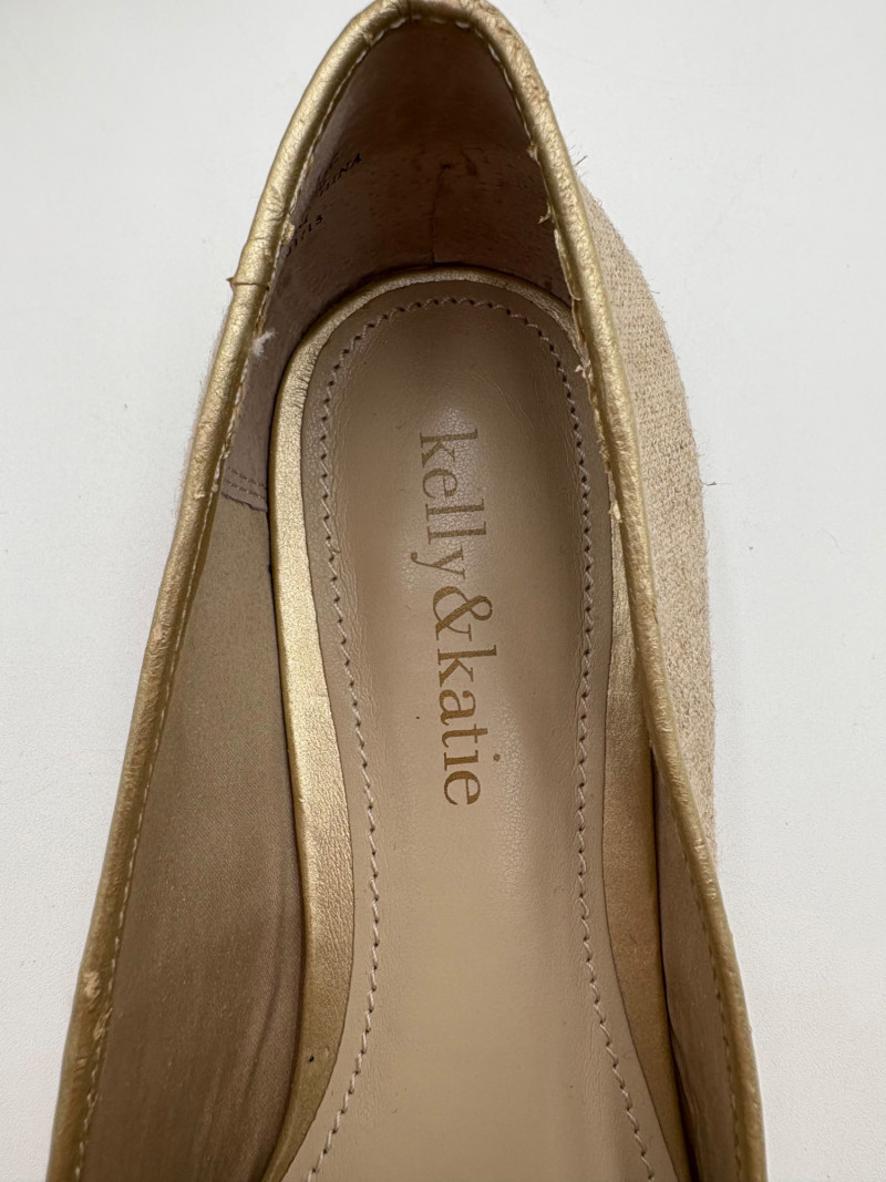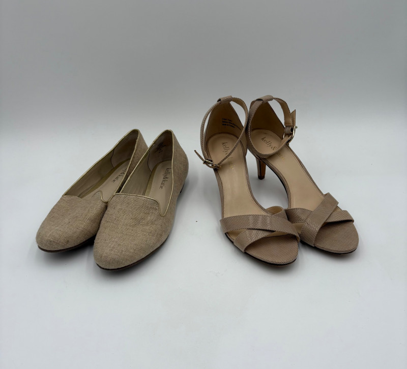 Two pairs of shoes from Kelly & Katie - both appear to have only been tried on/worn and are fabric rather than leather as noted on the materials label. Low flats have small stacked heel with rubber sole. Iridescent linen-type fabric uppers with gold piping around the foot opening. Please note that the piping at the back of the shoes is not in pristine shape, but looks fine when not in a close-up photo - see last photo in section. Strappy dress shoes have 2.5" heel, straps that crisscross vamp, an ankle buckle with gold hardware, and rubber sole. Both size 7