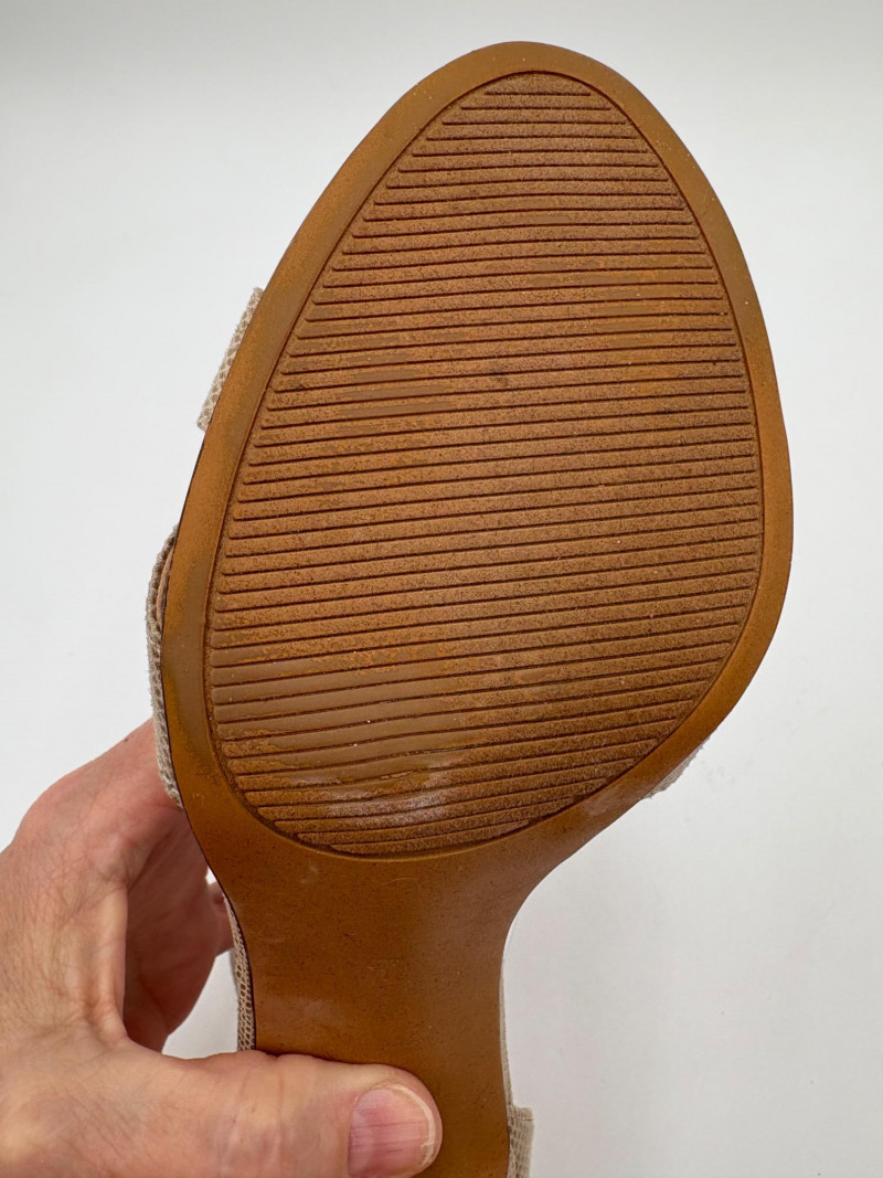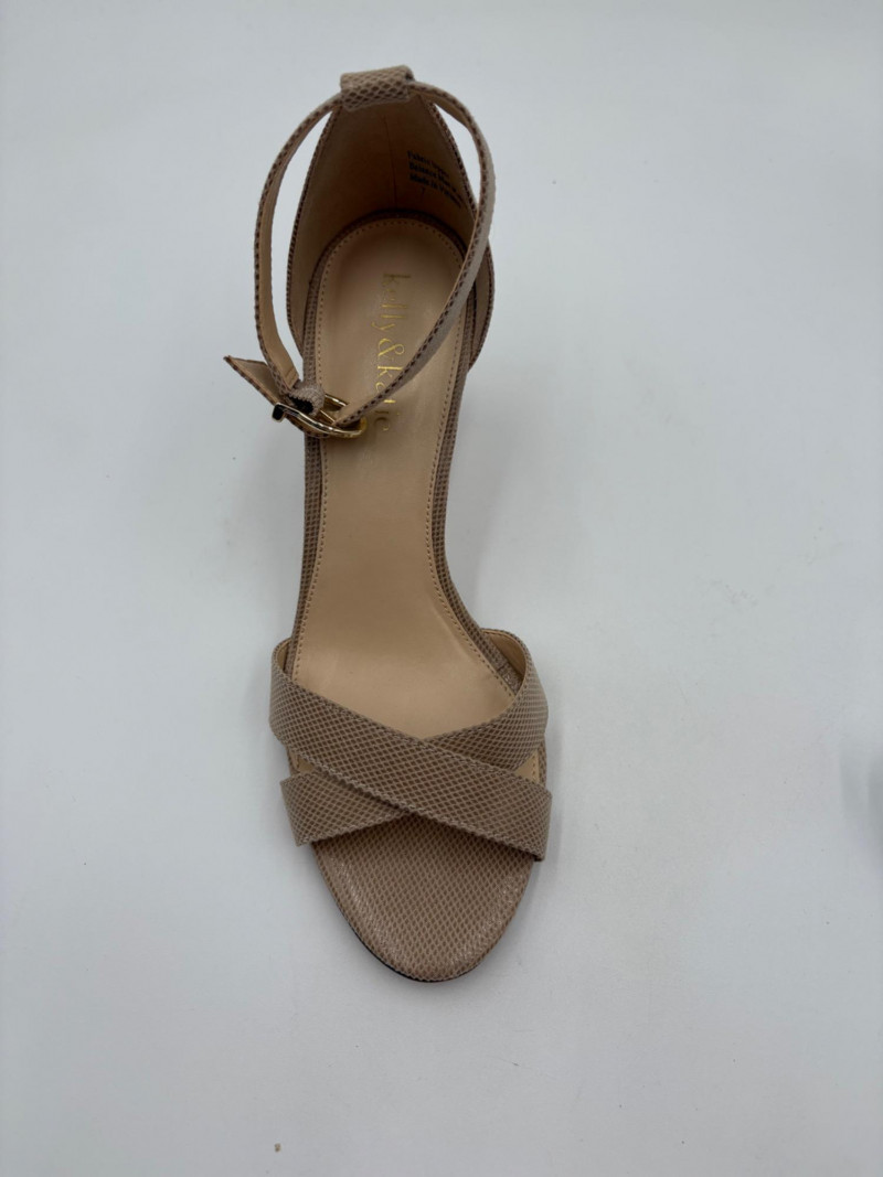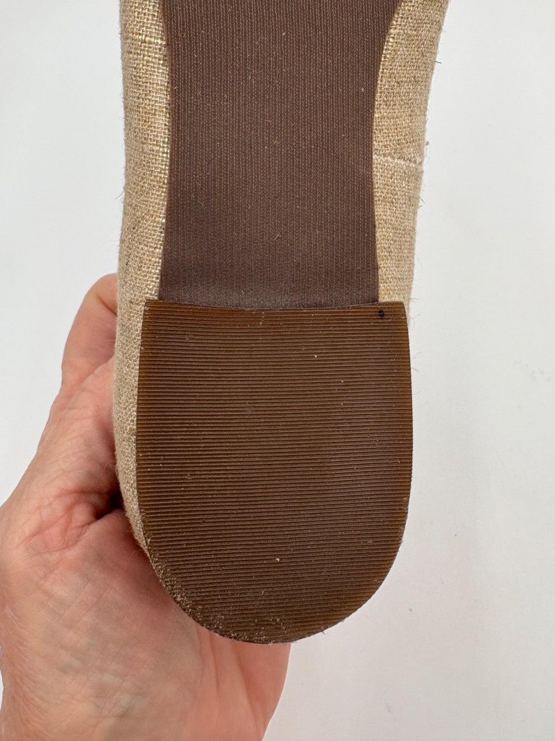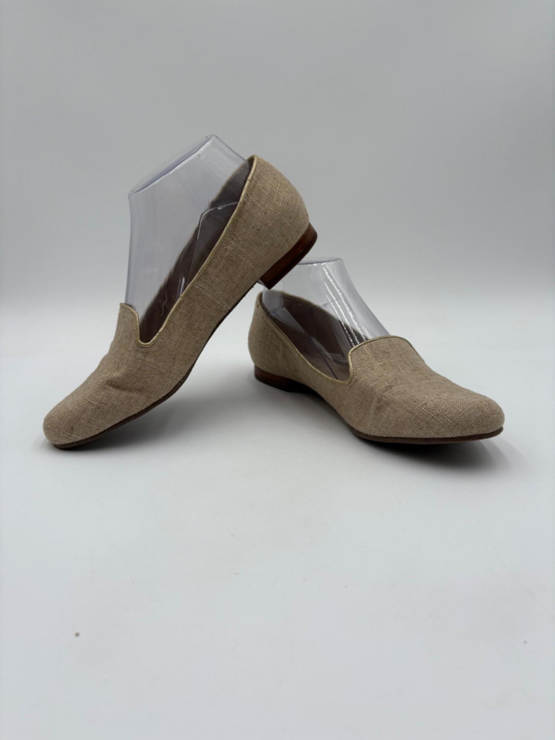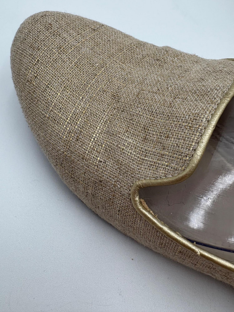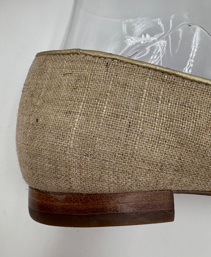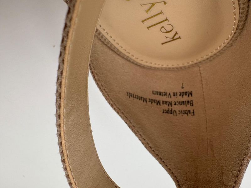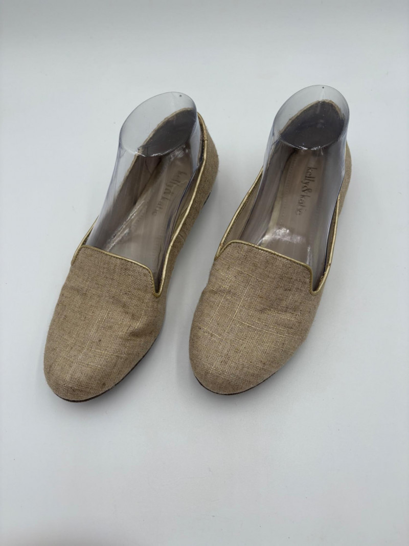 Two pairs of shoes from Kelly & Katie - both appear to have only been tried on/worn and are fabric rather than leather as noted on the materials label. Low flats have small stacked heel with rubber sole. Iridescent linen-type fabric uppers with gold piping around the foot opening. Please note that the piping at the back of the shoes is not in pristine shape, but looks fine when not in a close-up photo - see last photo in section. Strappy dress shoes have 2.5" heel, straps that crisscross vamp, an ankle buckle with gold hardware, and rubber sole. Both size 7