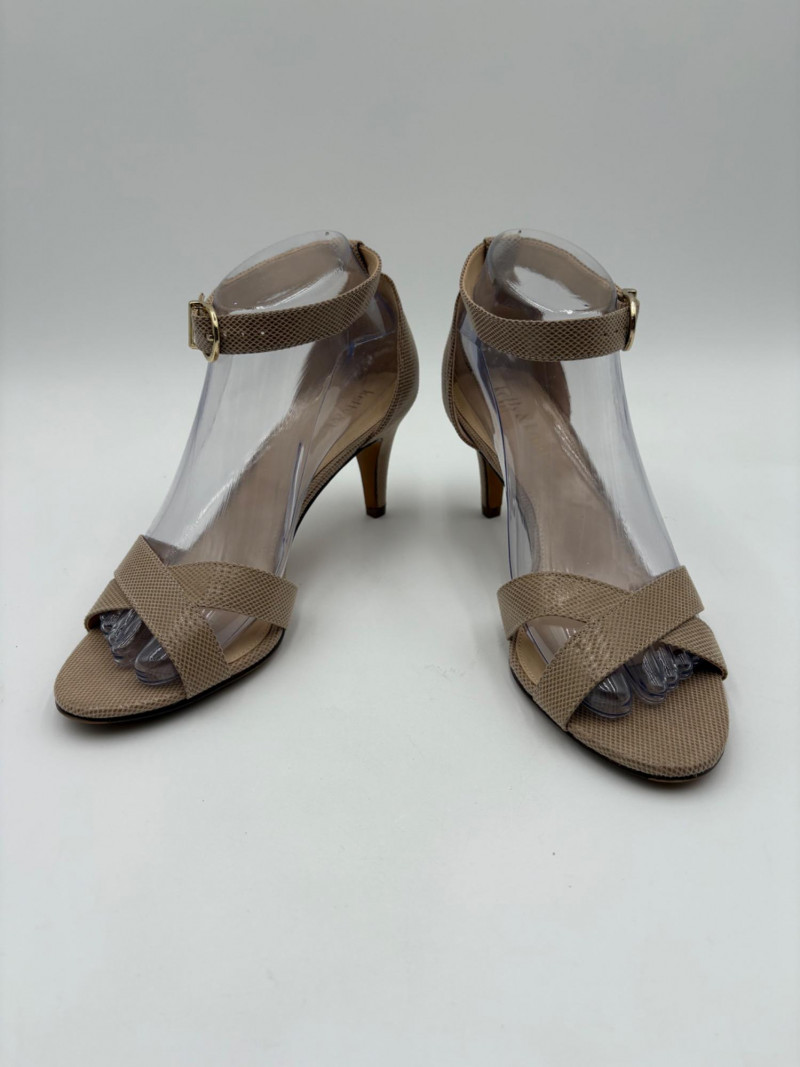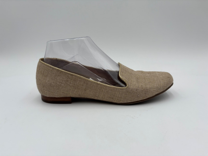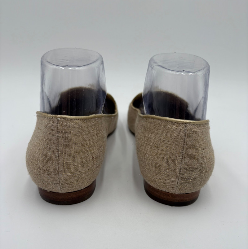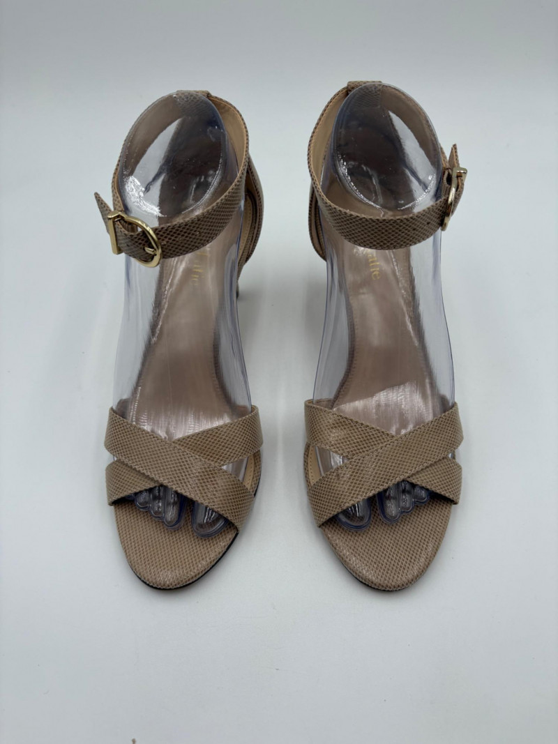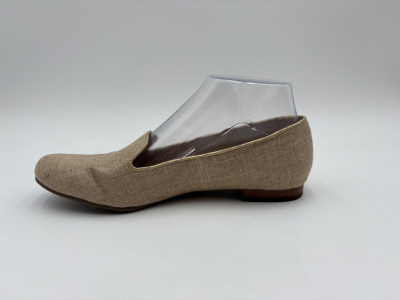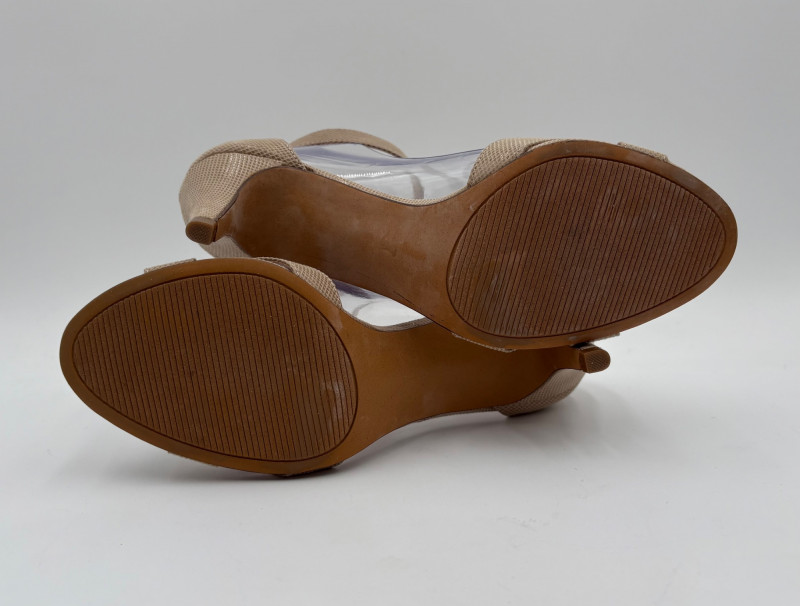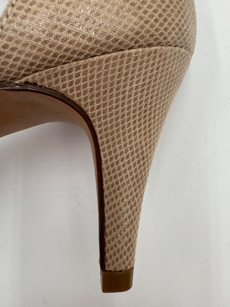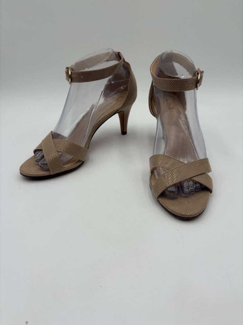 Two pairs of shoes from Kelly & Katie - both appear to have only been tried on/worn and are fabric rather than leather as noted on the materials label. Low flats have small stacked heel with rubber sole. Iridescent linen-type fabric uppers with gold piping around the foot opening. Please note that the piping at the back of the shoes is not in pristine shape, but looks fine when not in a close-up photo - see last photo in section. Strappy dress shoes have 2.5" heel, straps that crisscross vamp, an ankle buckle with gold hardware, and rubber sole. Both size 7