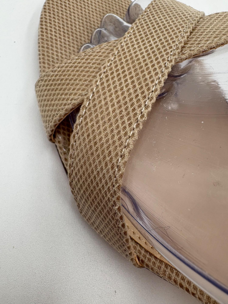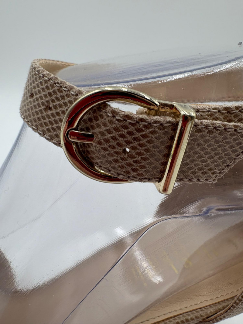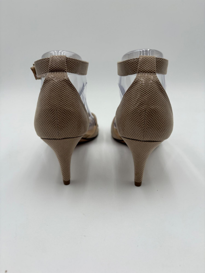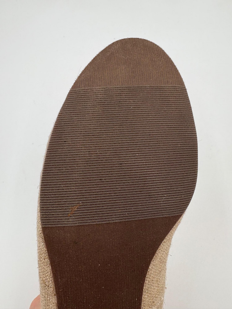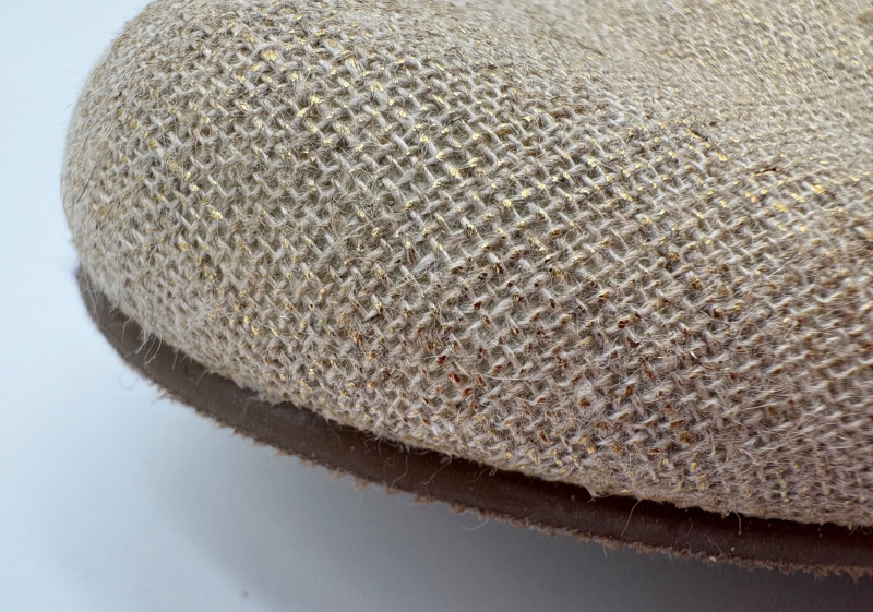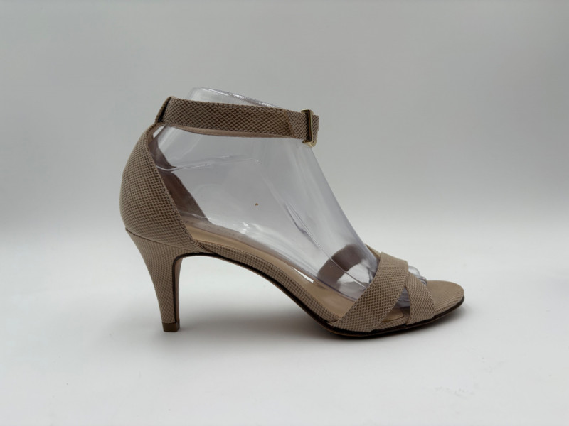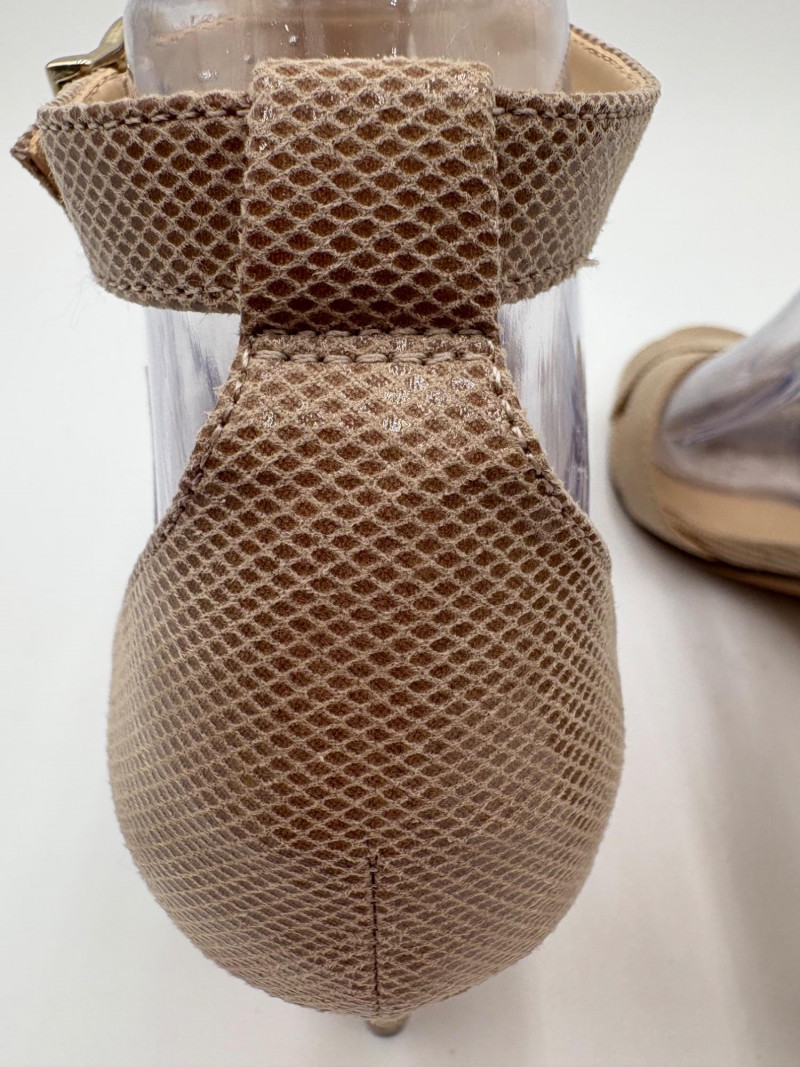 Two pairs of shoes from Kelly & Katie - both appear to have only been tried on/worn and are fabric rather than leather as noted on the materials label. Low flats have small stacked heel with rubber sole. Iridescent linen-type fabric uppers with gold piping around the foot opening. Please note that the piping at the back of the shoes is not in pristine shape, but looks fine when not in a close-up photo - see last photo in section. Strappy dress shoes have 2.5" heel, straps that crisscross vamp, an ankle buckle with gold hardware, and rubber sole. Both size 7