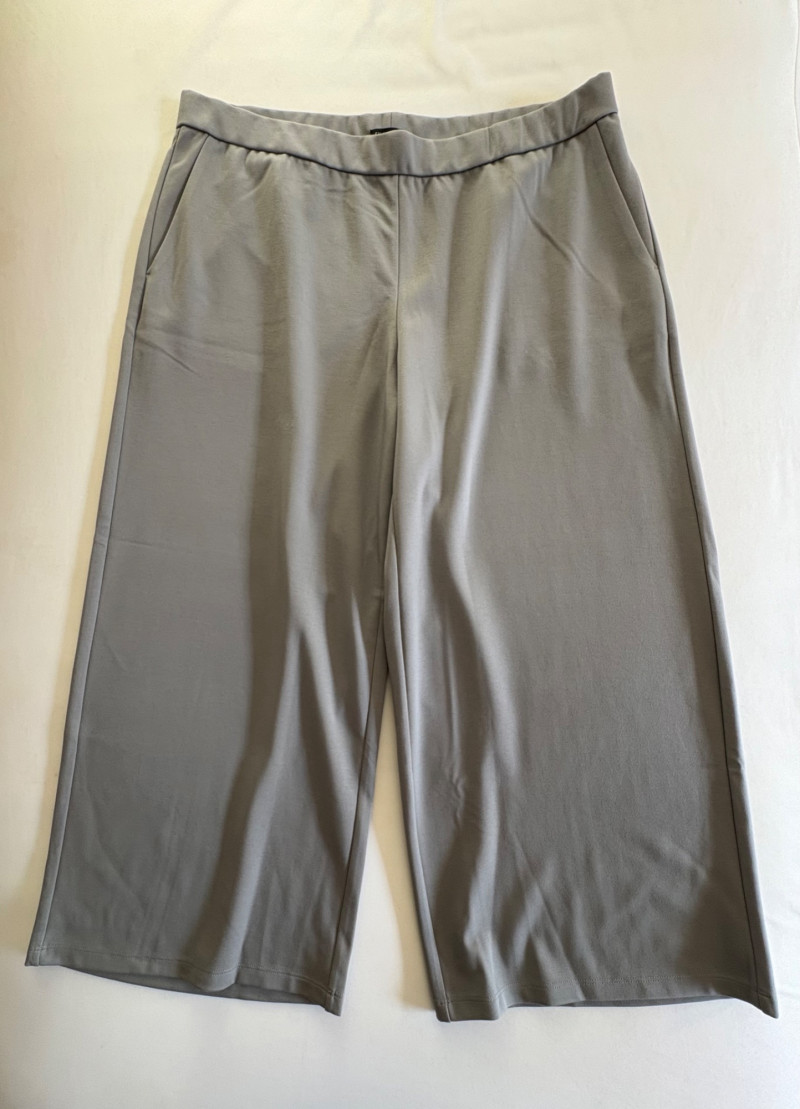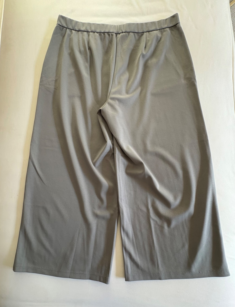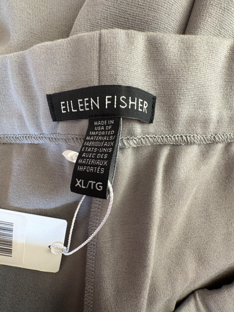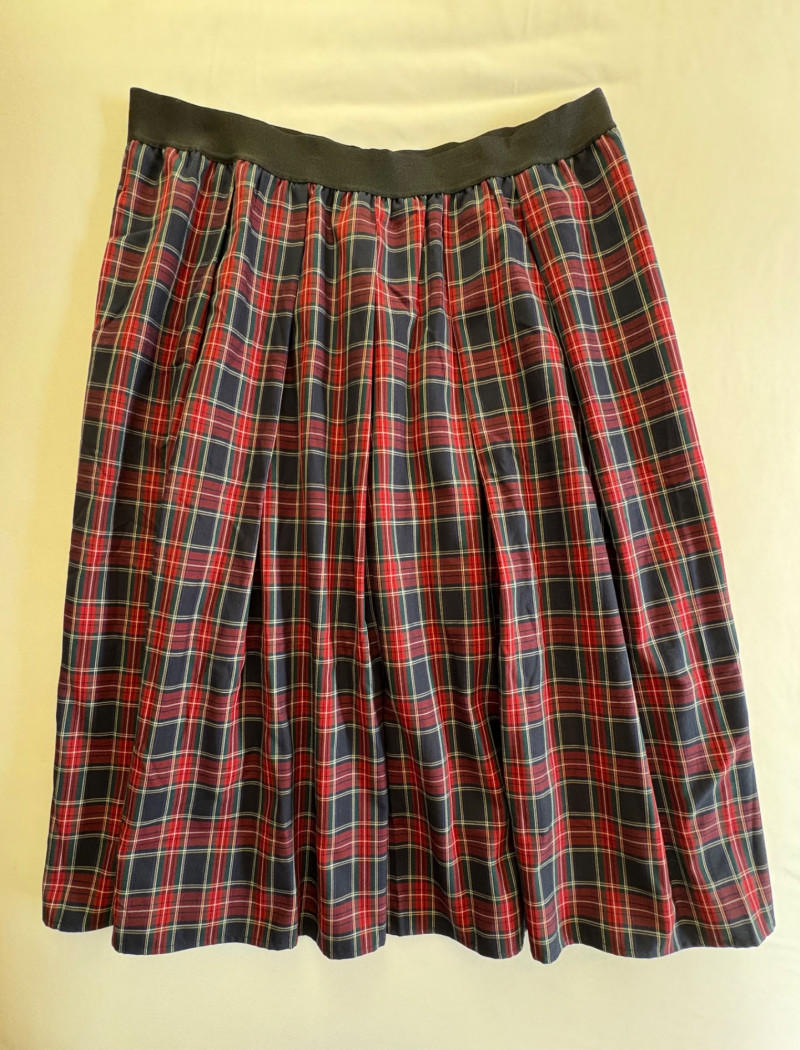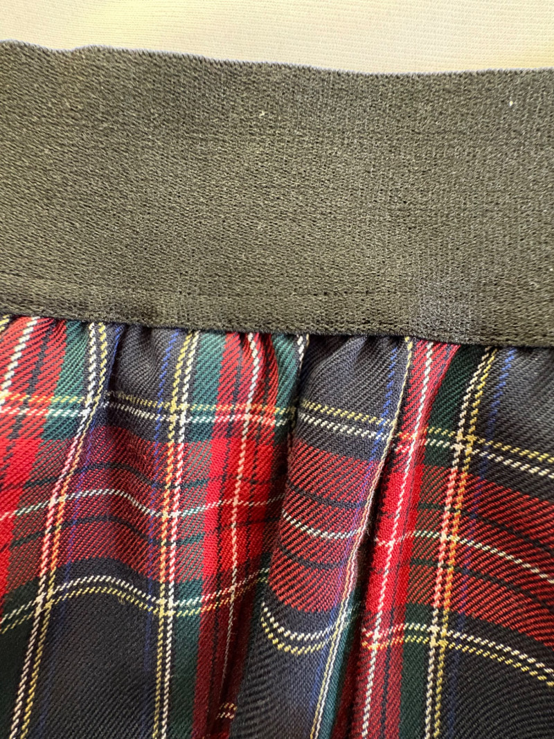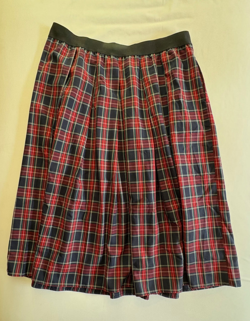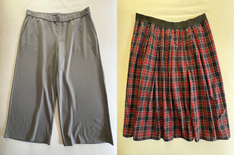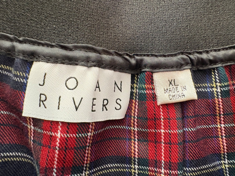 Grey slacks from Eileen Fisher & skirt from Joan Rivers. Smooth grey knit slacks from Eileen Fisher have flat elasticated waistband, wide legs, back hip darts, and set-in front side pockets. New with tag but we did notice a slight rubbed area (from storage?) on right thigh - see last photo. 71% Lyocell and 19% nylon with 10% elastane, Measures 19" side to side at waist with 25.5" inseam. Size tag says XL. Plaid skirt from Joan Rivers in predominantly black, red, and white with a little bit of green and yellow. Black elastic waistband has pleats & light gathering along with side in-seam pockets. In very good condition. 65% polyester with 35% rayon. Measures 19" side to side at waist and 32" from waistband to bottom hem. Size tag says XL.