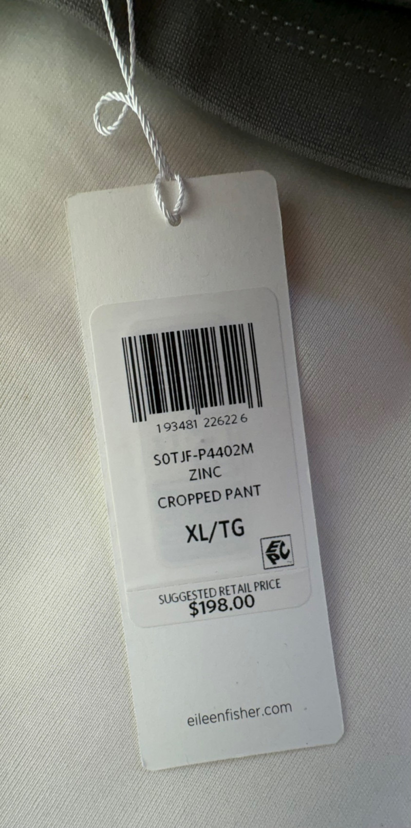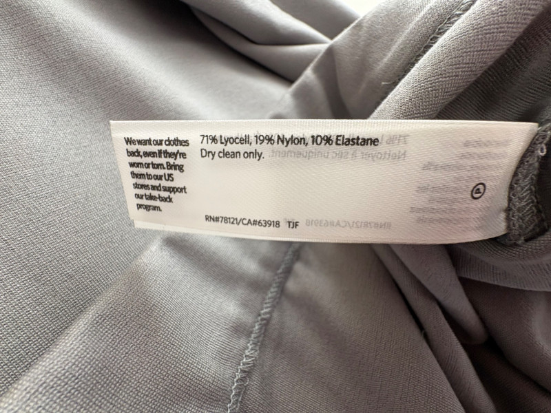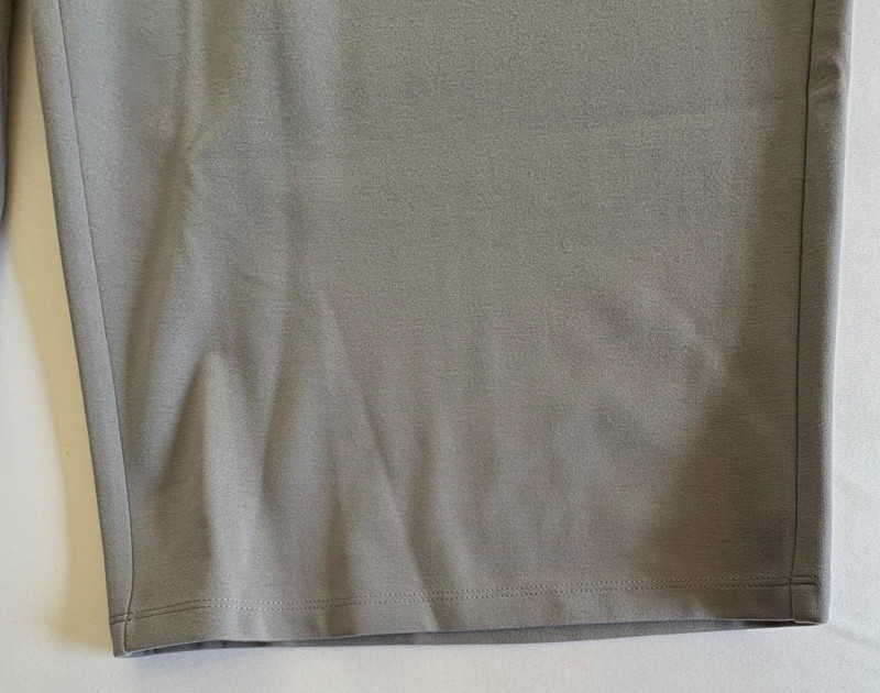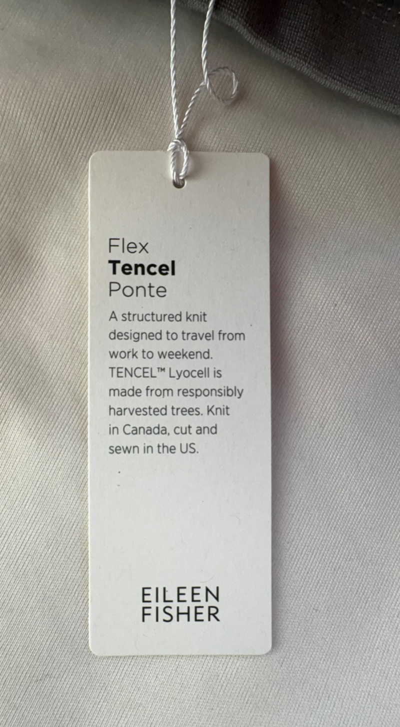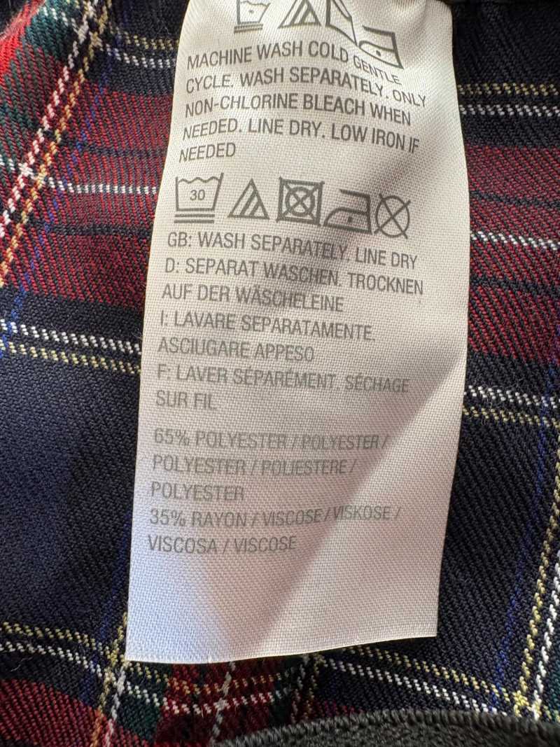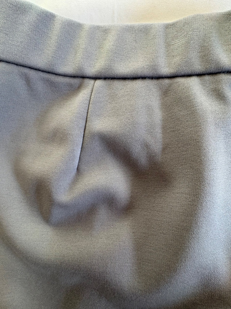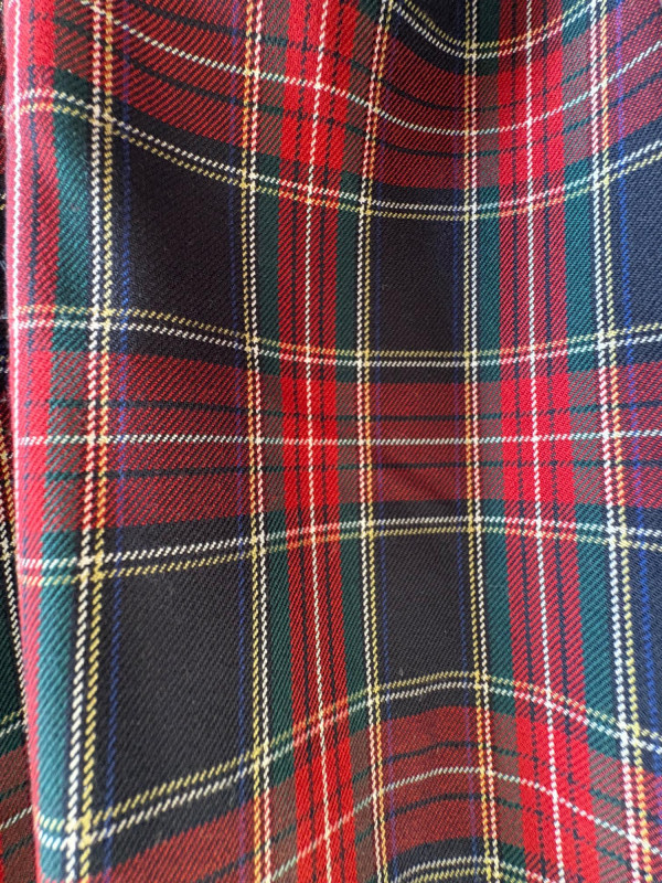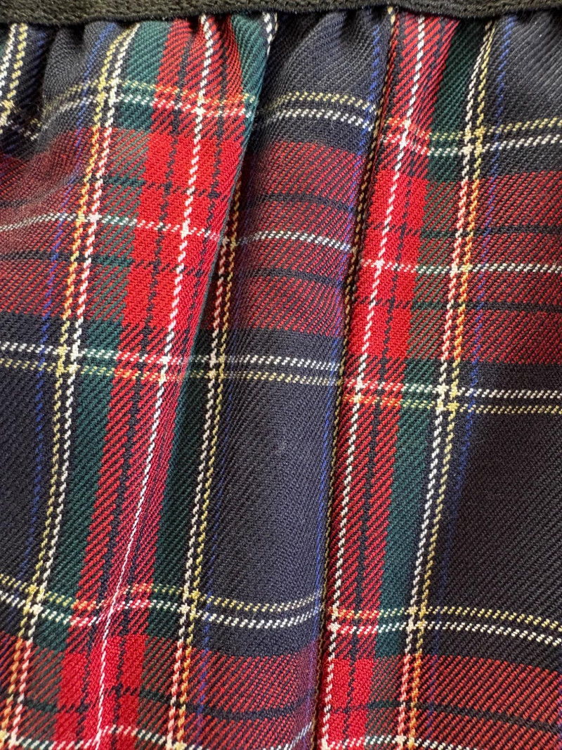 Grey slacks from Eileen Fisher & skirt from Joan Rivers. Smooth grey knit slacks from Eileen Fisher have flat elasticated waistband, wide legs, back hip darts, and set-in front side pockets. New with tag but we did notice a slight rubbed area (from storage?) on right thigh - see last photo. 71% Lyocell and 19% nylon with 10% elastane, Measures 19" side to side at waist with 25.5" inseam. Size tag says XL. Plaid skirt from Joan Rivers in predominantly black, red, and white with a little bit of green and yellow. Black elastic waistband has pleats & light gathering along with side in-seam pockets. In very good condition. 65% polyester with 35% rayon. Measures 19" side to side at waist and 32" from waistband to bottom hem. Size tag says XL.