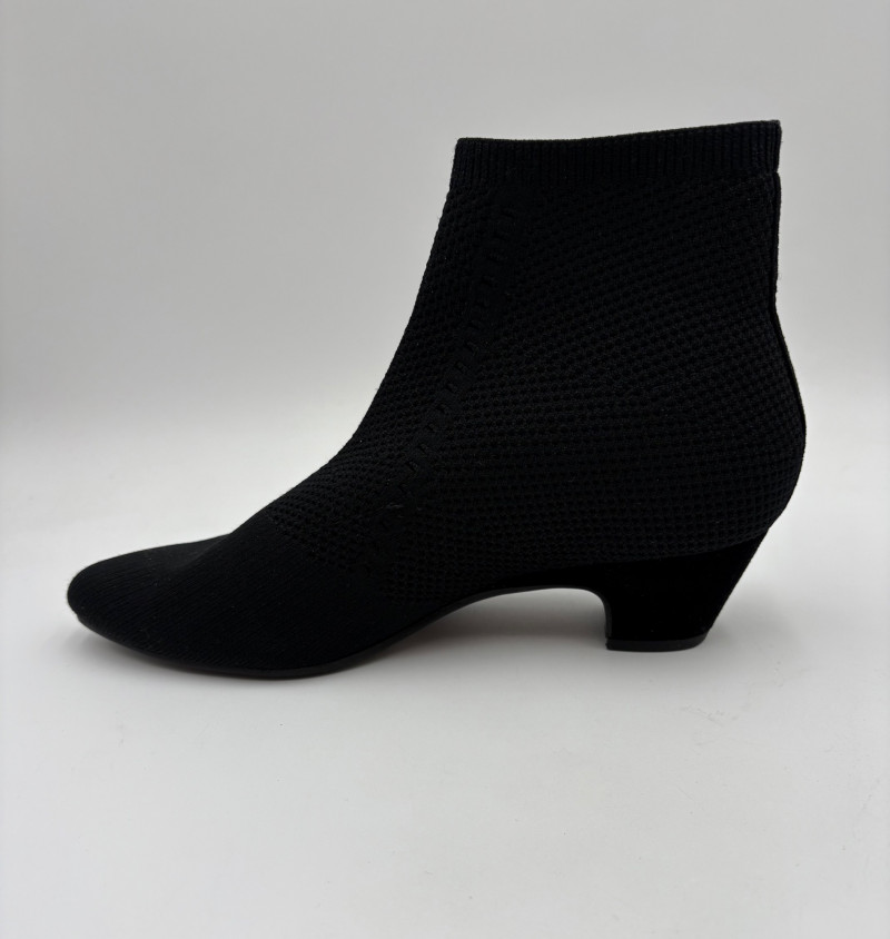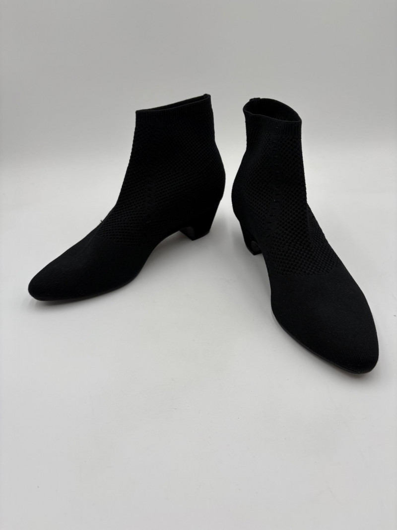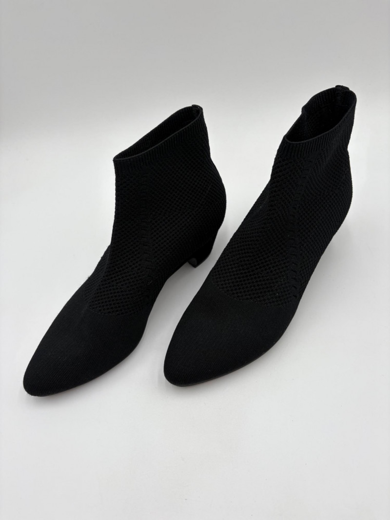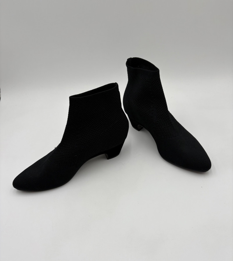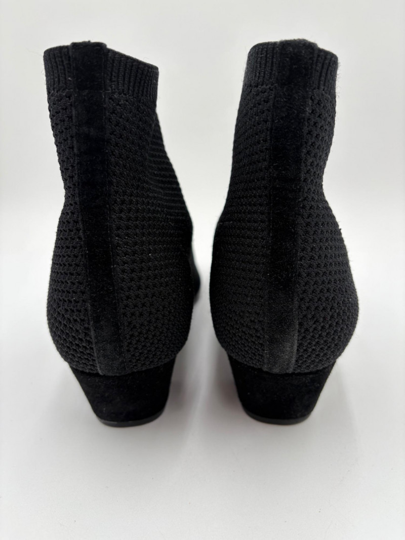 Understated black stretch fabric ankle boots from Eileen Fisher. Semi-pointed toe, solid fabric through the toe box, and knit weave on the remainder of the upper. Black suede-covered 1.75" heel with suede strip up the back of the foot. In terrific condition. Leather sole with non-slip insert. Size 7.5