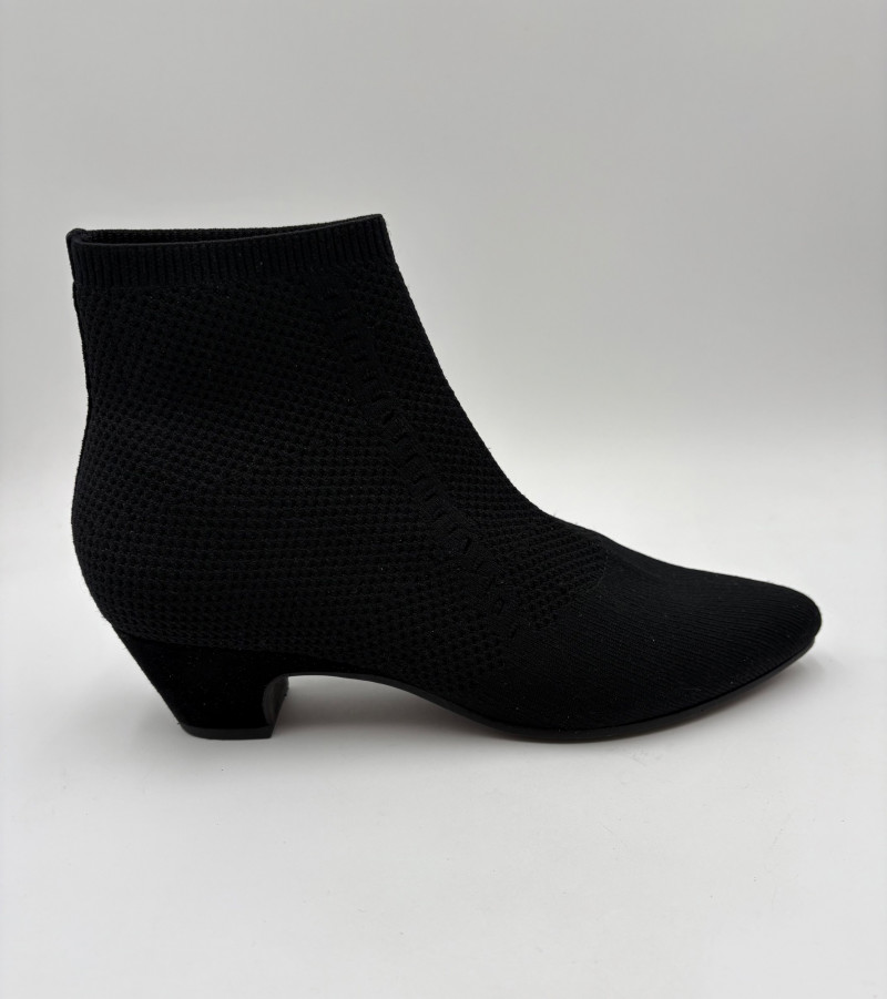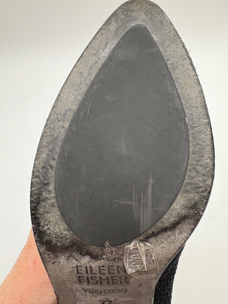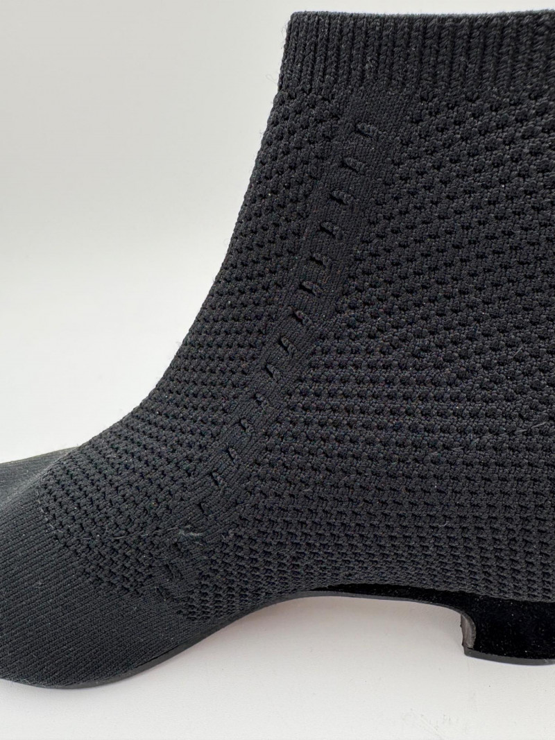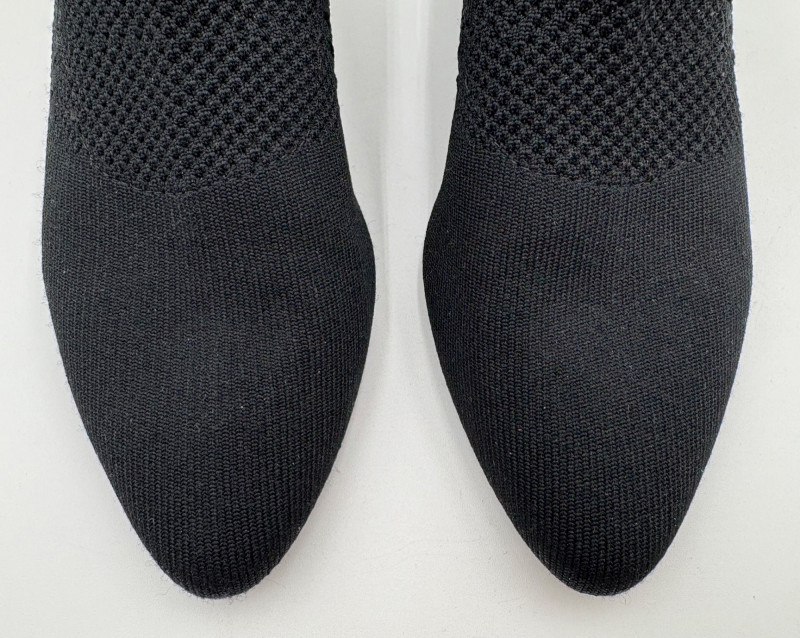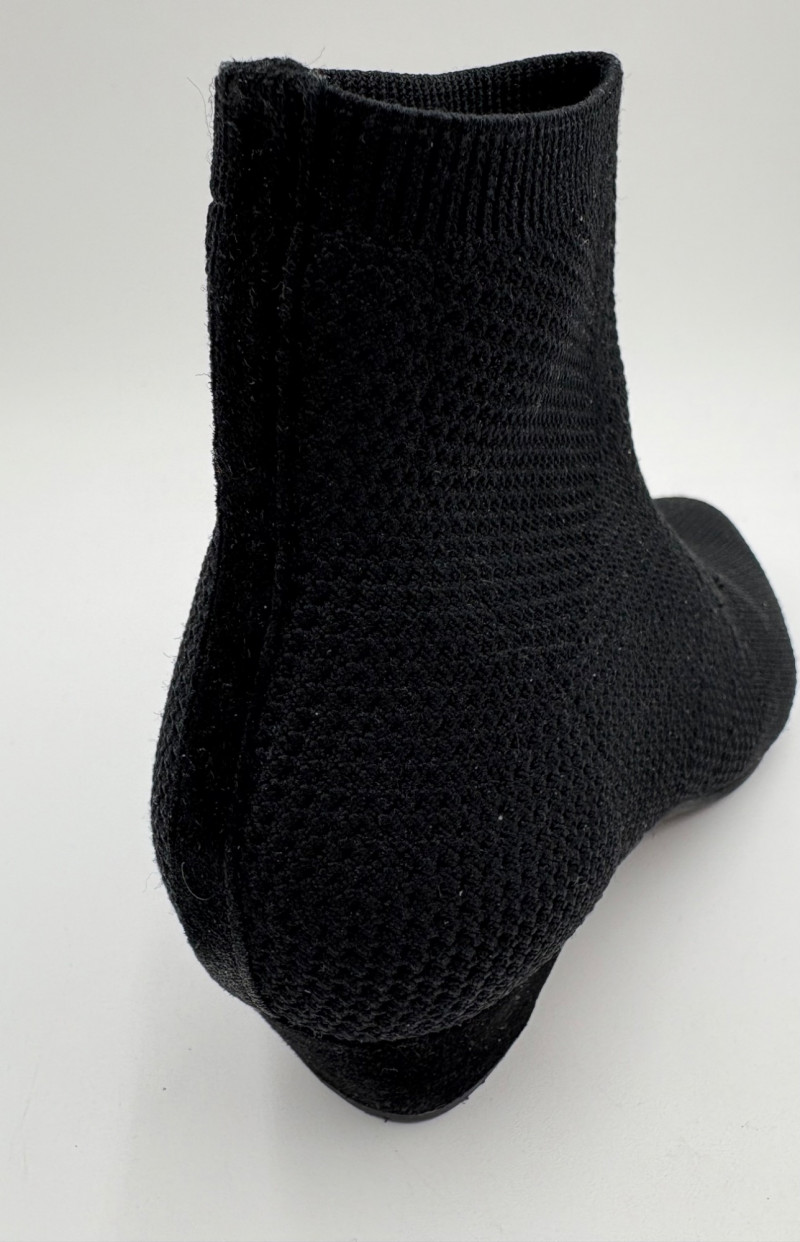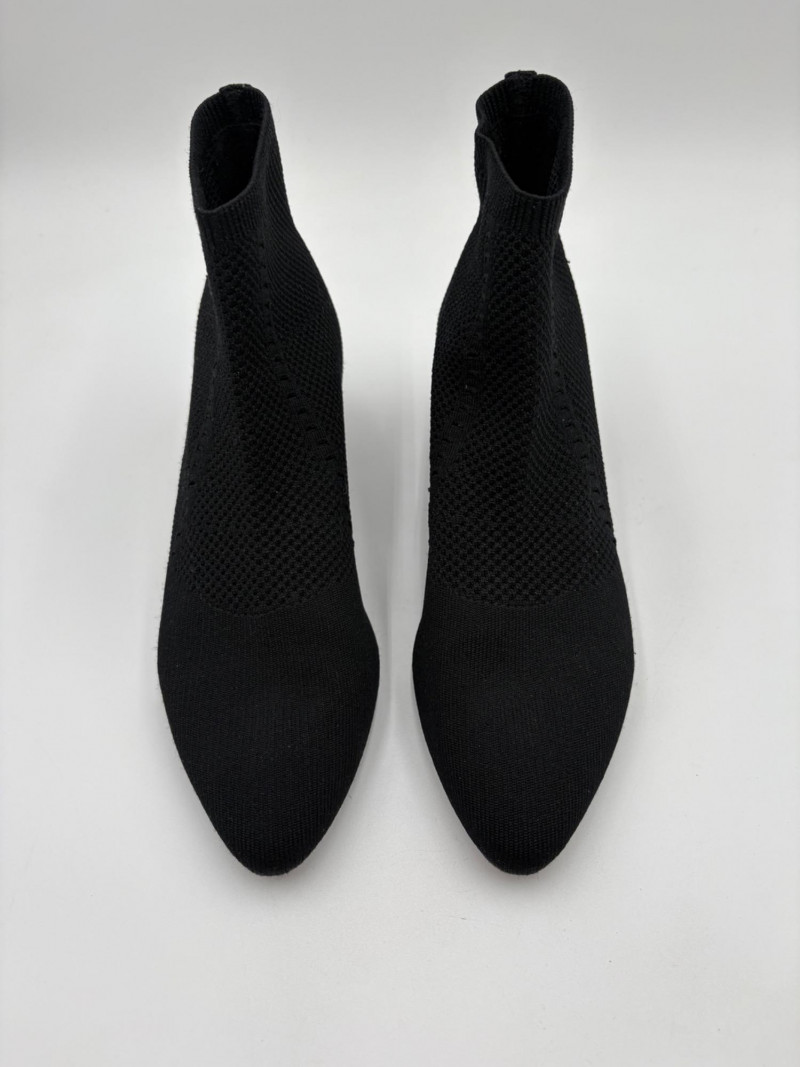 Understated black stretch fabric ankle boots from Eileen Fisher. Semi-pointed toe, solid fabric through the toe box, and knit weave on the remainder of the upper. Black suede-covered 1.75" heel with suede strip up the back of the foot. In terrific condition. Leather sole with non-slip insert. Size 7.5