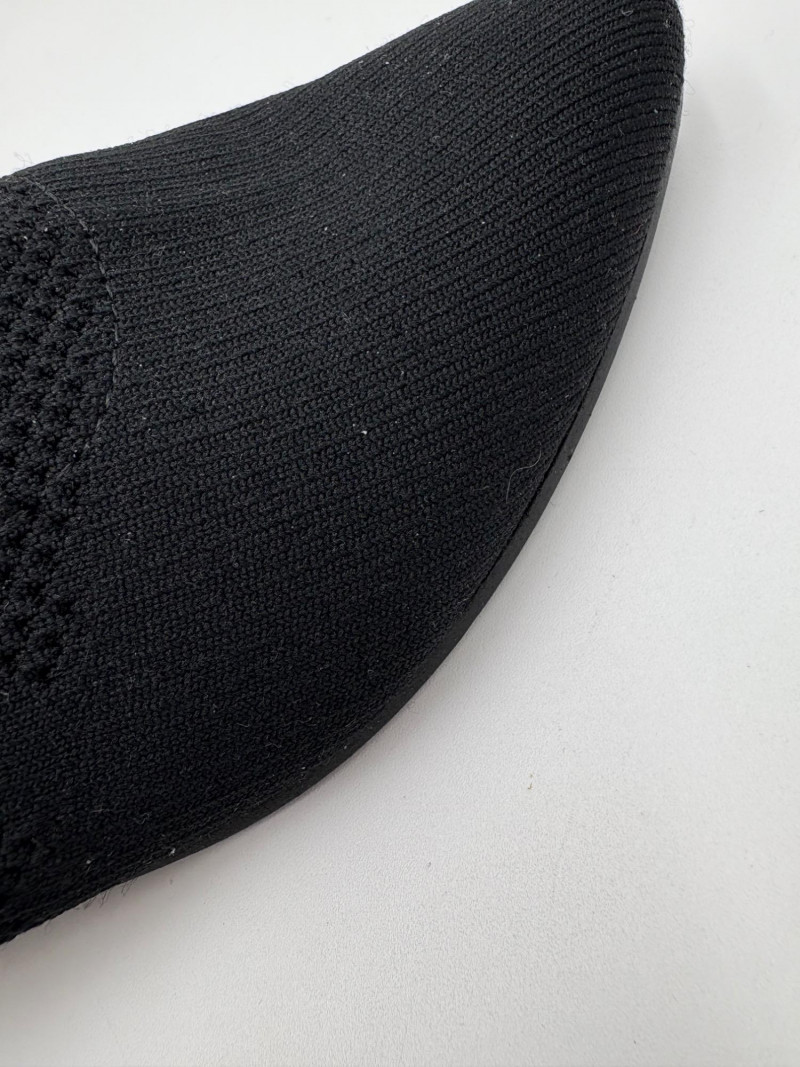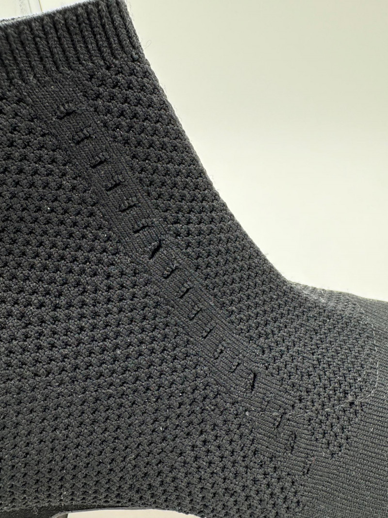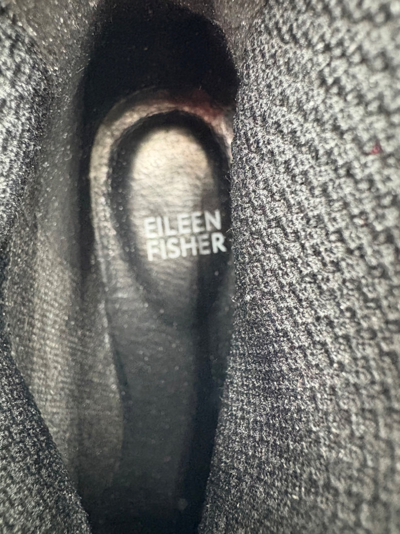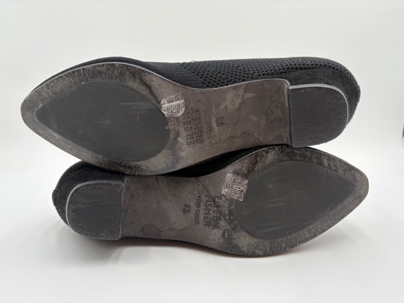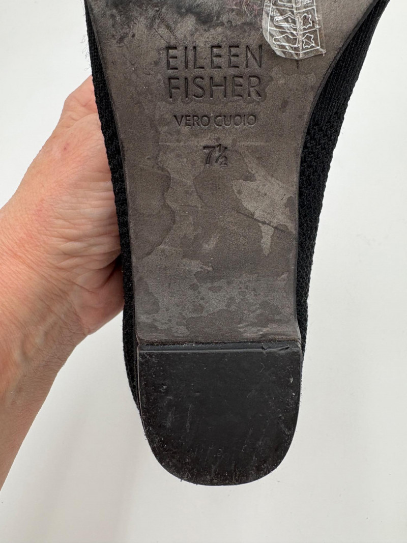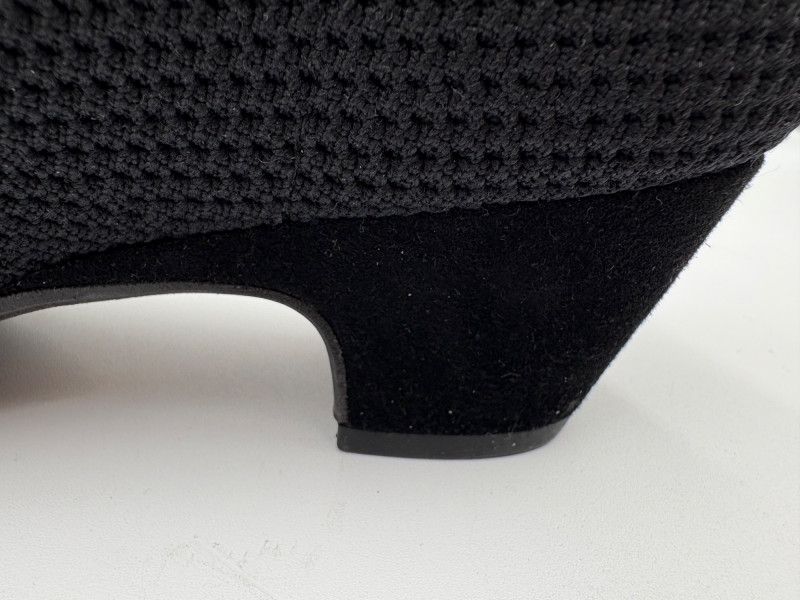 Understated black stretch fabric ankle boots from Eileen Fisher. Semi-pointed toe, solid fabric through the toe box, and knit weave on the remainder of the upper. Black suede-covered 1.75" heel with suede strip up the back of the foot. In terrific condition. Leather sole with non-slip insert. Size 7.5