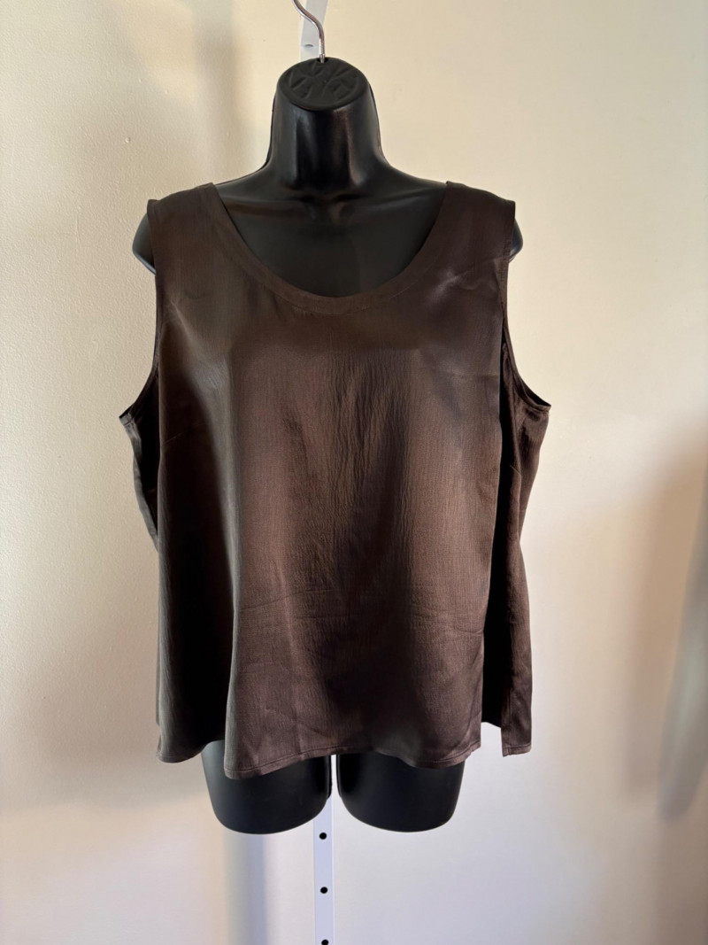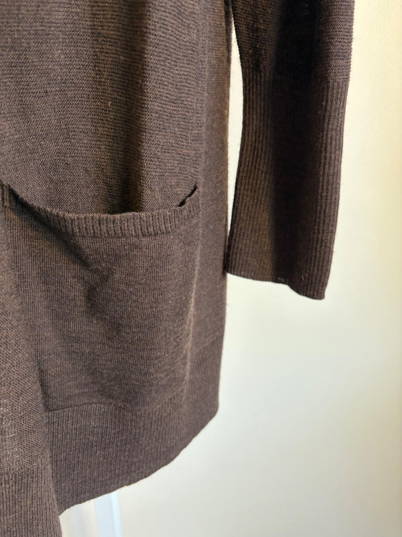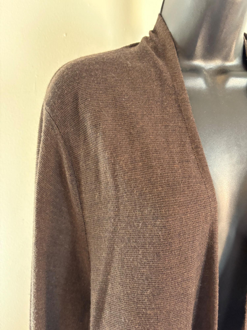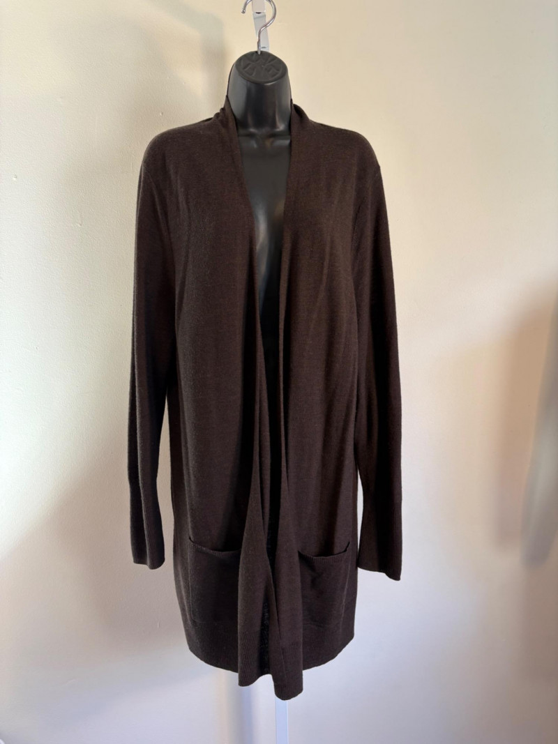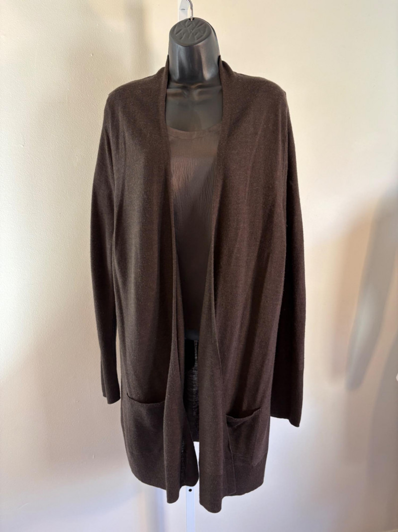 Beautiful dark brown tank and long cardigan from Eileen Fisher. Great texture combo in the same rich hue. Scoop tank has top-stitching around neckline, armholes, and split hem in addition to bust darts. 100% silk. In excellent condition. Measures 22.5" pit to pit and 23" from back of neckline to bottom of hem. Size tag says 1X. Matching cardigan in the same shade of brown is long - coming to mid-thigh or longer with an open front. patch pockets, and ribbing on sleeve cuffs/hem. Very light weave of 100% merino wool. In excellent condition. Measures 22.5" pit to pit and 38" from back neckline to bottom hem. Size tag says XL