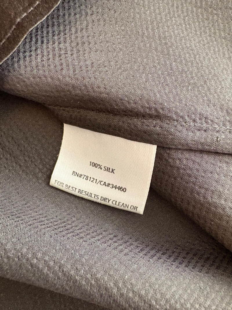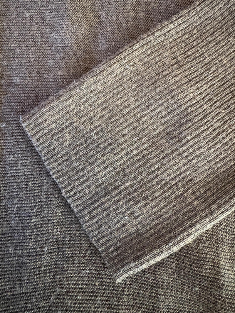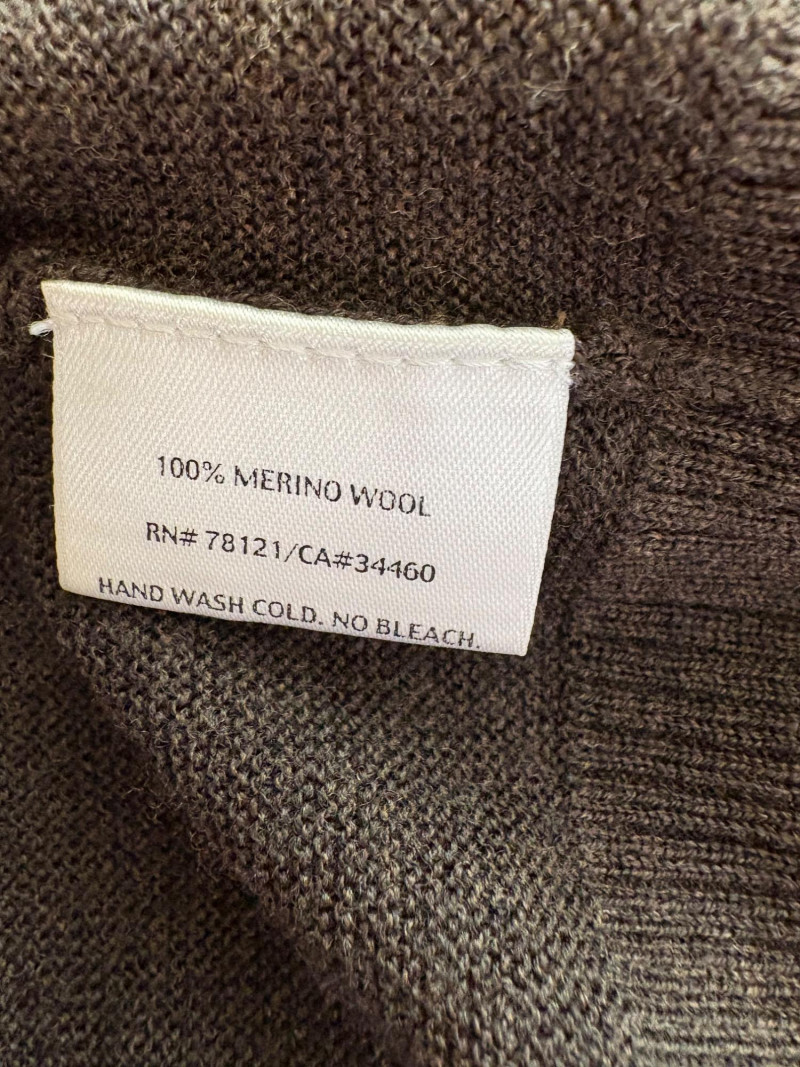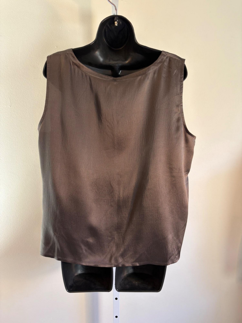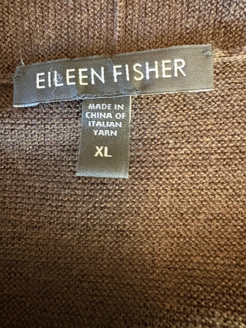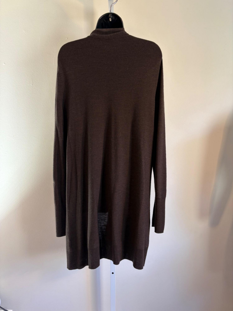 Beautiful dark brown tank and long cardigan from Eileen Fisher. Great texture combo in the same rich hue. Scoop tank has top-stitching around neckline, armholes, and split hem in addition to bust darts. 100% silk. In excellent condition. Measures 22.5" pit to pit and 23" from back of neckline to bottom of hem. Size tag says 1X. Matching cardigan in the same shade of brown is long - coming to mid-thigh or longer with an open front. patch pockets, and ribbing on sleeve cuffs/hem. Very light weave of 100% merino wool. In excellent condition. Measures 22.5" pit to pit and 38" from back neckline to bottom hem. Size tag says XL