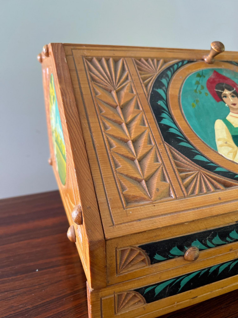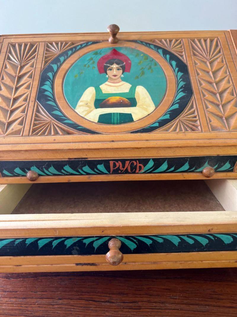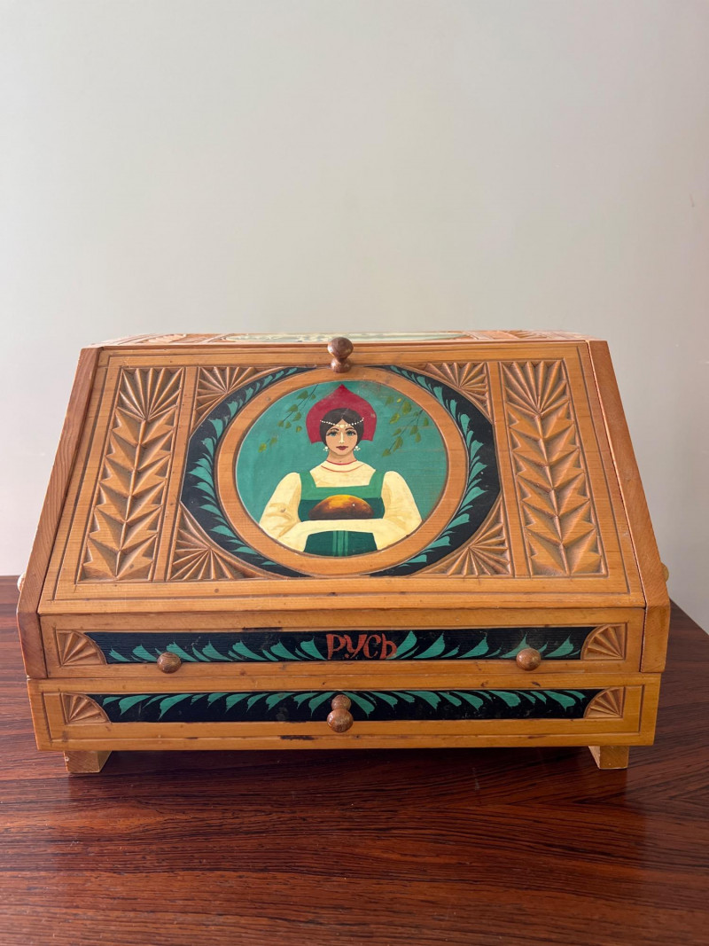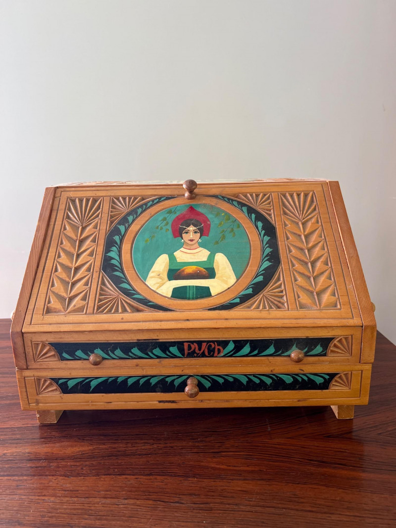 This charming hand-painted wooden chest features intricate carvings and vibrant folk art, showcasing a traditional Russian woman holding a loaf of bread, symbolizing hospitality. The chest is adorned with carved geometric patterns and vivid side panel paintings of birch trees and countryside scenery. The word "РУСЬ" (Rus’) is inscribed on the front, evoking Old Russia. Material: Wood Design: Slanted lid with a lift-up top, two drawers below Details: Hand-painted panels on front, sides, and top