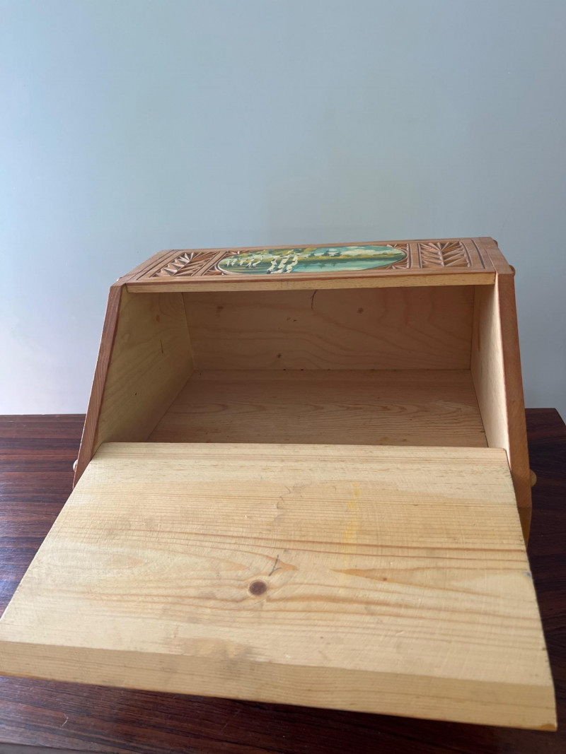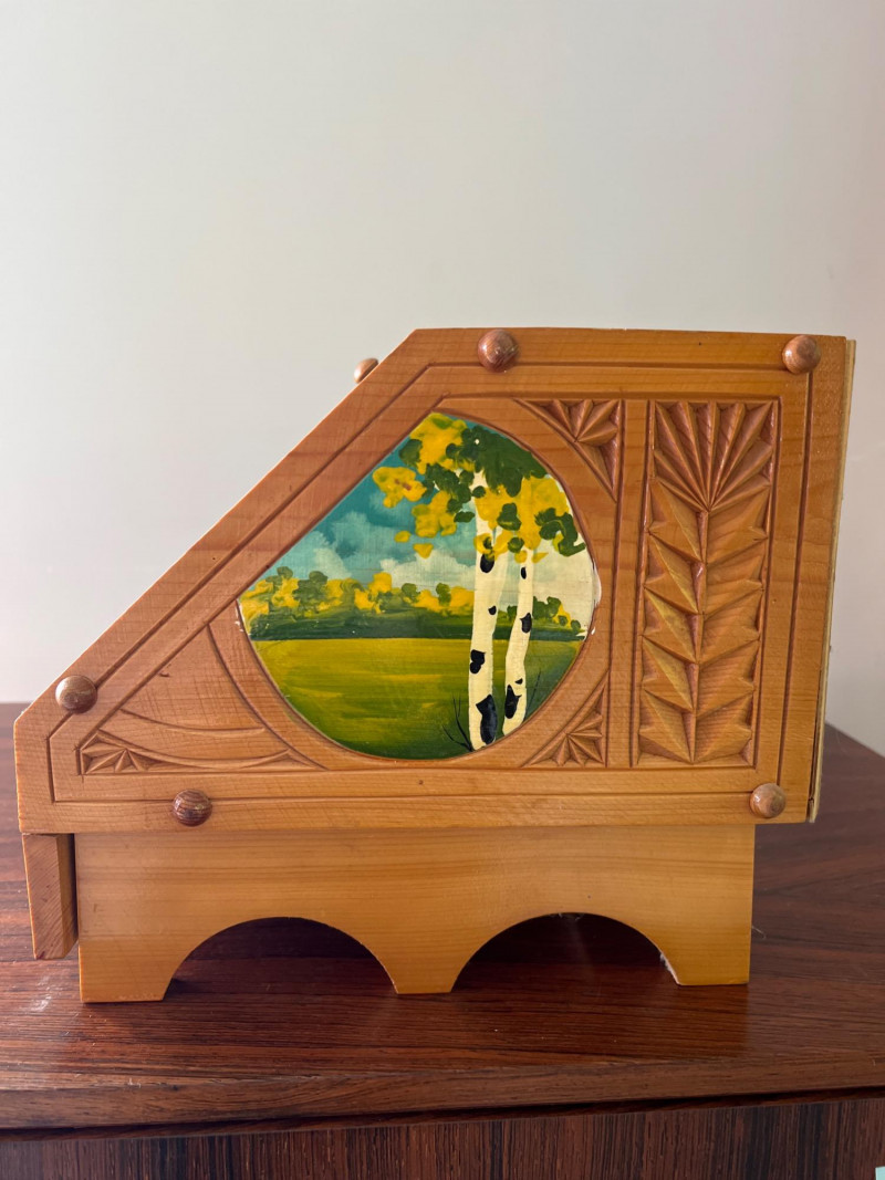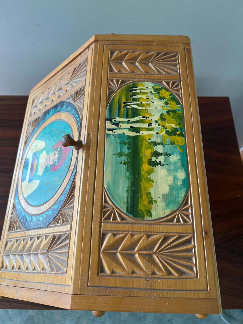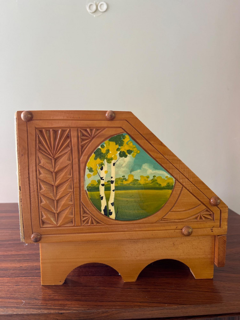 This charming hand-painted wooden chest features intricate carvings and vibrant folk art, showcasing a traditional Russian woman holding a loaf of bread, symbolizing hospitality. The chest is adorned with carved geometric patterns and vivid side panel paintings of birch trees and countryside scenery. The word "РУСЬ" (Rus’) is inscribed on the front, evoking Old Russia. Material: Wood Design: Slanted lid with a lift-up top, two drawers below Details: Hand-painted panels on front, sides, and top