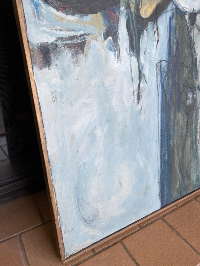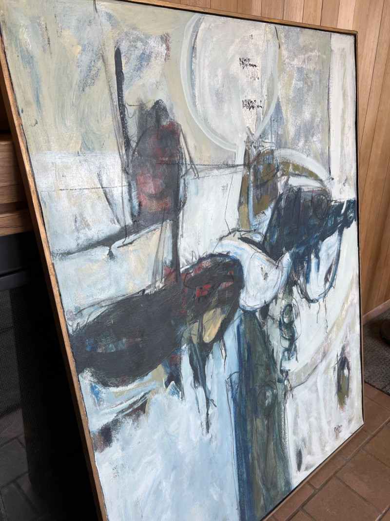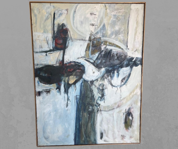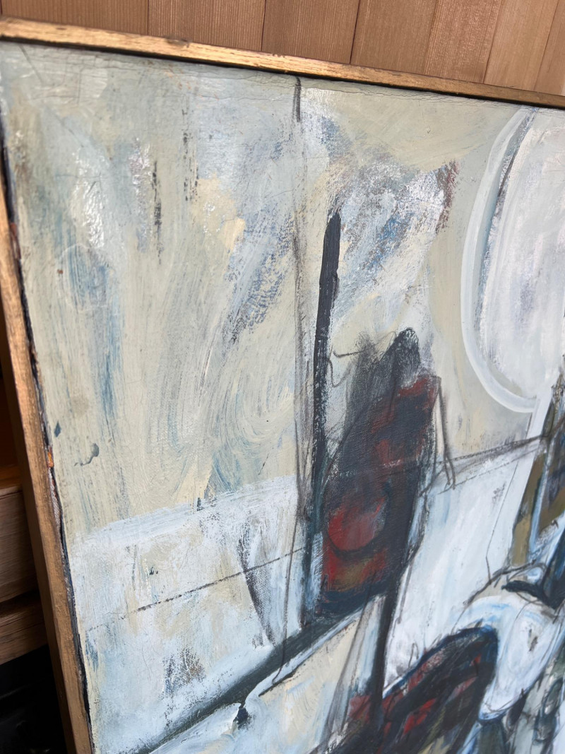 This expressive oil on canvas features a dynamic abstract composition, blending bold brushstrokes and a rich palette of blues, whites, blacks, and reds. The central figure or object is surrounded by fluid textures and surreal shapes, evoking a sense of movement and emotion. Inspired by Expressionism and Surrealism, the piece prioritizes mood and concept over realistic representation. Signed by the artist.