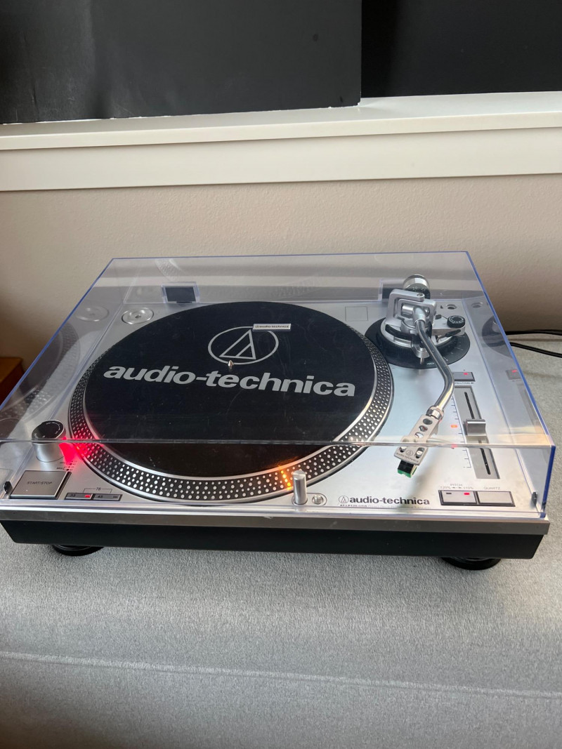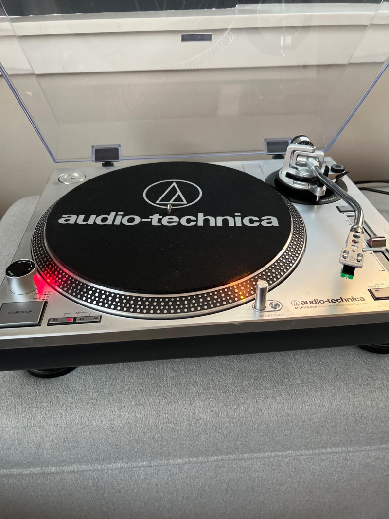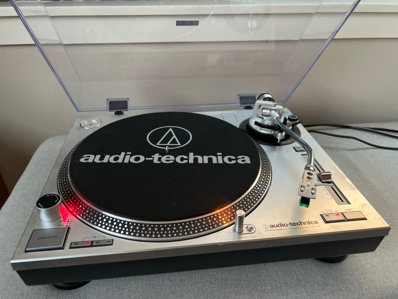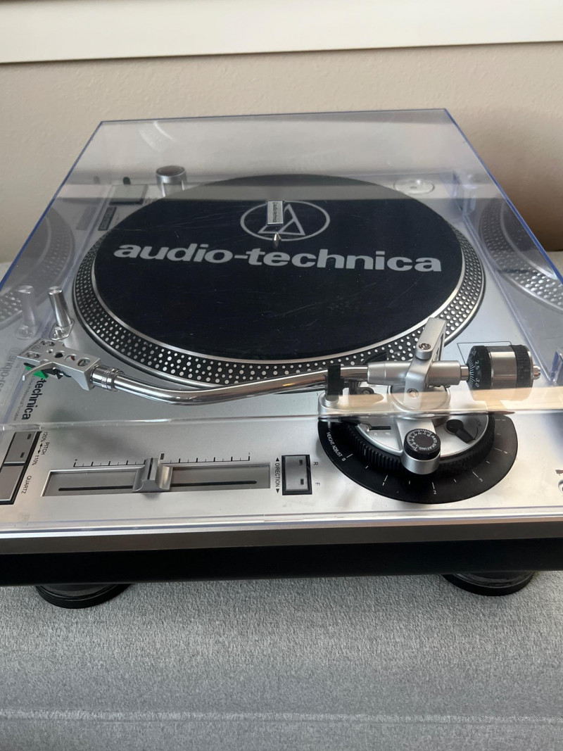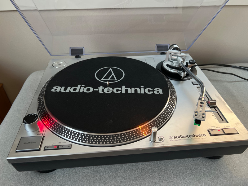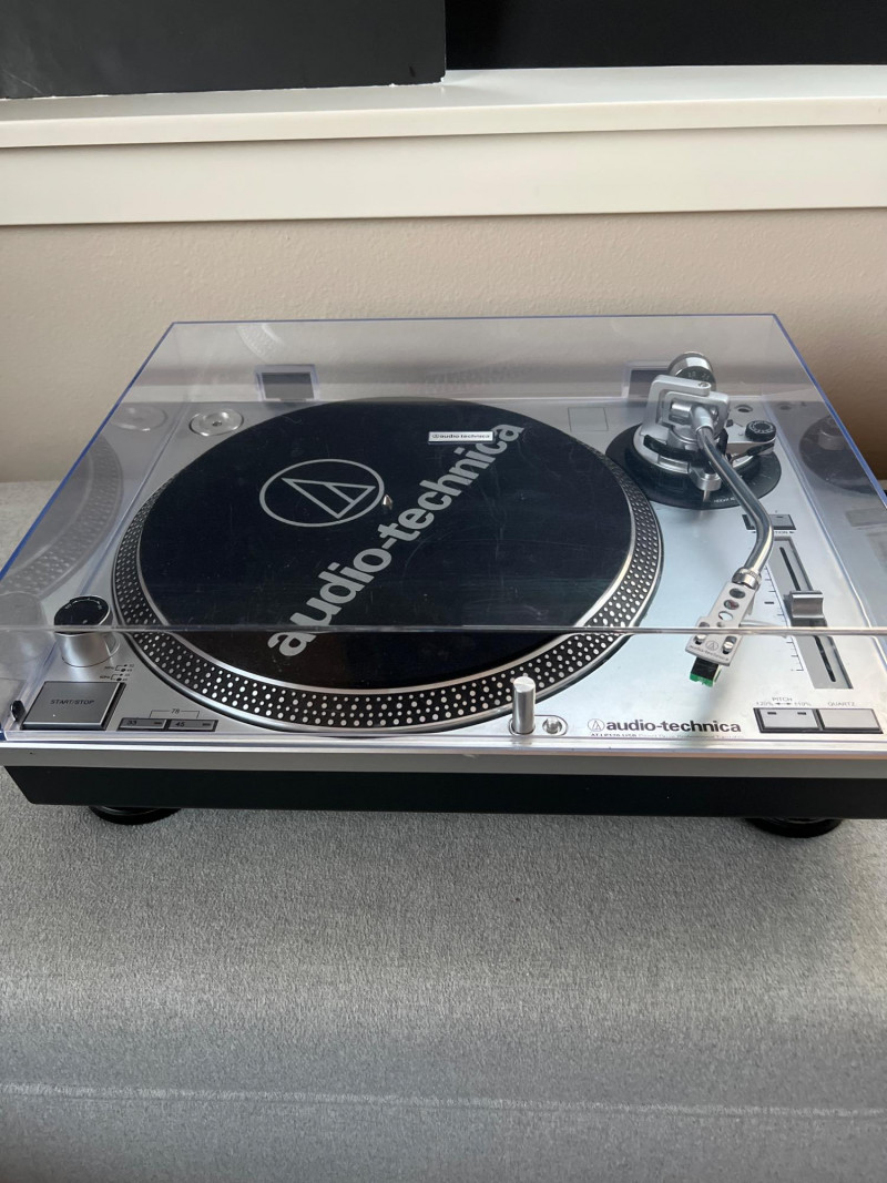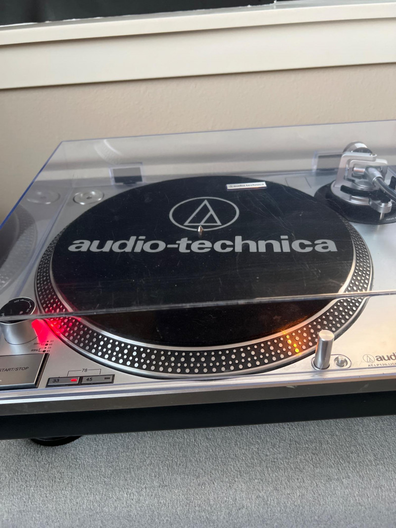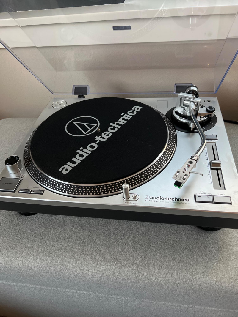 Experience high-fidelity vinyl playback with this Audio-Technica AT-LP120-USB turntable. This professional-grade unit features a direct-drive motor, USB output for digital conversion, and built-in selectable phono preamp. The sturdy aluminum platter, adjustable counterweight tonearm, anti-skate control, and replaceable Audio-Technica cartridge ensure precision performance. With start/stop buttons, pitch control, and a sleek silver finish, it’s ideal for DJs, audiophiles, and collectors alike. Includes dust cover, RCA cables, and power cord. Model: AT-LP120-USB Turntable has not been fully tested. It does power on, turntable turns but no records have been tested on the unit.