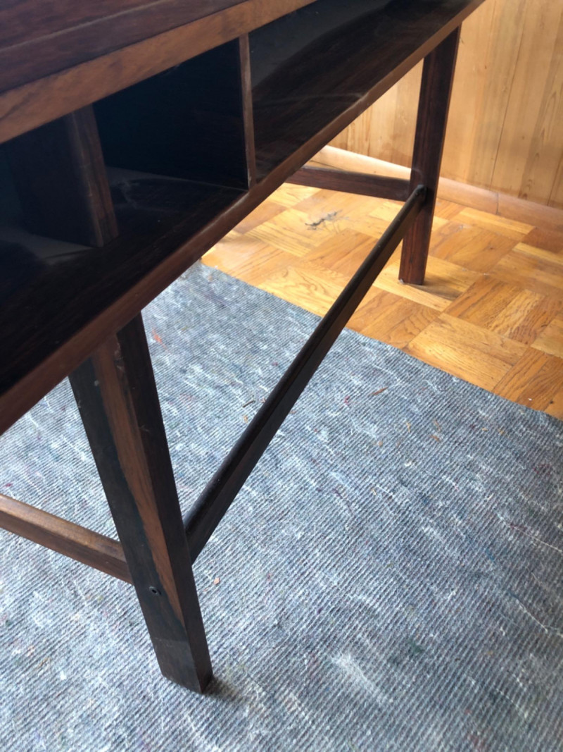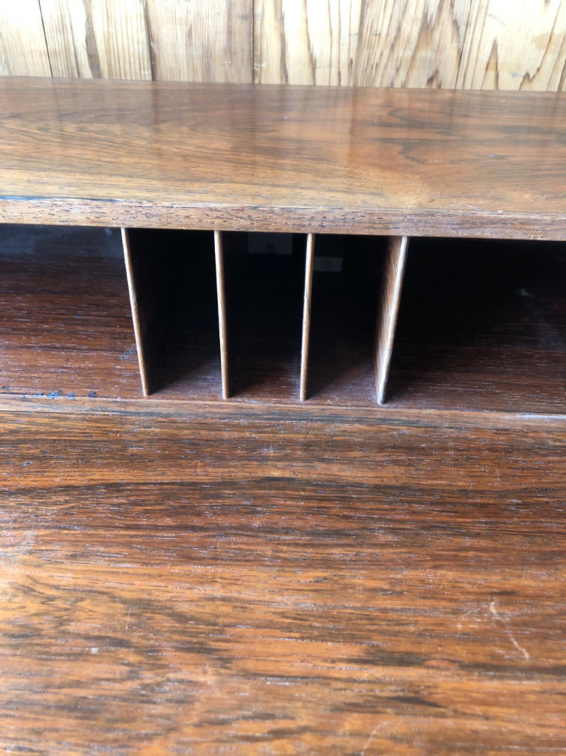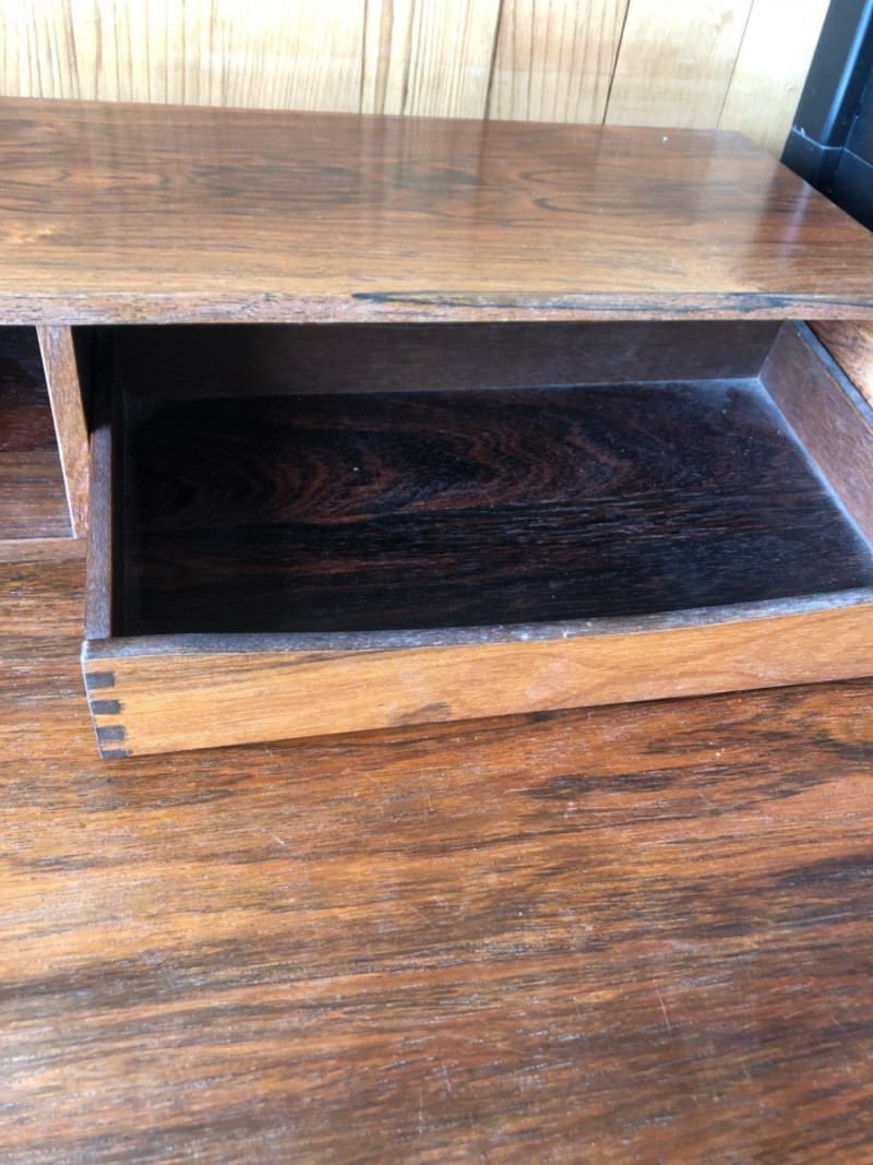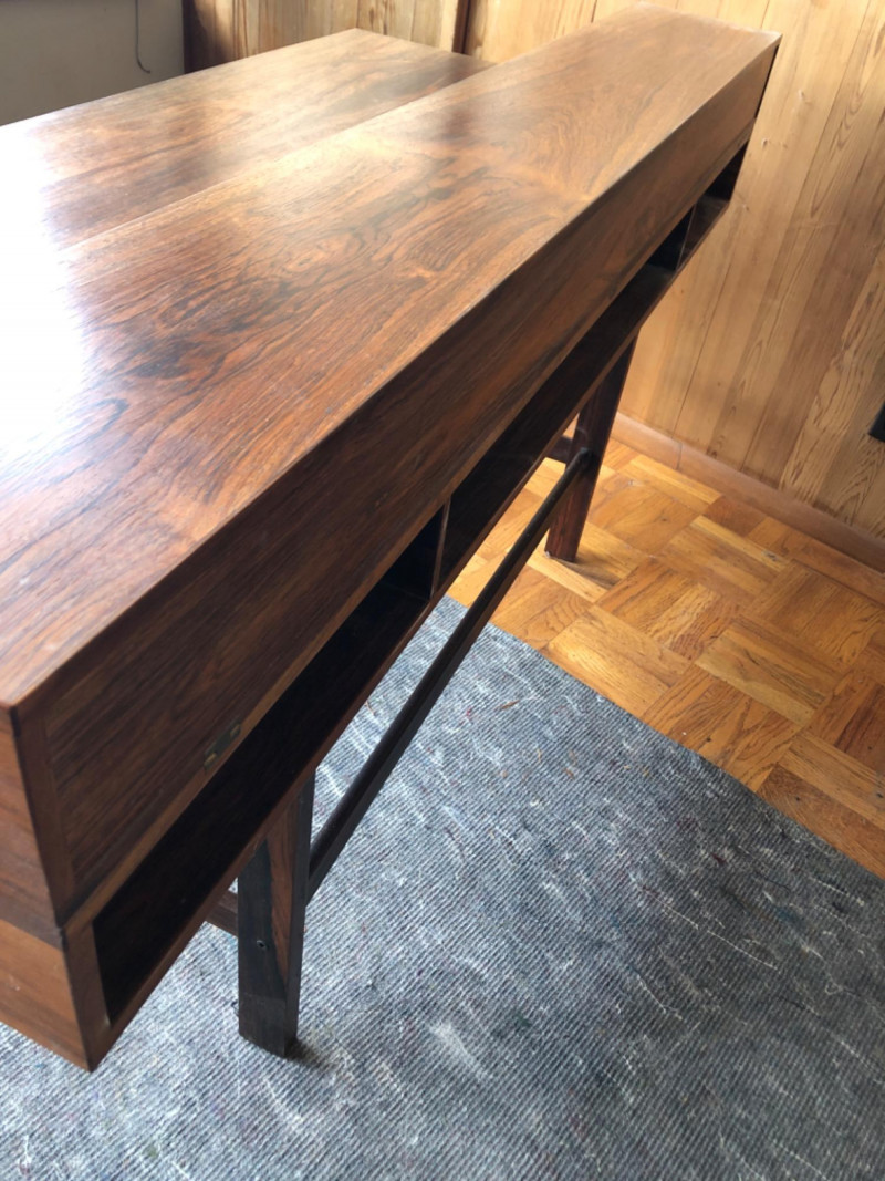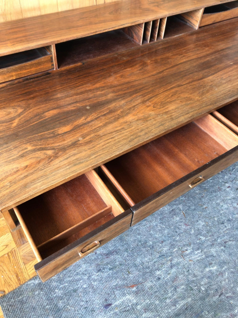 A striking example of mid-century Danish craftsmanship, this rosewood writing desk was designed by Peter Lovig Nielsen for Dansk Designs and is dated 1966. Crafted in richly grained rosewood, the piece features clean lines, minimalist form, and functional elegance. Organizer on top of desk is hinged and folds down to create a larger tabletop area. Leg supports remove for easy transport. Desk will be disassembled at pickup. Features: Designed by Peter Lovig Nielsen, marked “Lovig Dansk Designs Denmark” and dated 1966 Beautiful rosewood with highly figured grain patterns Raised hutch with two small drawers and open cubbies, including vertical paper dividers (dovetail joins) Five drawers along the front with distinctive circular recessed pulls Tapered legs and sleek modern profile Dimensions: Width: 64 inches Height to main desk surface: 29 inches Height to top of shelf: 34 inches Depth (closed): 29 inches Depth (open): 38 inches Bidding on this lot is an agreement that: (1.) You will have 2 capable, able-bodied persons to lift and load at a minimum. (2.) You
