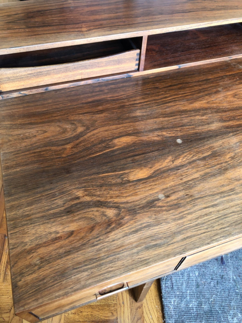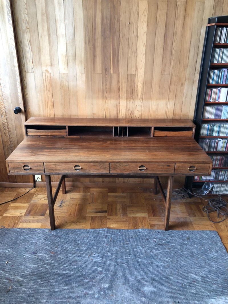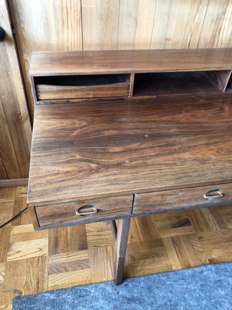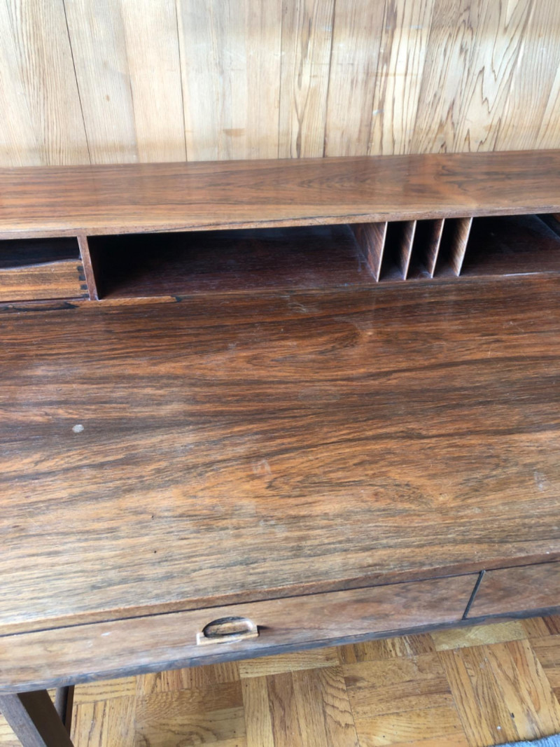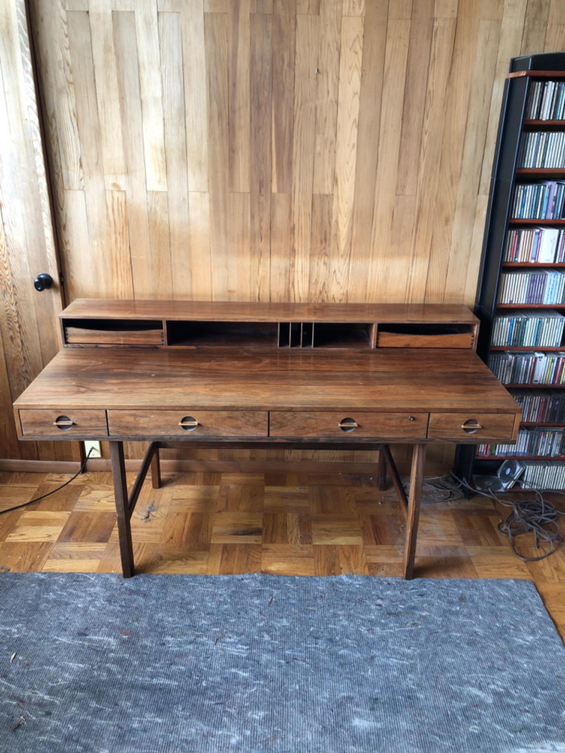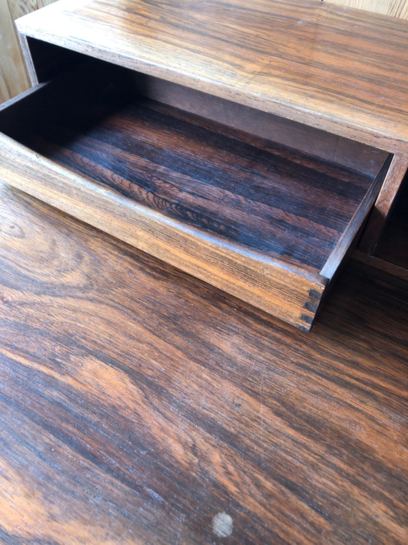 A striking example of mid-century Danish craftsmanship, this rosewood writing desk was designed by Peter Lovig Nielsen for Dansk Designs and is dated 1966. Crafted in richly grained rosewood, the piece features clean lines, minimalist form, and functional elegance. Organizer on top of desk is hinged and folds down to create a larger tabletop area. Leg supports remove for easy transport. Desk will be disassembled at pickup. Features: Designed by Peter Lovig Nielsen, marked “Lovig Dansk Designs Denmark” and dated 1966 Beautiful rosewood with highly figured grain patterns Raised hutch with two small drawers and open cubbies, including vertical paper dividers (dovetail joins) Five drawers along the front with distinctive circular recessed pulls Tapered legs and sleek modern profile Dimensions: Width: 64 inches Height to main desk surface: 29 inches Height to top of shelf: 34 inches Depth (closed): 29 inches Depth (open): 38 inches Bidding on this lot is an agreement that: (1.) You will have 2 capable, able-bodied persons to lift and load at a minimum. (2.) You
