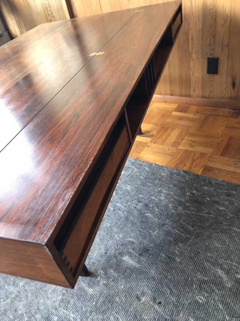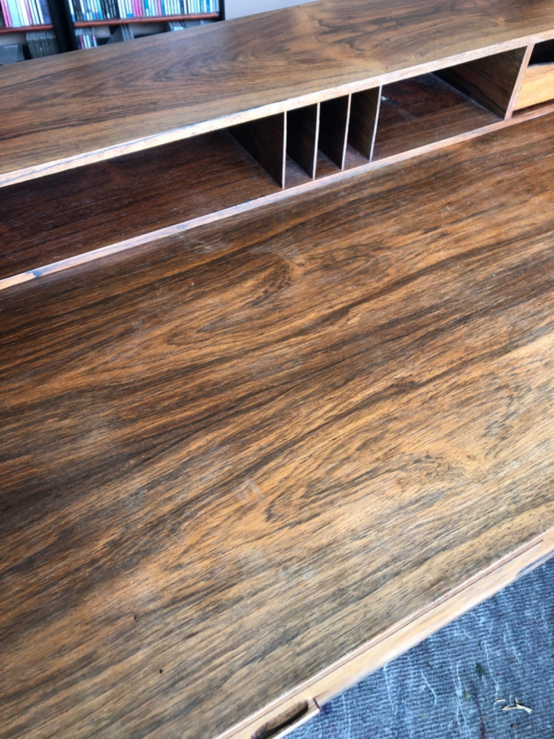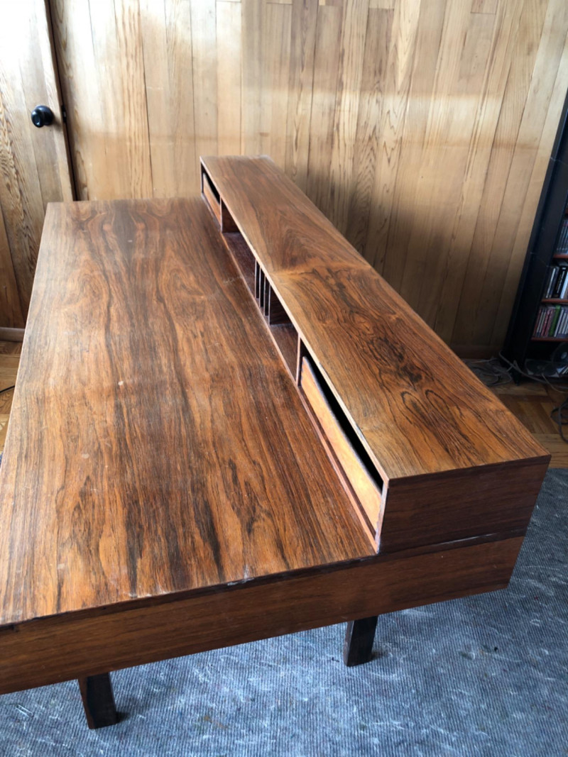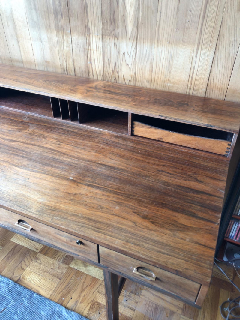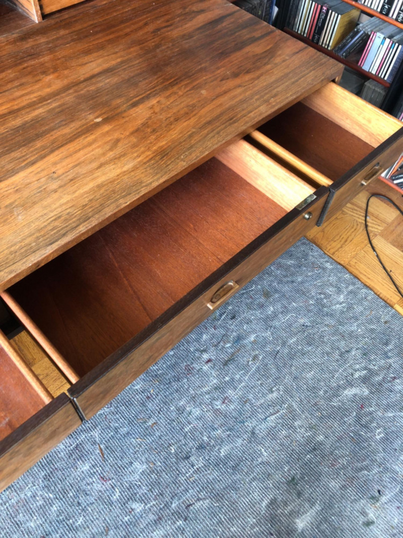 A striking example of mid-century Danish craftsmanship, this rosewood writing desk was designed by Peter Lovig Nielsen for Dansk Designs and is dated 1966. Crafted in richly grained rosewood, the piece features clean lines, minimalist form, and functional elegance. Organizer on top of desk is hinged and folds down to create a larger tabletop area. Leg supports remove for easy transport. Desk will be disassembled at pickup. Features: Designed by Peter Lovig Nielsen, marked “Lovig Dansk Designs Denmark” and dated 1966 Beautiful rosewood with highly figured grain patterns Raised hutch with two small drawers and open cubbies, including vertical paper dividers (dovetail joins) Five drawers along the front with distinctive circular recessed pulls Tapered legs and sleek modern profile Dimensions: Width: 64 inches Height to main desk surface: 29 inches Height to top of shelf: 34 inches Depth (closed): 29 inches Depth (open): 38 inches Bidding on this lot is an agreement that: (1.) You will have 2 capable, able-bodied persons to lift and load at a minimum. (2.) You