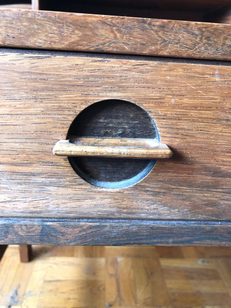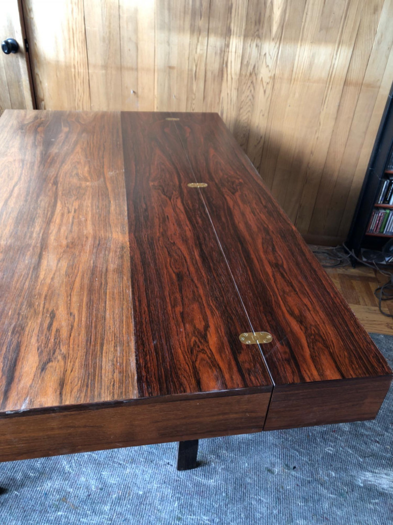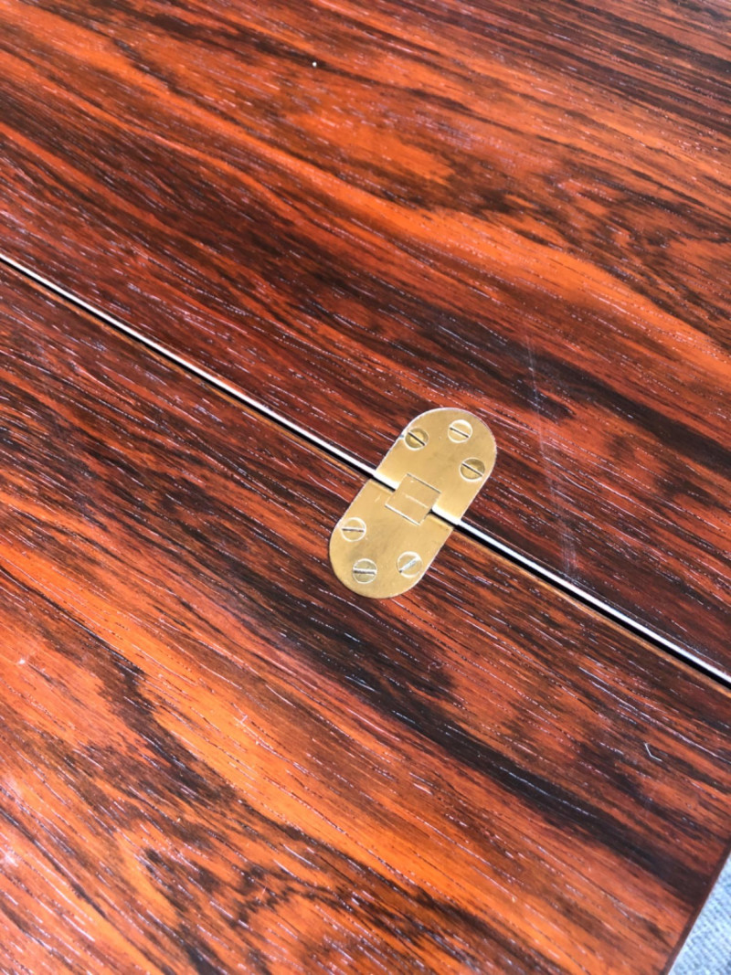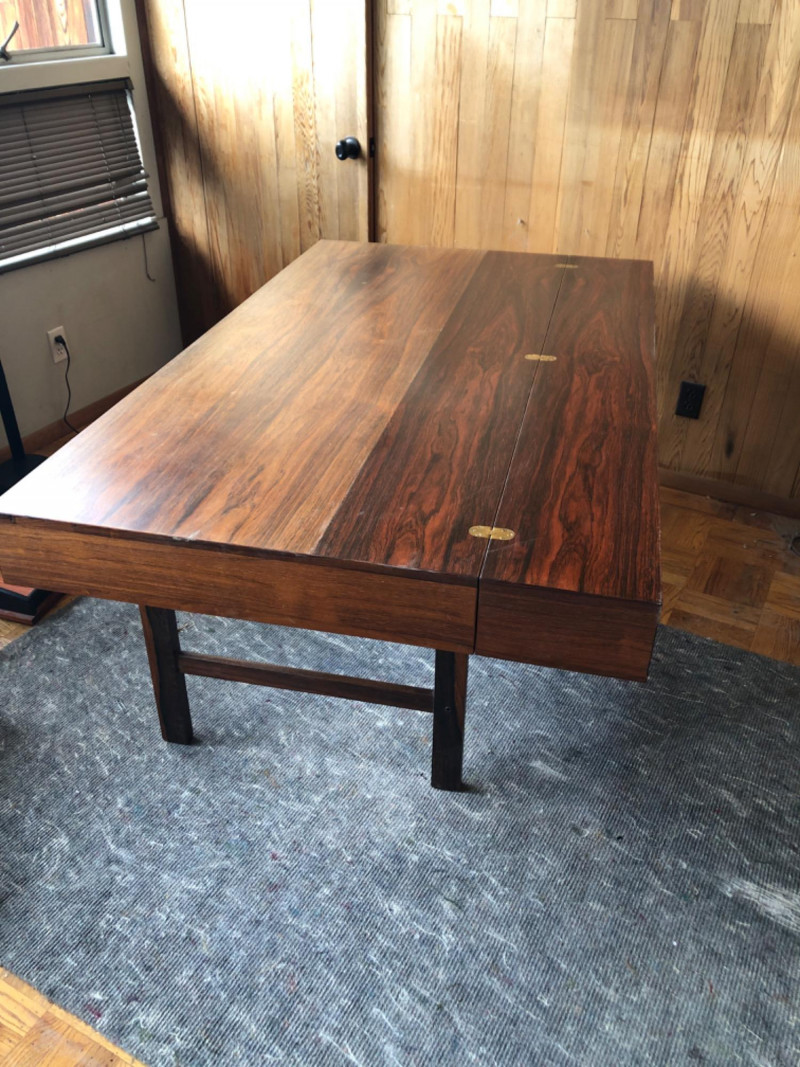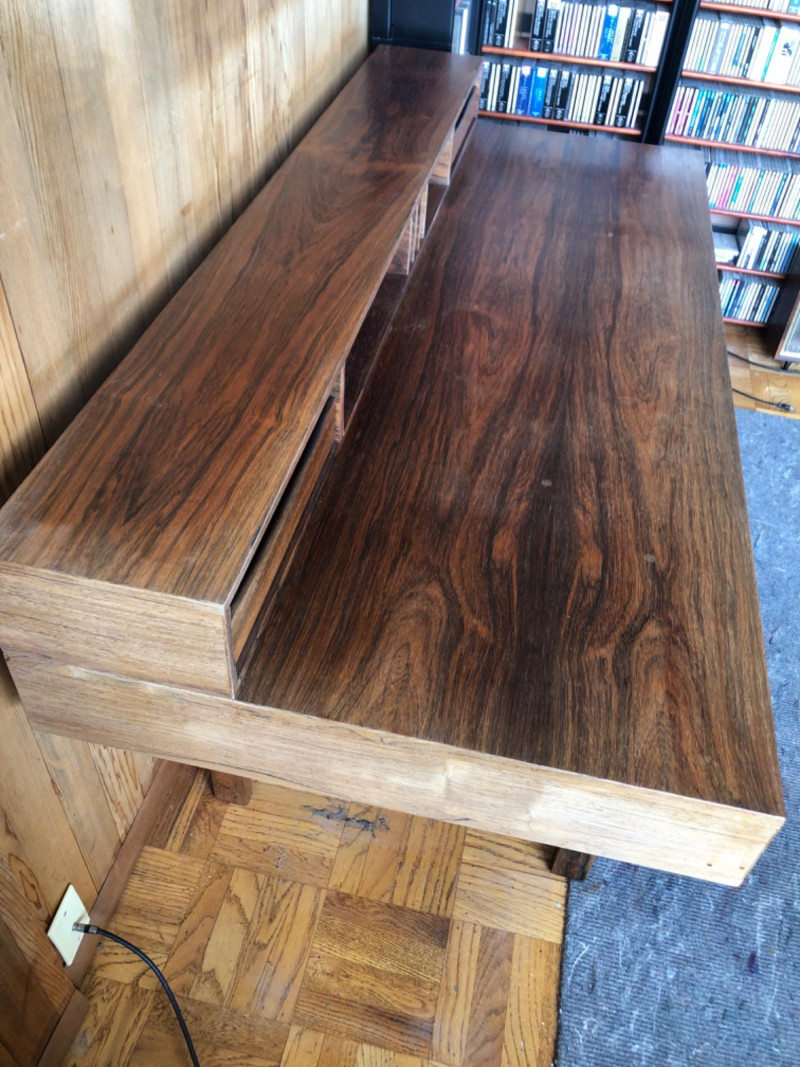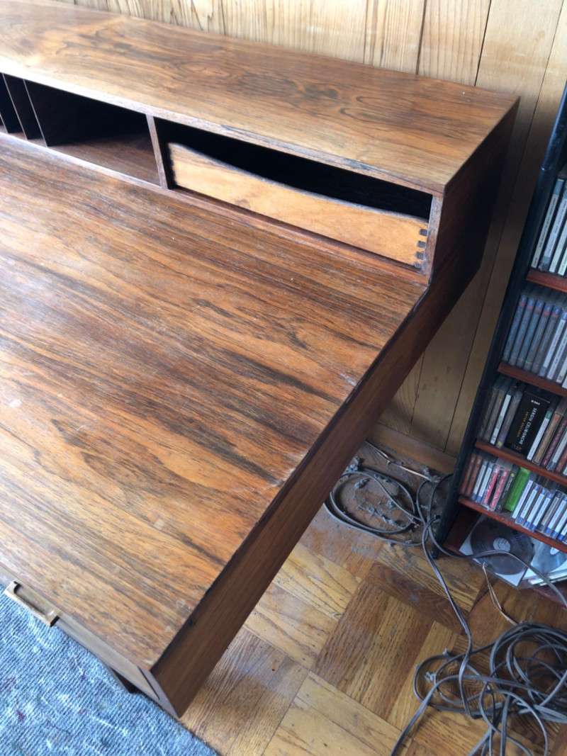 A striking example of mid-century Danish craftsmanship, this rosewood writing desk was designed by Peter Lovig Nielsen for Dansk Designs and is dated 1966. Crafted in richly grained rosewood, the piece features clean lines, minimalist form, and functional elegance. Organizer on top of desk is hinged and folds down to create a larger tabletop area. Leg supports remove for easy transport. Desk will be disassembled at pickup. Features: Designed by Peter Lovig Nielsen, marked “Lovig Dansk Designs Denmark” and dated 1966 Beautiful rosewood with highly figured grain patterns Raised hutch with two small drawers and open cubbies, including vertical paper dividers (dovetail joins) Five drawers along the front with distinctive circular recessed pulls Tapered legs and sleek modern profile Dimensions: Width: 64 inches Height to main desk surface: 29 inches Height to top of shelf: 34 inches Depth (closed): 29 inches Depth (open): 38 inches Bidding on this lot is an agreement that: (1.) You will have 2 capable, able-bodied persons to lift and load at a minimum. (2.) You