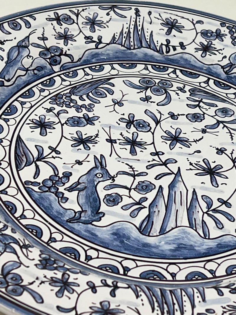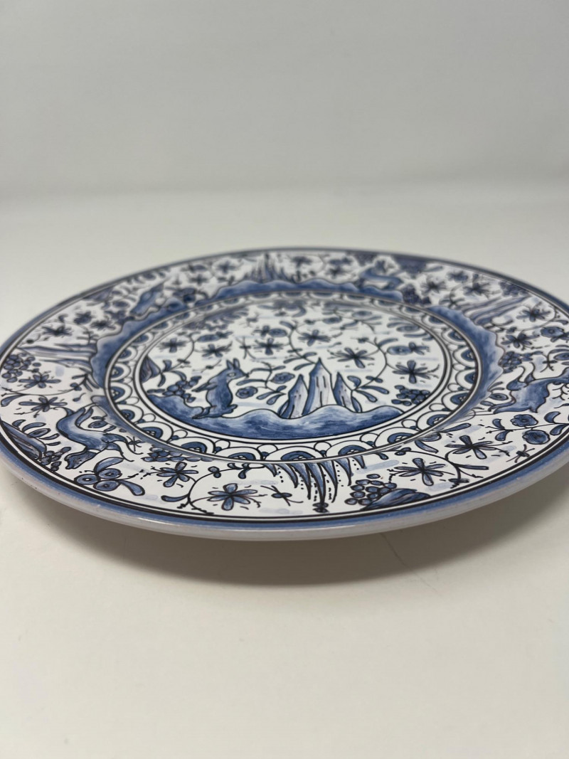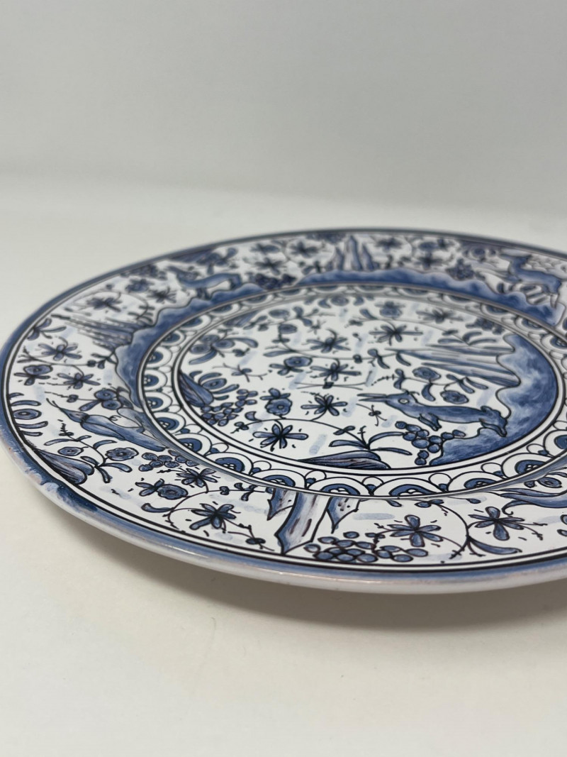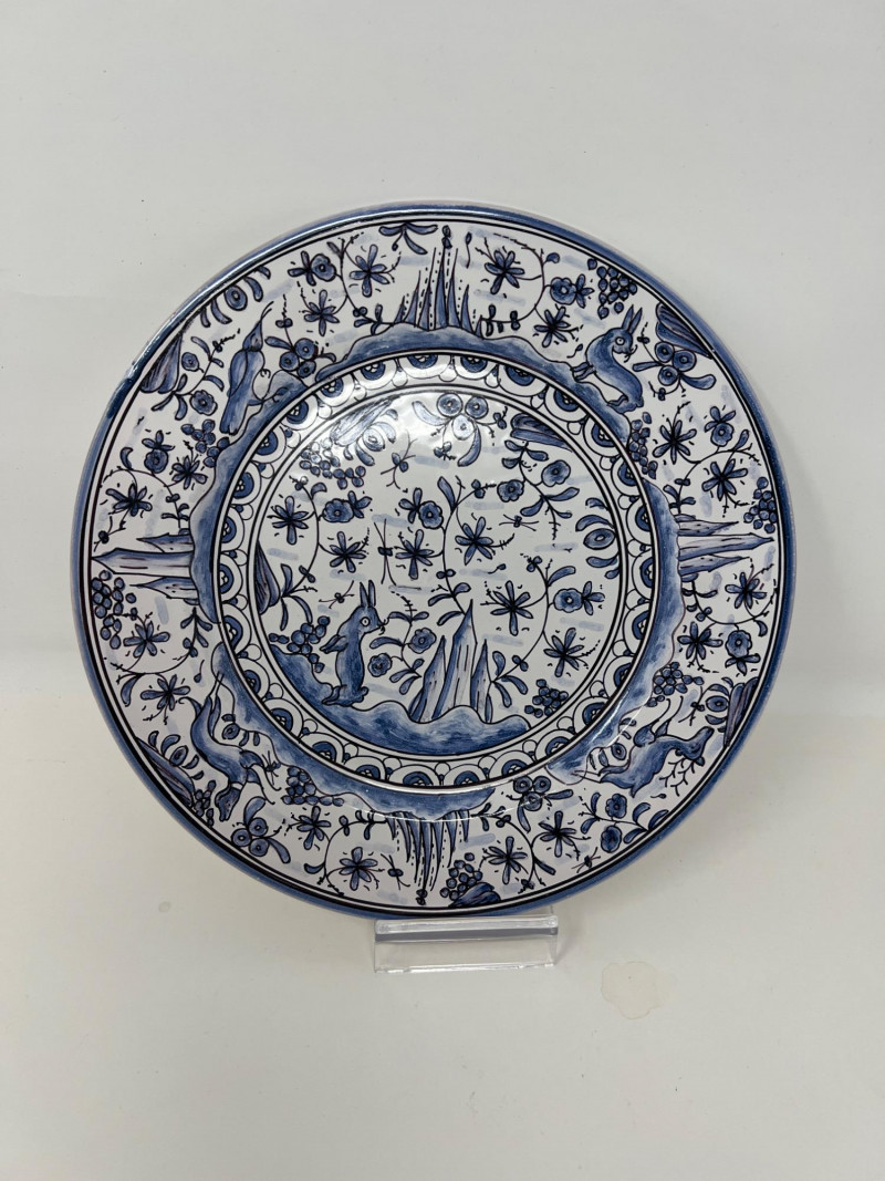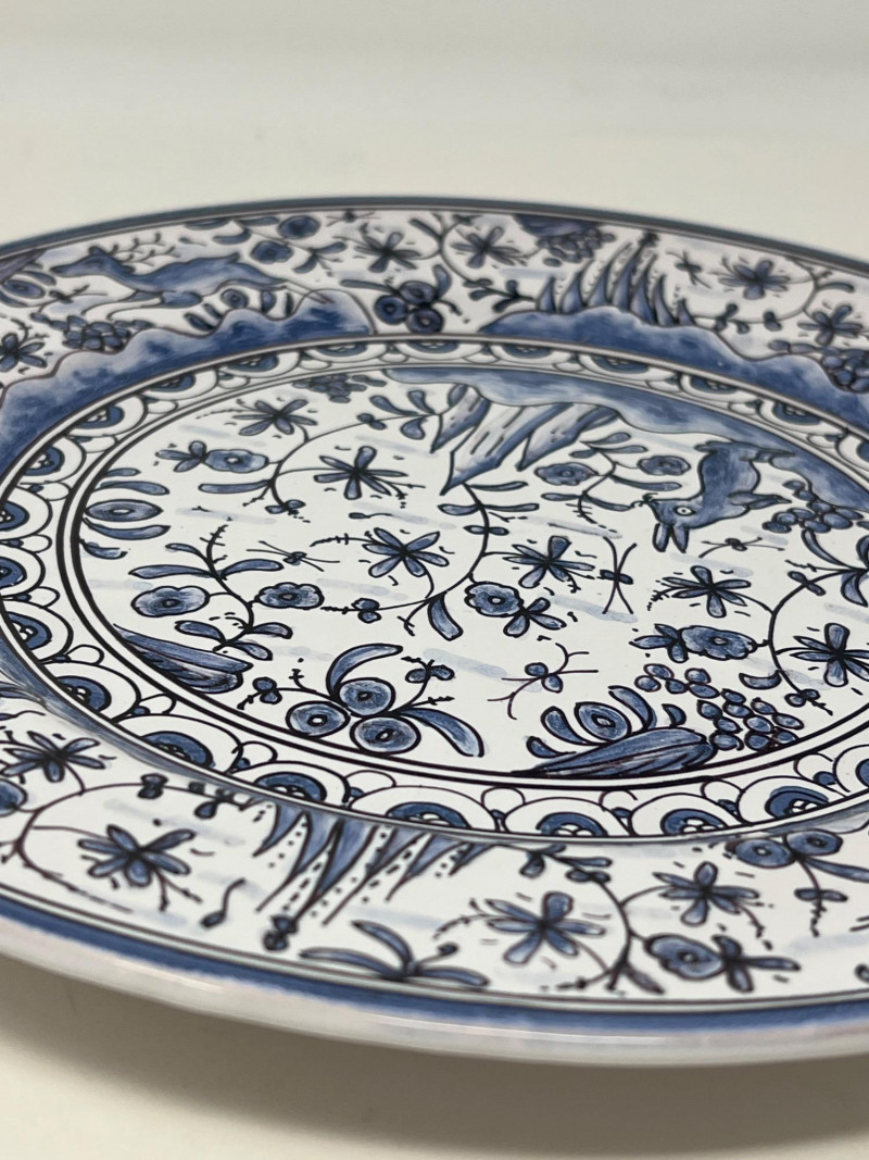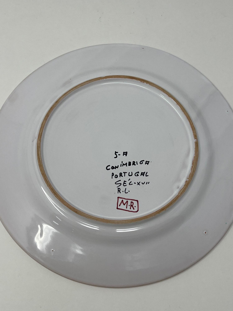 This beautifully crafted Portuguese ceramic plate showcases a timeless blue and white design inspired by 17th-century Conimbriga motifs. It’s a striking decorative piece with historical charm and intricate hand-painted detail. Details: Origin: Portugal Style: Conimbriga, 17th-century reproduction (marked "SÉC-XVII") Material: Glazed ceramic Color: Blue and white Design: Hand-painted floral and animal motifs with scenic center and ornate border Markings: Signed on the reverse with "5-A Conimbriga Portugal SÉC-XVII R.L." and "M.R."