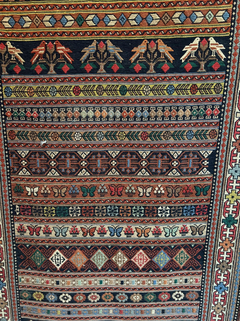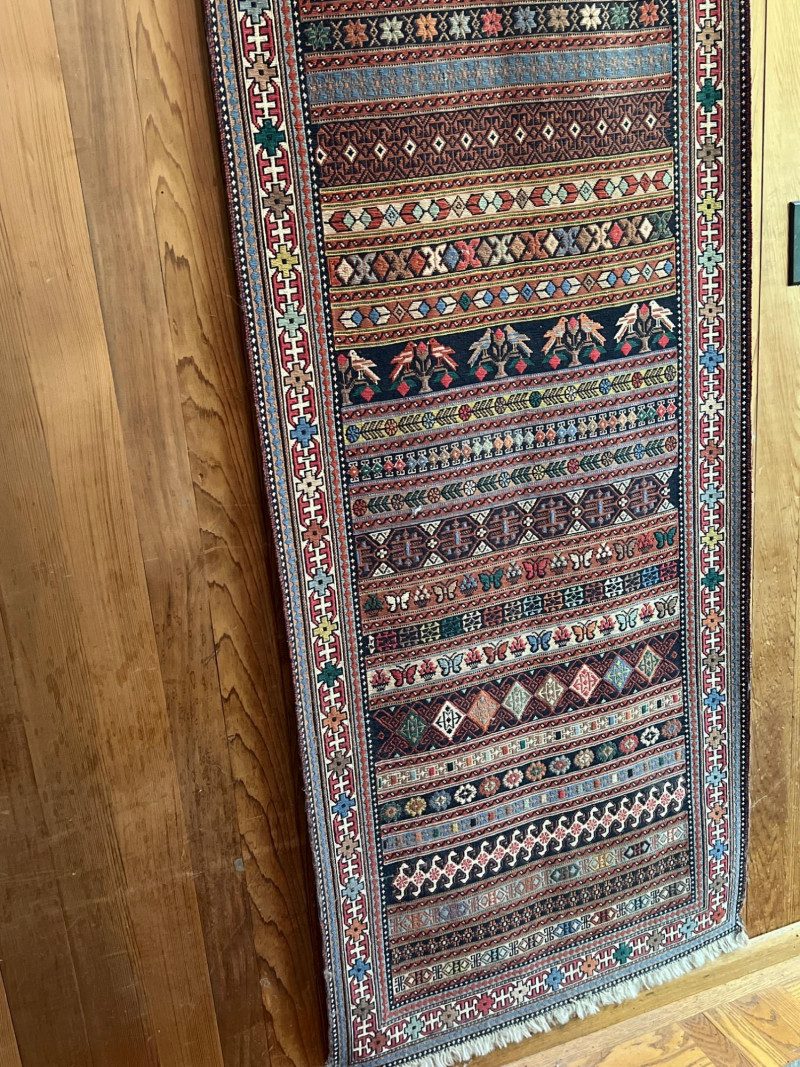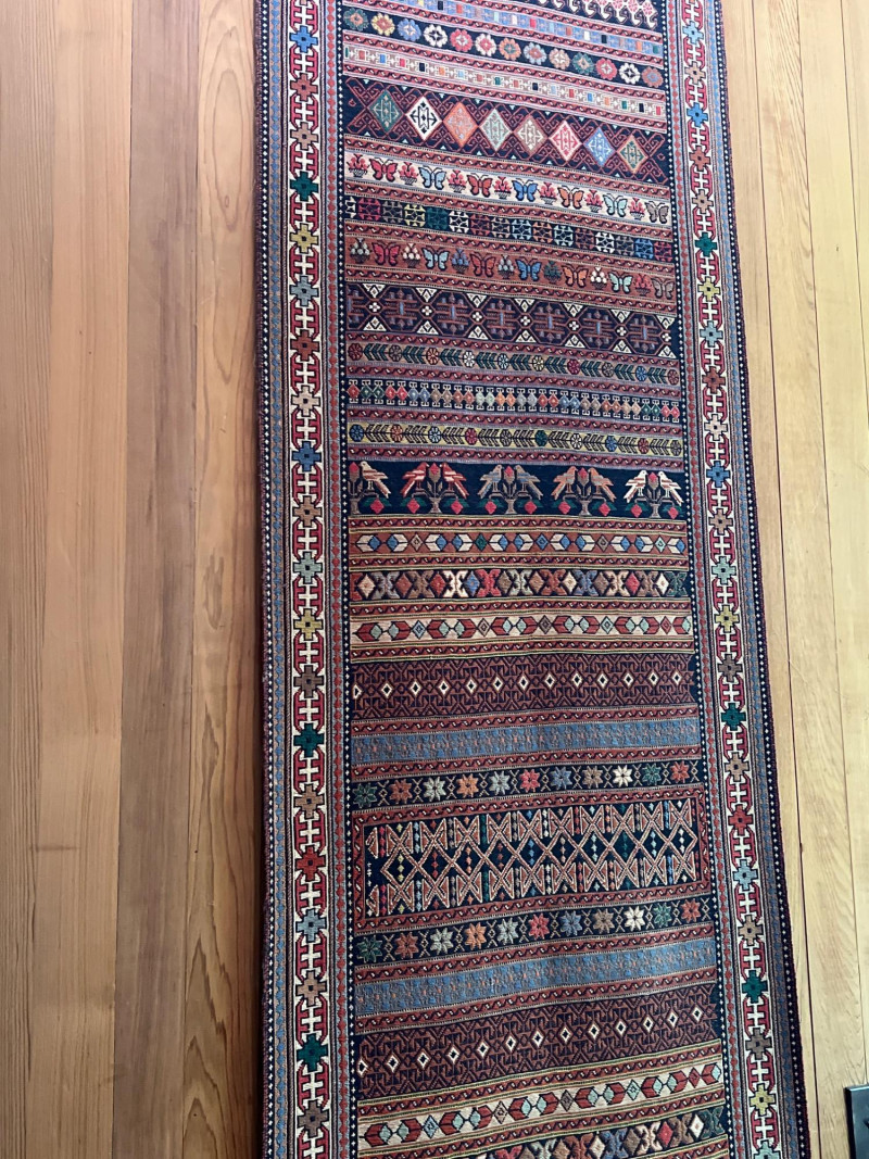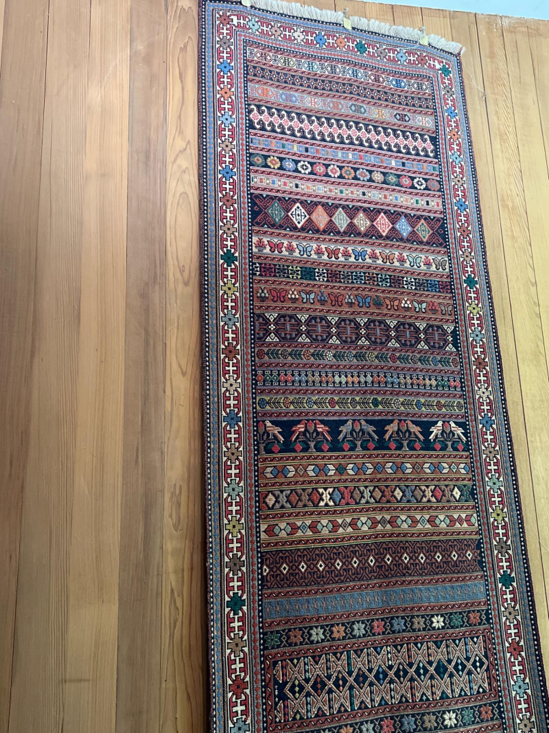 This is a beautiful handwoven Persian runner rug, crafted in Iran and rich in traditional geometric and tribal motifs. The intricate design features a harmonious blend of earthy reds, deep blues, and neutral tones, with repeating diamond and floral patterns bordered by a vibrant, multicolored edge. The central field includes rows of stylized birds and abstract floral shapes, creating a visually dynamic and culturally rich textile piece. Origin: Made in Iran Type: Handwoven Persian Runner Total Area: 2.05 m² Design: Traditional tribal motifs with geometric and animal patterns