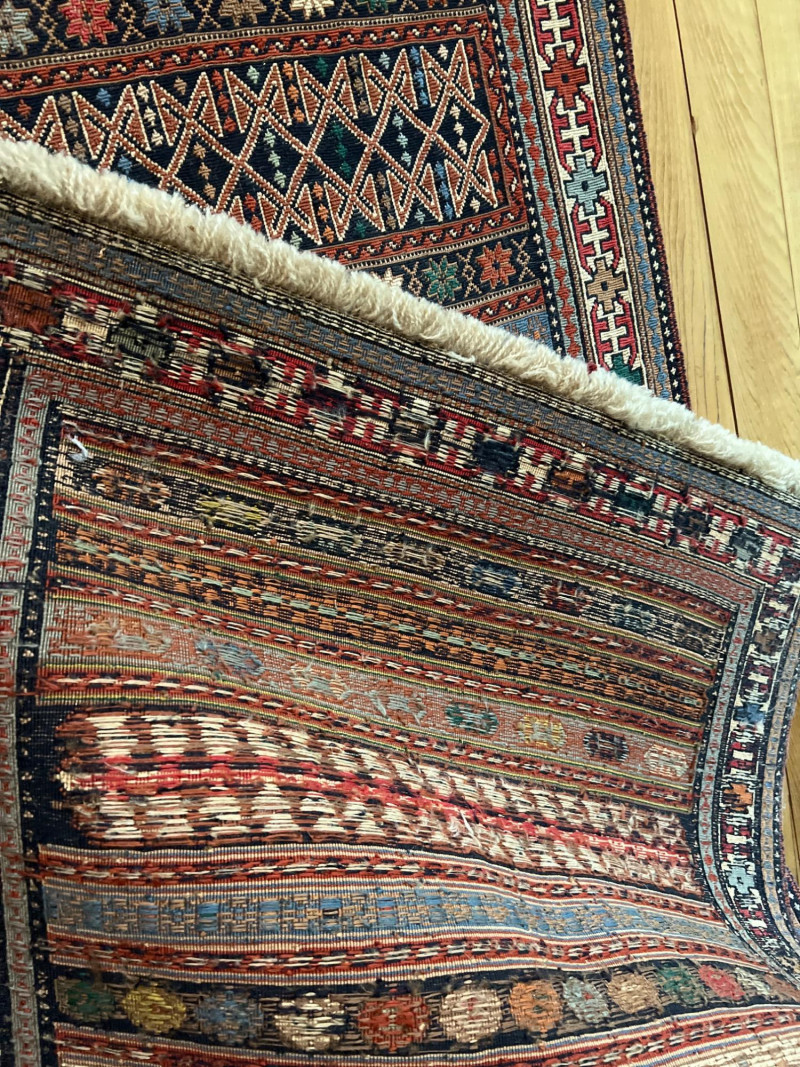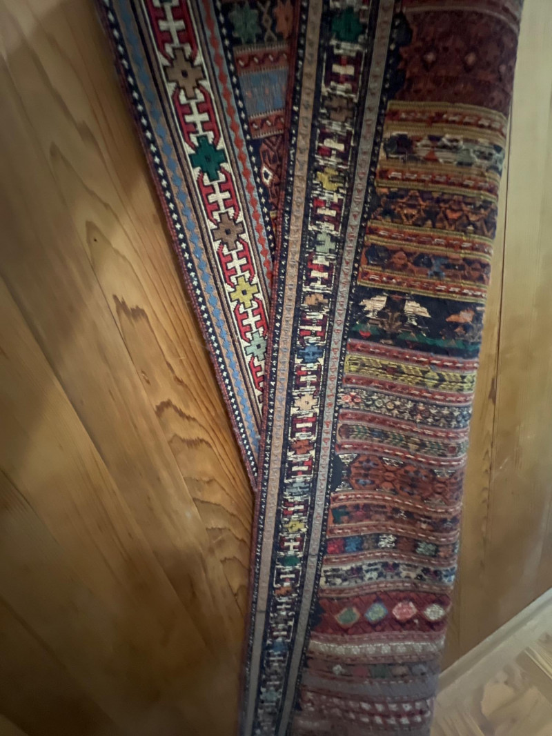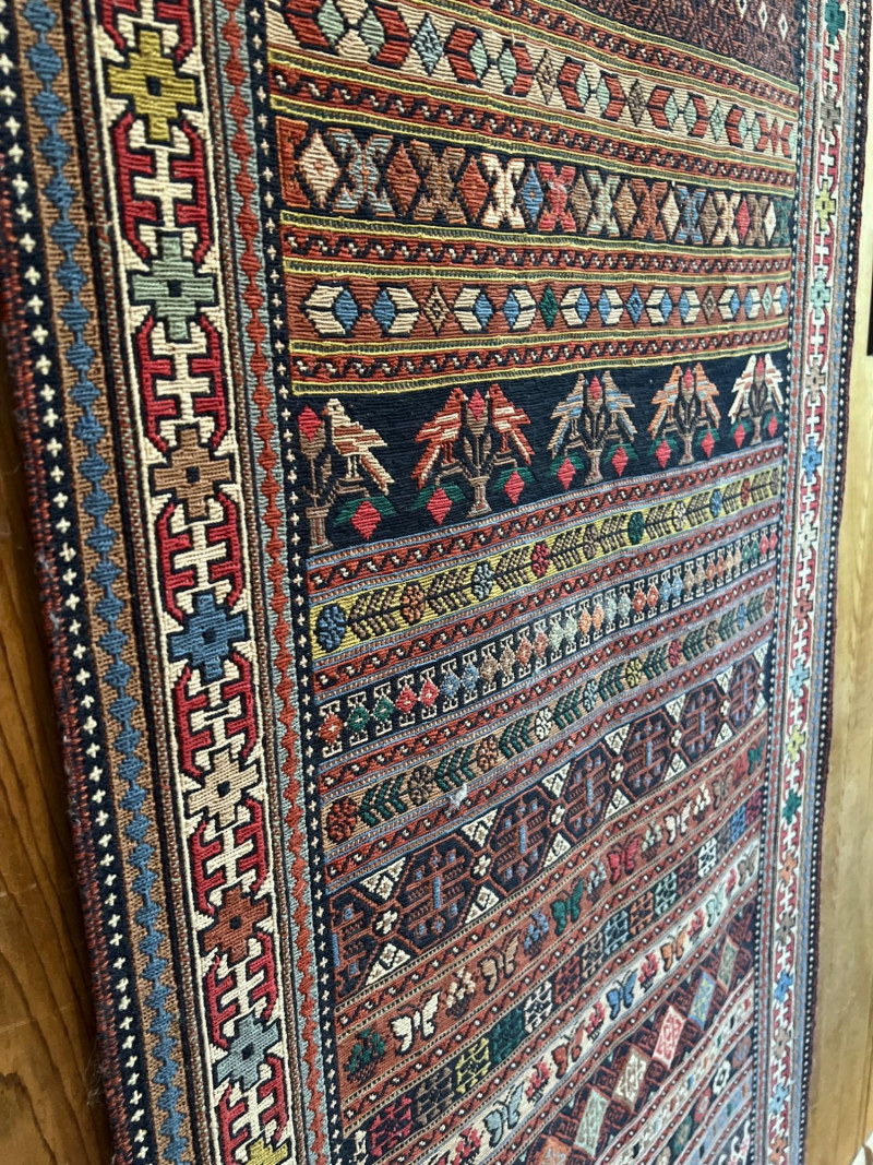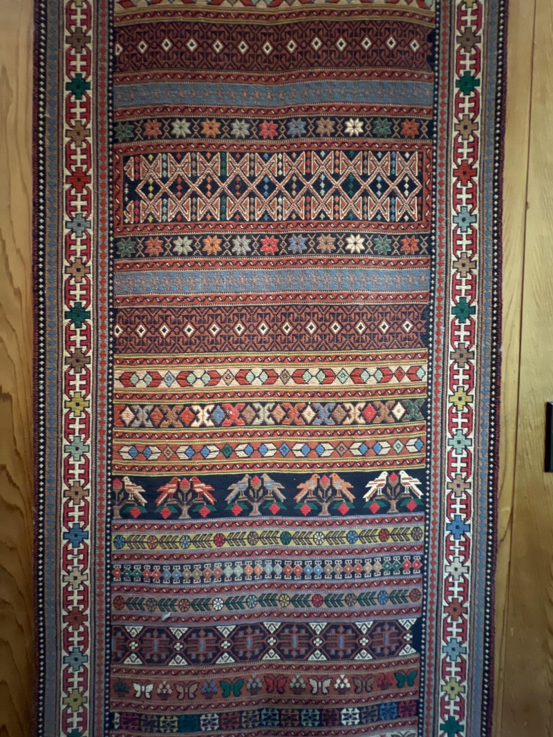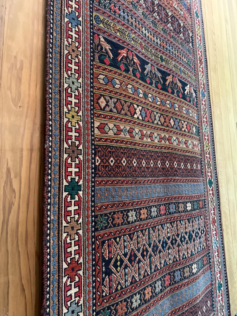 This is a beautiful handwoven Persian runner rug, crafted in Iran and rich in traditional geometric and tribal motifs. The intricate design features a harmonious blend of earthy reds, deep blues, and neutral tones, with repeating diamond and floral patterns bordered by a vibrant, multicolored edge. The central field includes rows of stylized birds and abstract floral shapes, creating a visually dynamic and culturally rich textile piece. Origin: Made in Iran Type: Handwoven Persian Runner Total Area: 2.05 m² Design: Traditional tribal motifs with geometric and animal patterns