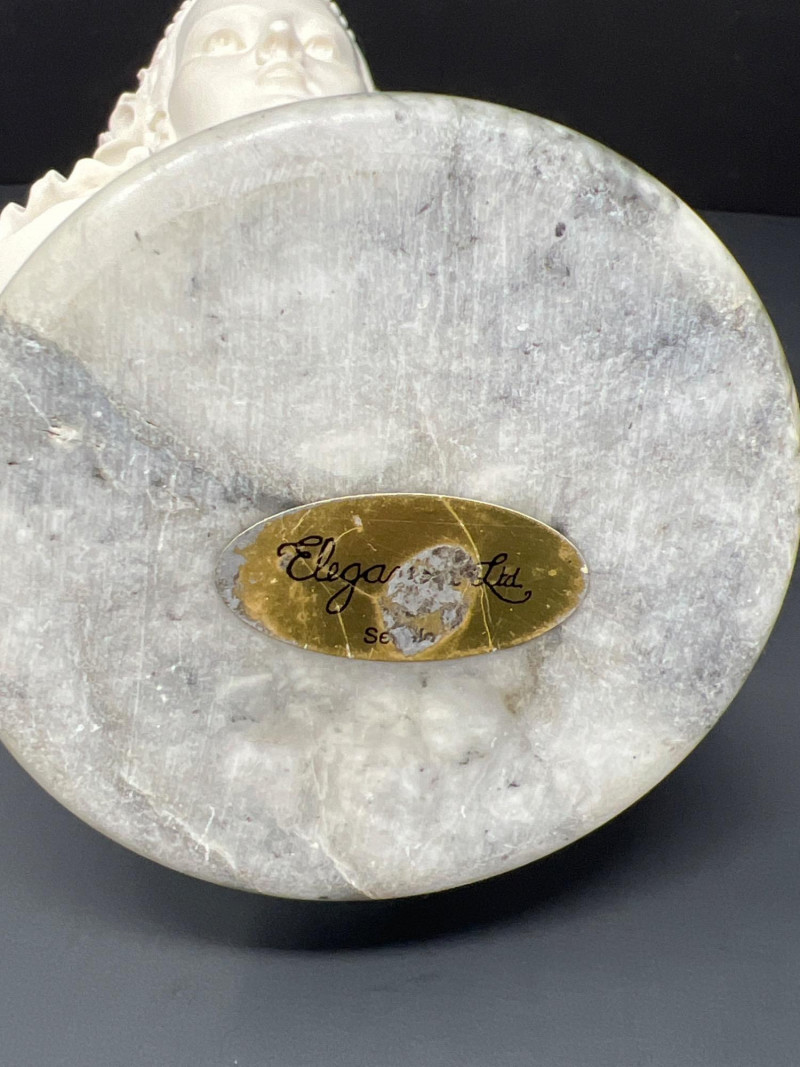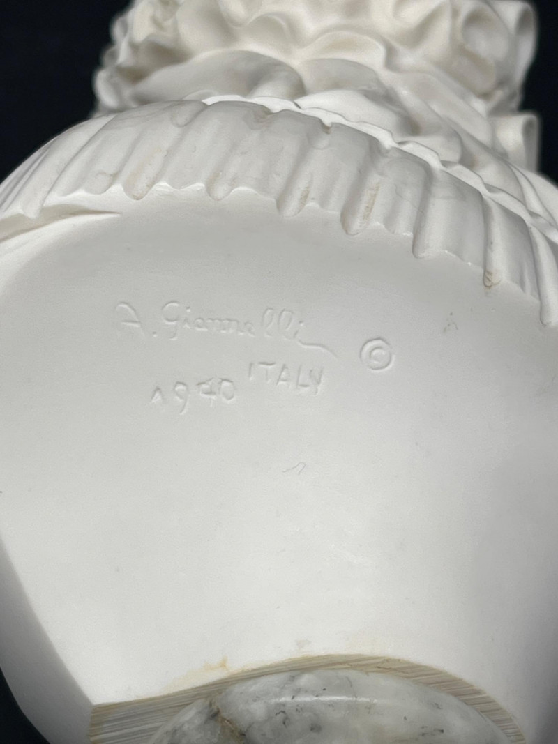 A beautifully sculpted alabaster marble bust by Italian artist Arnoldo Giannelli, dated 1940. Titled Angelica Maria, this elegant piece showcases the artist’s refined craftsmanship and attention to detail, with delicate facial features and finely carved drapery and adornments. Artist: A. Giannelli Title: Angelica Maria Date: 1940 Material: Alabaster marble Origin: Italy Details: Signed and dated on the back; label reads “Elegance Ltd.,” possibly indicating distribution