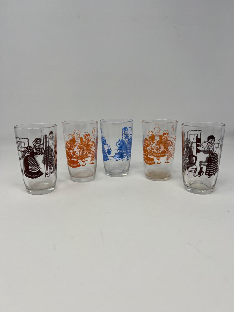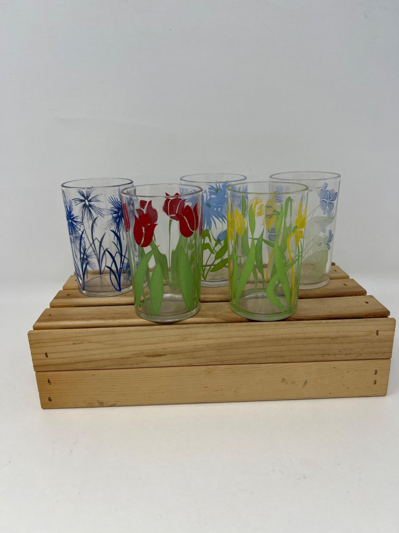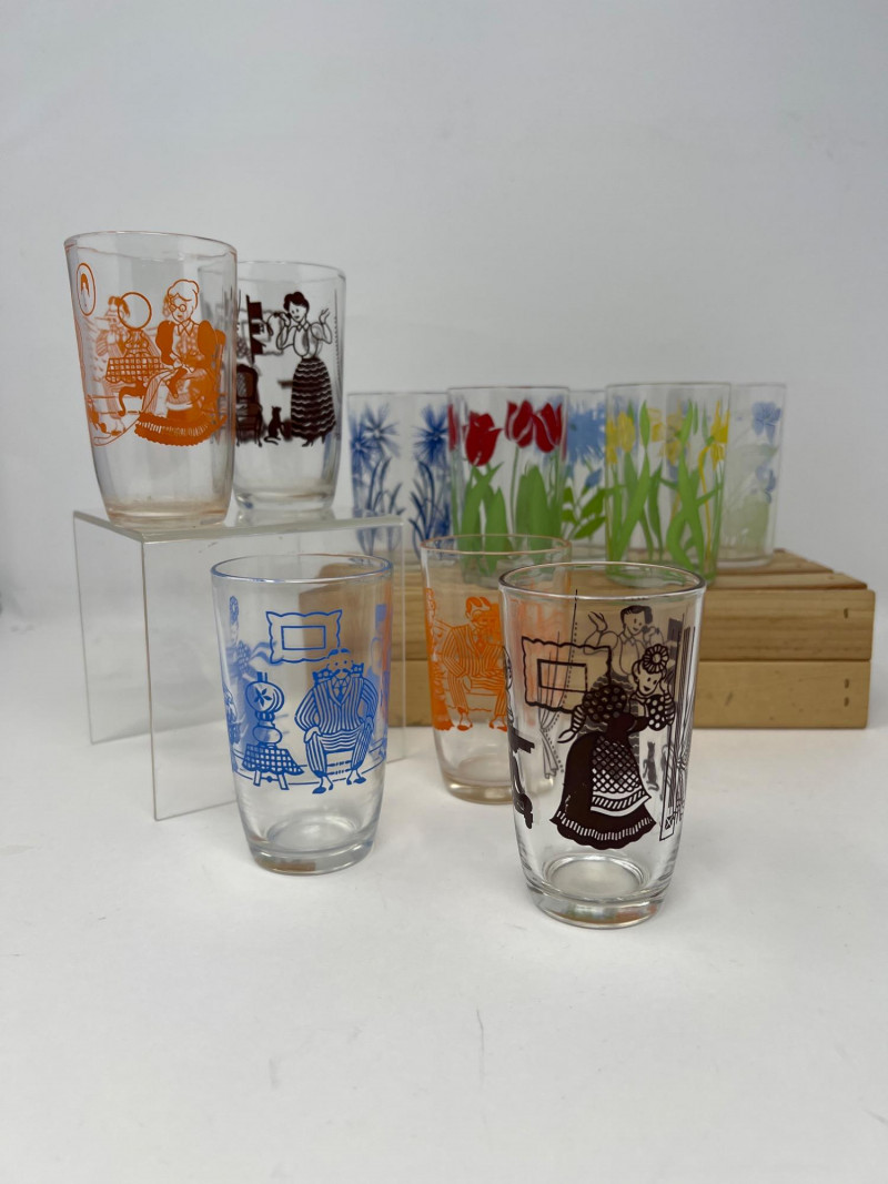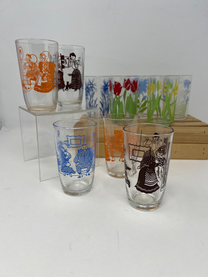 This set includes 10 vintage Libbey juice glasses, each featuring colorful and unique prints in two charming styles: Five glasses with vibrant floral designs including tulips, irises, lilies, and cornflowers. Five glasses with folk art illustrations in orange, blue, and black, depicting traditional scenes and characters. Details: Brand: Libbey Quantity: 10 glasses Era: Mid-century retro Material: Glass