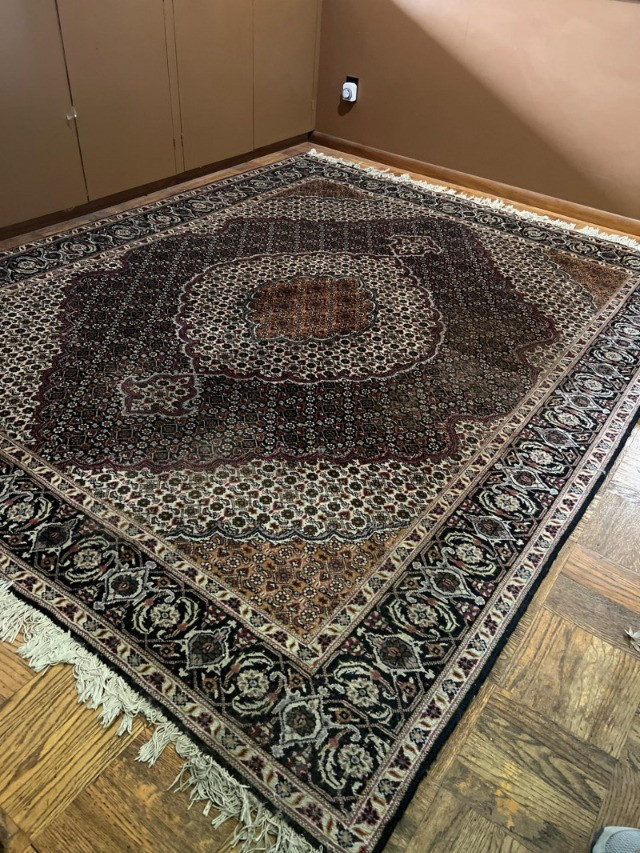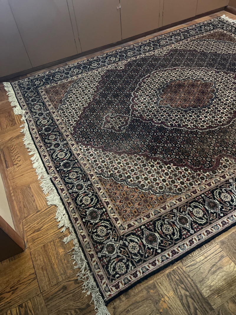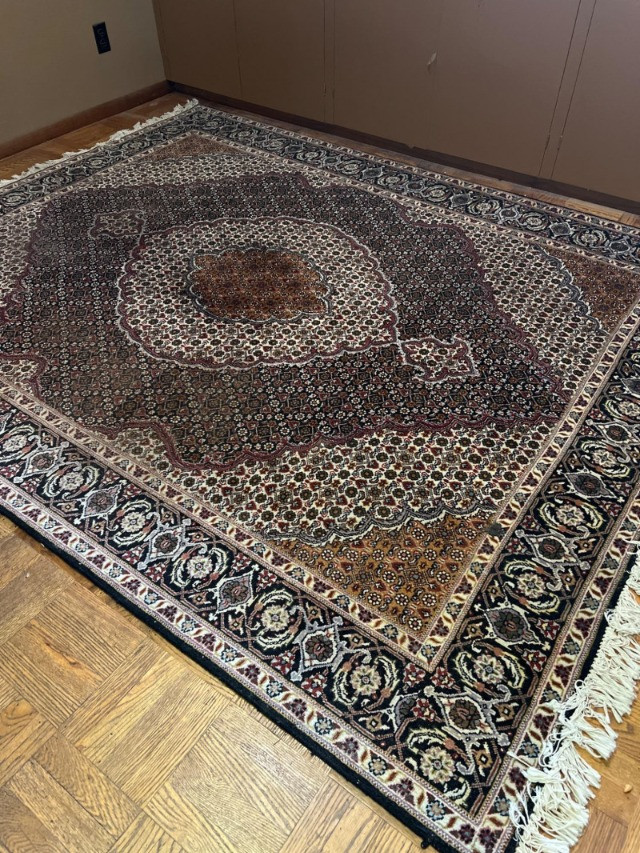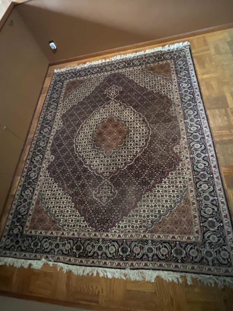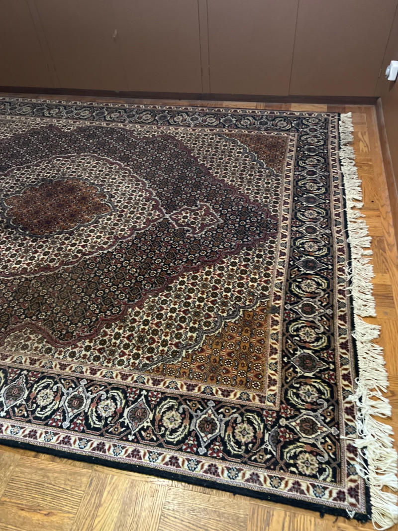 This is a beautiful hand-knotted Persian Tabriz rug featuring a classic central medallion design, surrounded by intricate floral motifs and detailed borders. Woven with fine craftsmanship, the rug showcases a rich color palette of deep reds, cream, and navy tones. Origin: Tabriz, Iran Material: Wool Design: Central medallion with floral and geometric patterns No steps involved. Drive up and load.