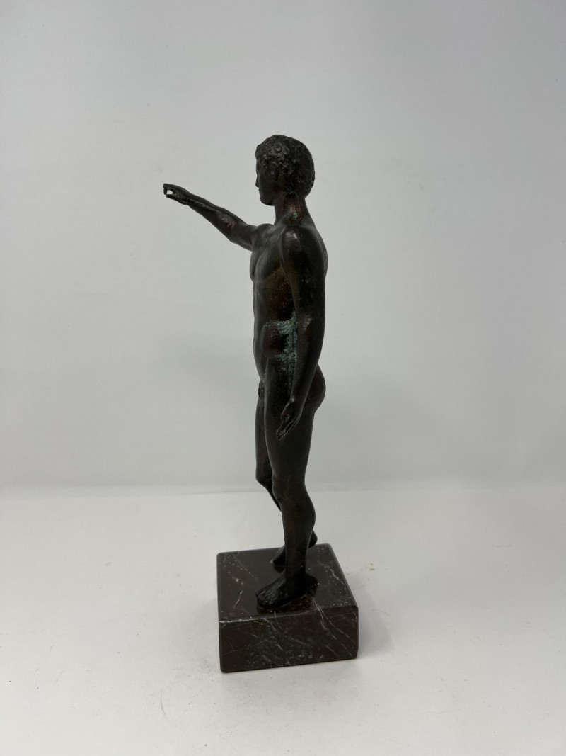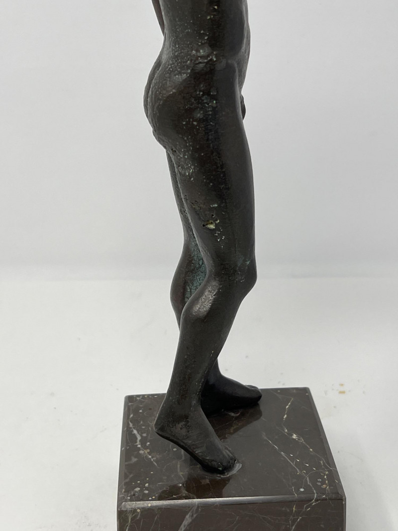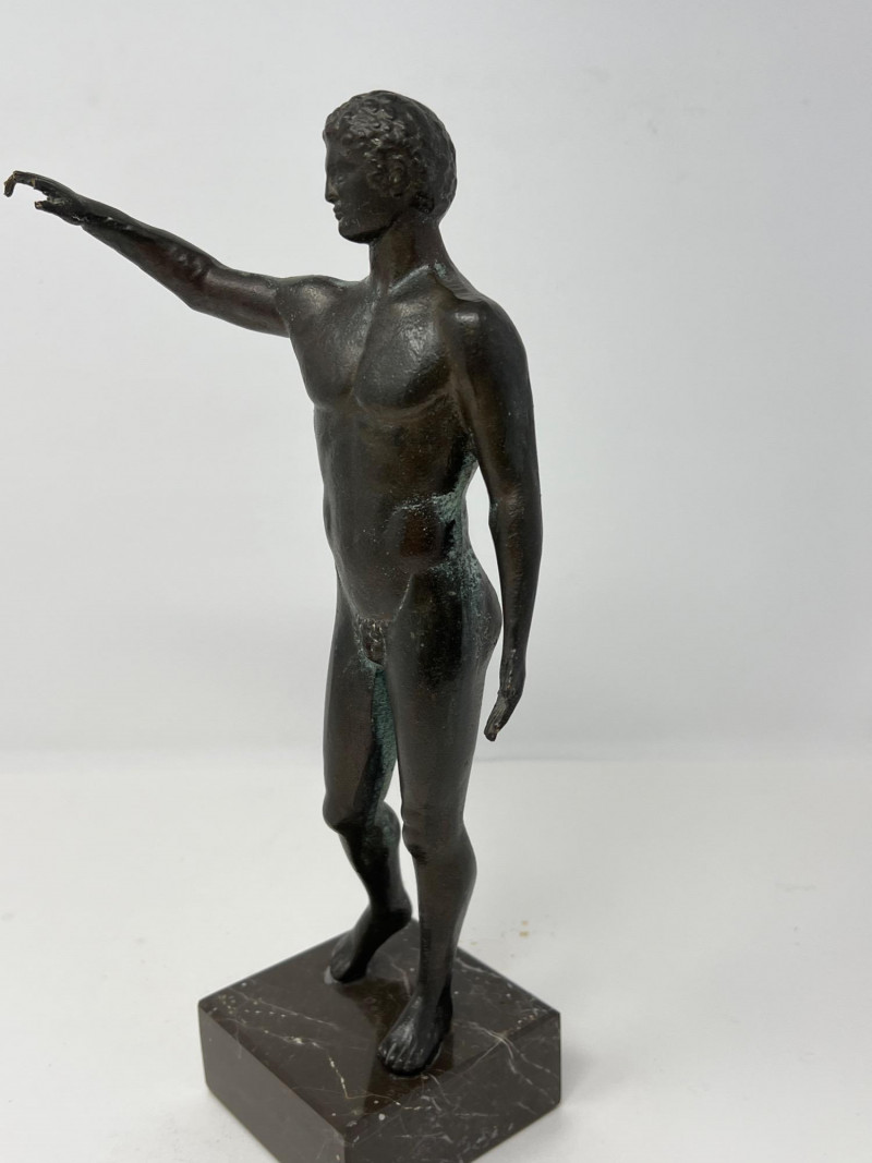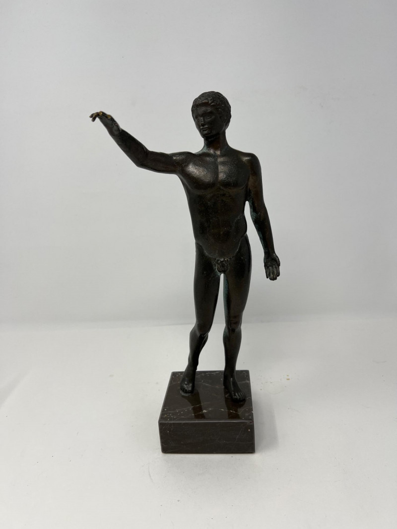 This classical-style bronze statue depicts a nude male figure standing in contrapposto, with one arm extended forward and the other relaxed by his side. Crafted with fine anatomical detail and textured hair, the figure exudes a strong Greco-Roman influence reminiscent of ancient athletic or heroic poses. The statue is securely mounted on a polished square marble base, adding both contrast and elegance. Patina and wear are present, particularly at the extended arm, indicating age and character. A striking piece ideal for collectors of classical art or décor with a historical flair. Material: Solid bronze with marble base
