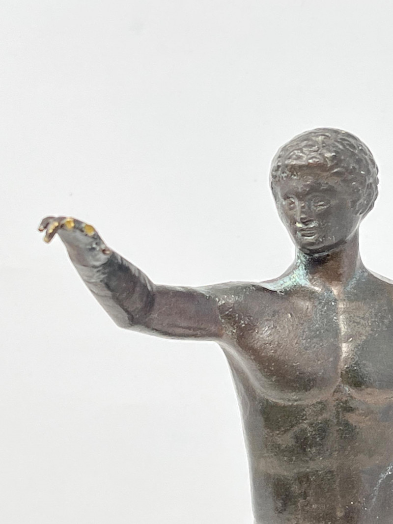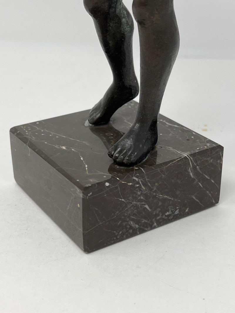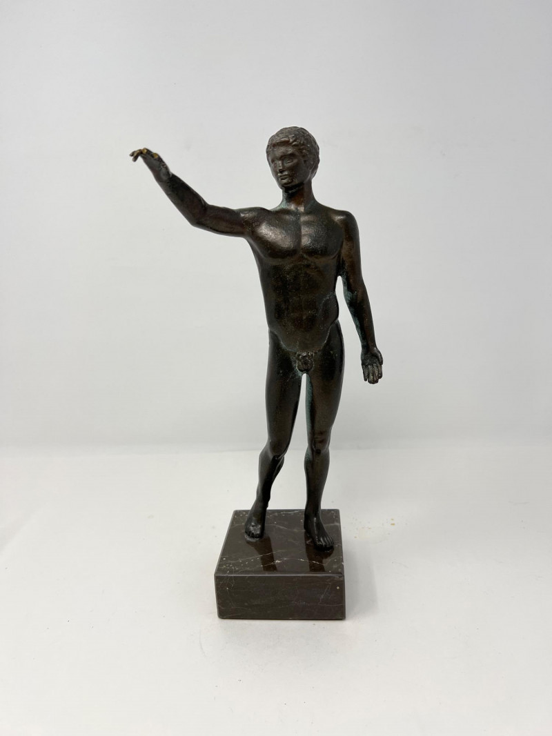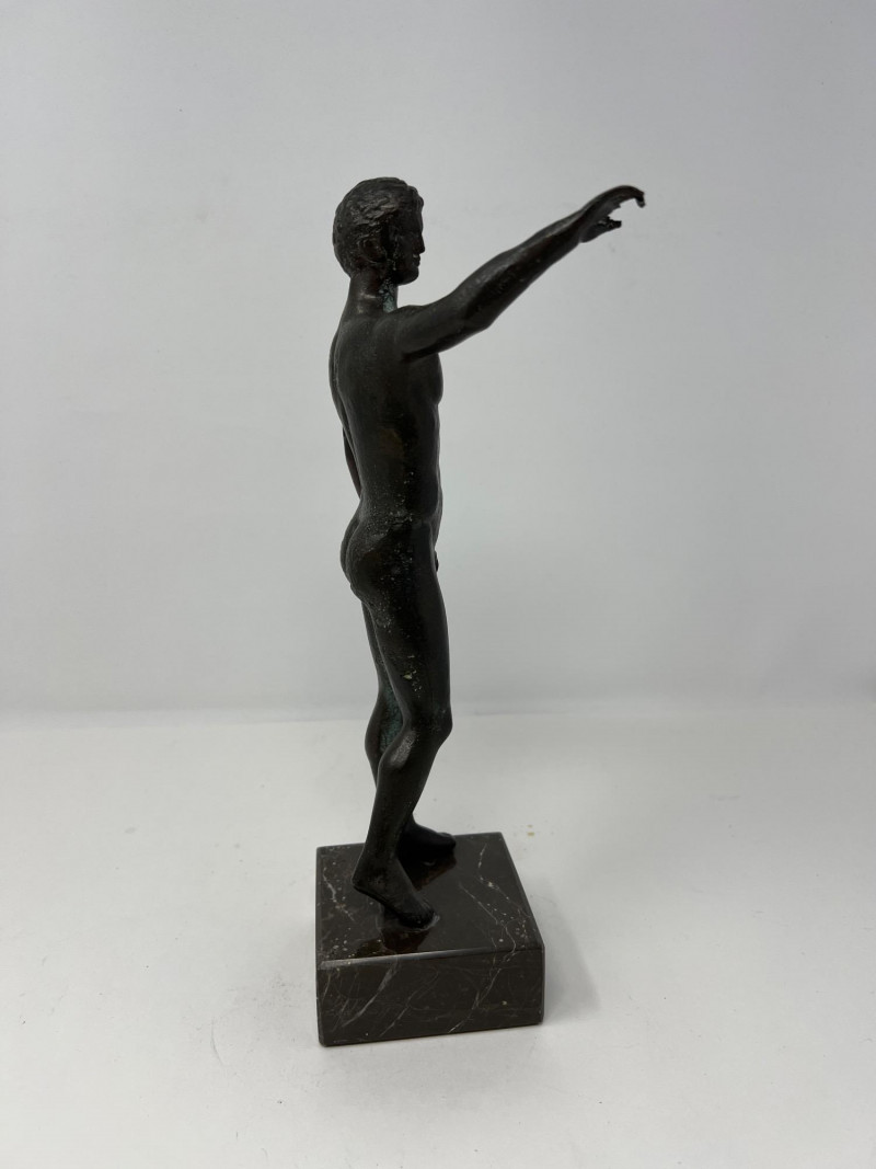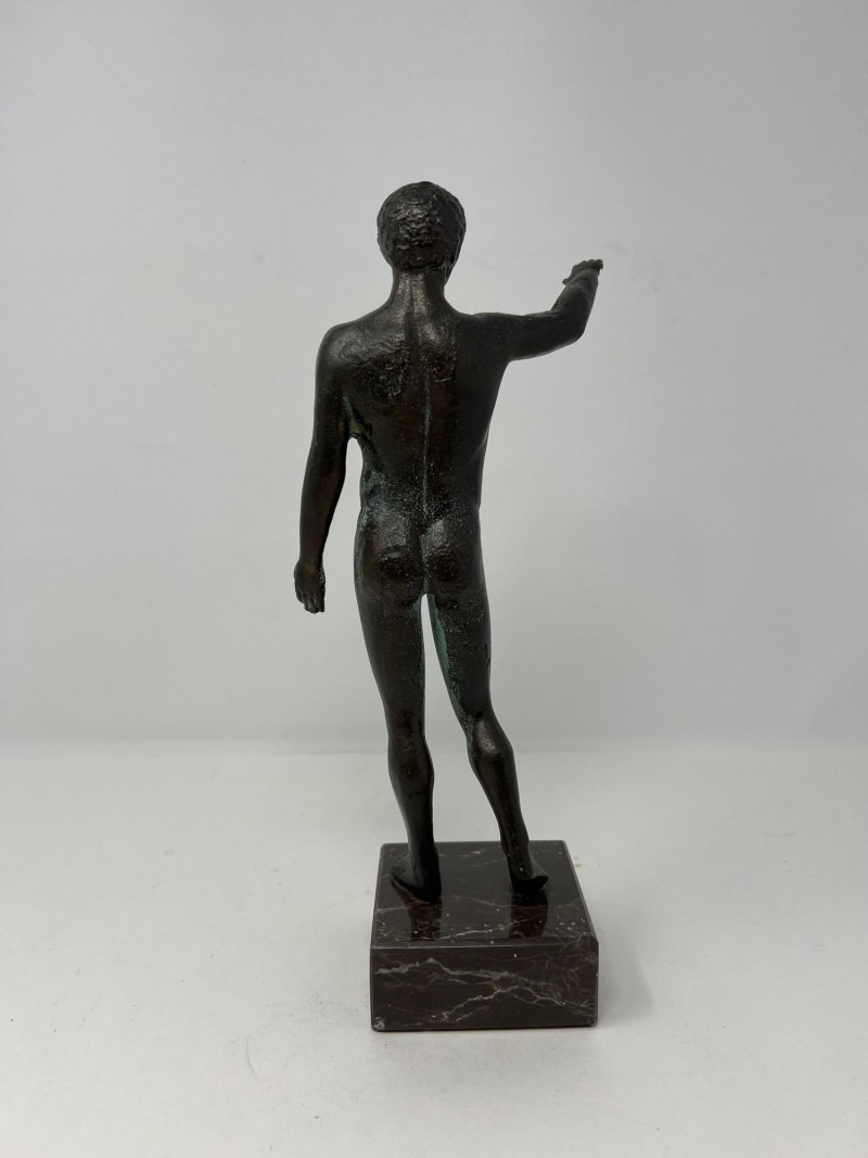 This classical-style bronze statue depicts a nude male figure standing in contrapposto, with one arm extended forward and the other relaxed by his side. Crafted with fine anatomical detail and textured hair, the figure exudes a strong Greco-Roman influence reminiscent of ancient athletic or heroic poses. The statue is securely mounted on a polished square marble base, adding both contrast and elegance. Patina and wear are present, particularly at the extended arm, indicating age and character. A striking piece ideal for collectors of classical art or décor with a historical flair. Material: Solid bronze with marble base