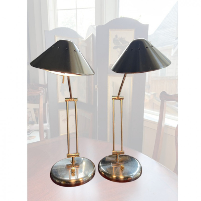 Pair of Chrome Adjustable Dimming Desk Lamps feature a sleek, modern design with a conical shade, slender vertical stand, and round base. The small perforations near the top of the shade add a subtle decorative touch while allowing light diffusion. These lamps are adjustable, making them ideal for task lighting in home offices or workspaces.