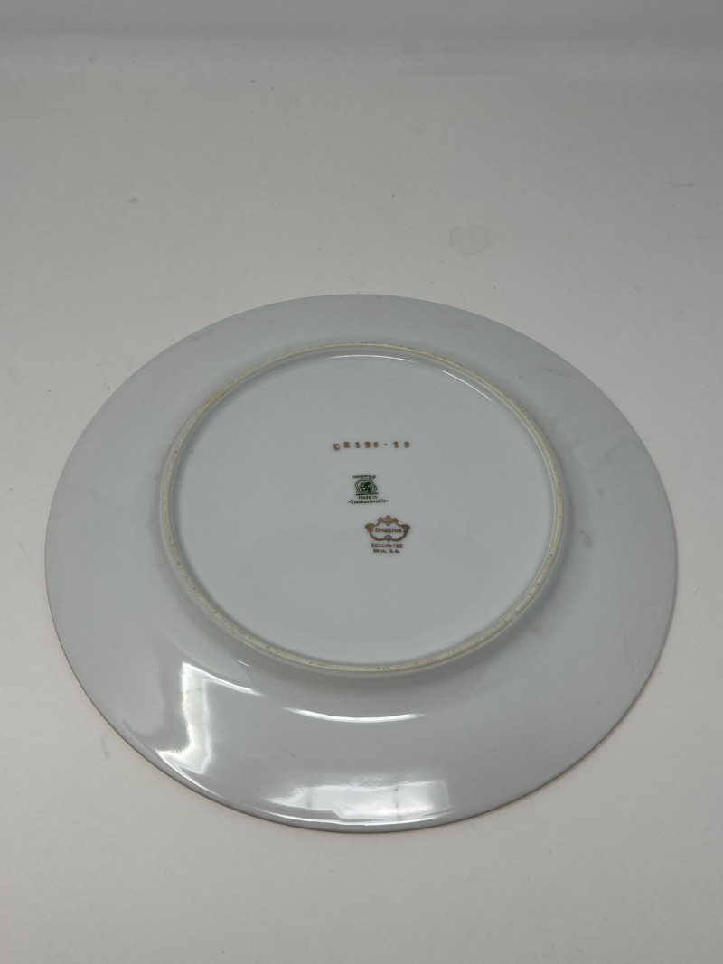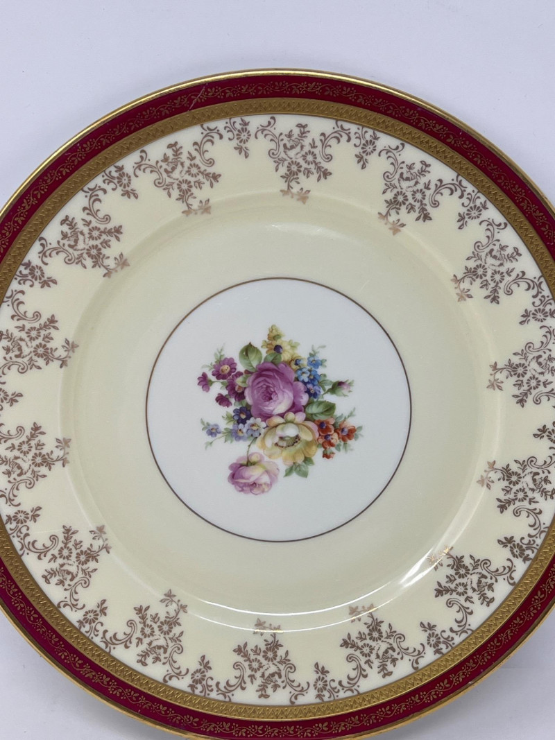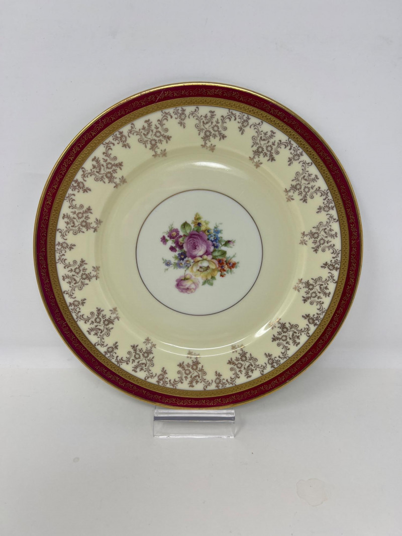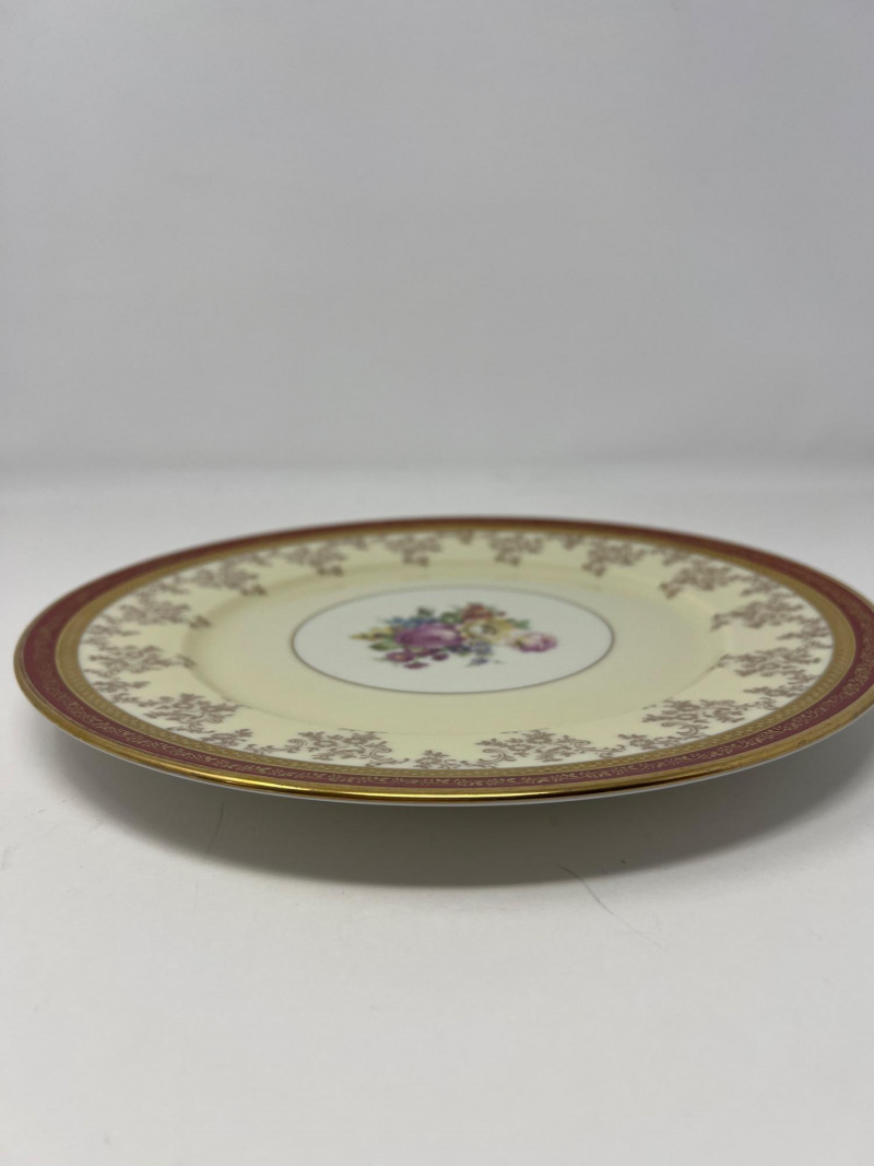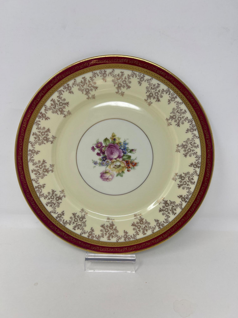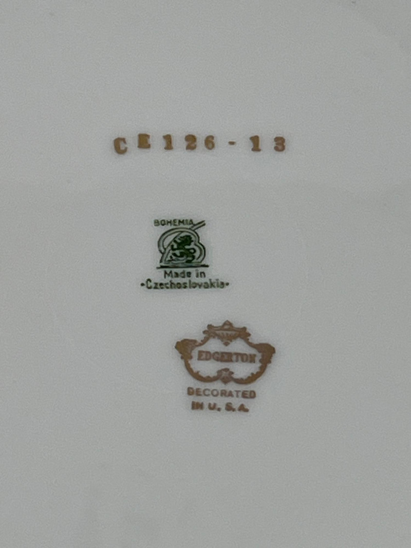 Elegant vintage porcelain plate made in Czechoslovakia by Bohemia and decorated in the U.S.A. by Edgerton. The design features a central floral bouquet in soft purples, pinks, and yellows, framed by intricate gold scrollwork on a creamy ivory ground. A wide burgundy band with gold filigree trims the rim. Backstamp Details: Marked “Bohemia – Made in Czechoslovakia” Edgerton – Decorated in U.S.A. Pattern code: CE126-13