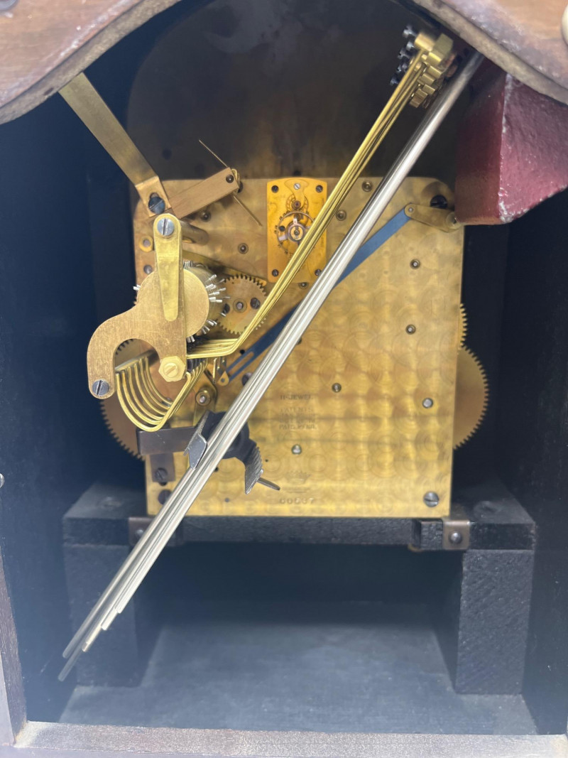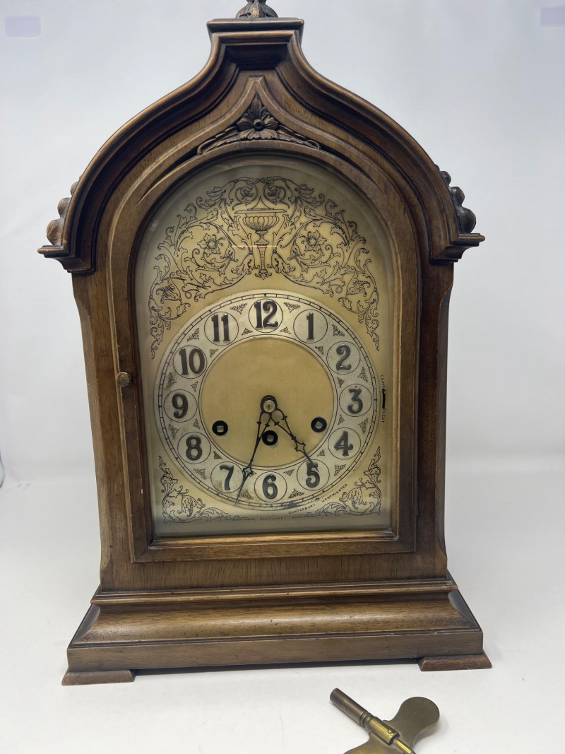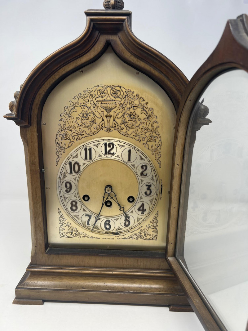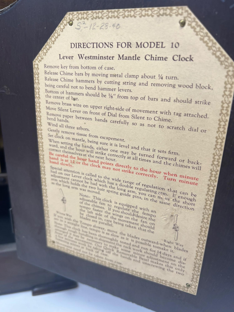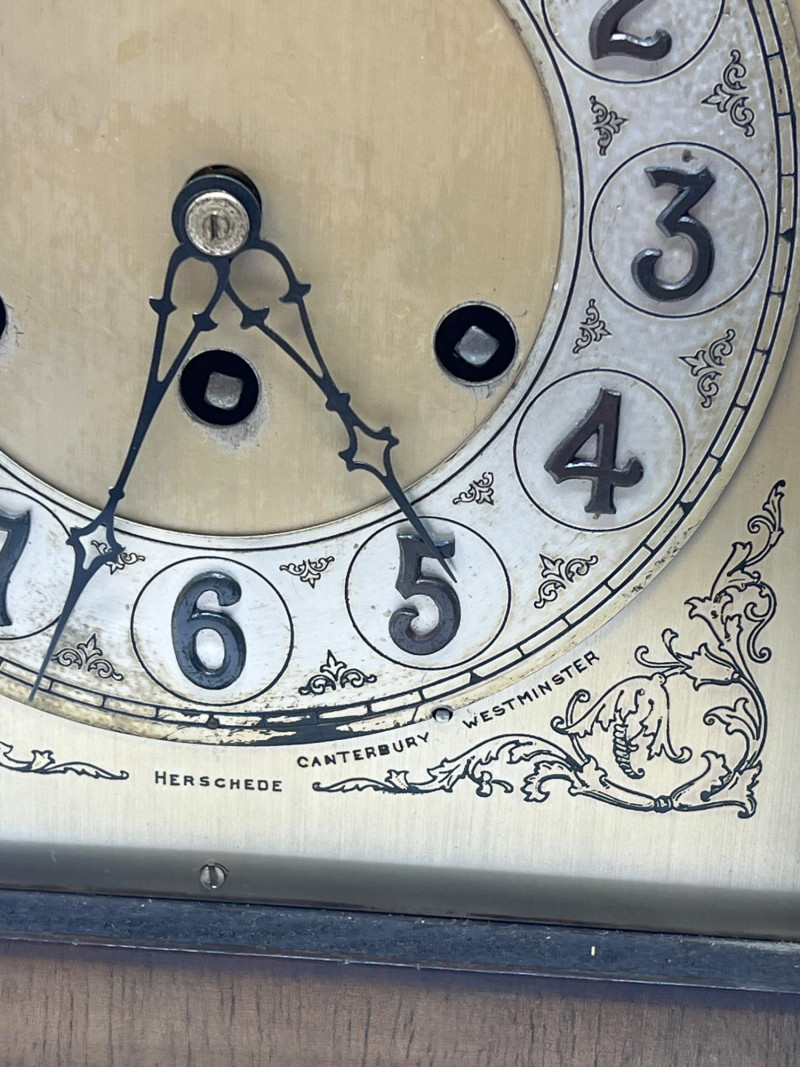 A beautifully crafted vintage mantel clock by Herschede Hall Clock Co., Cincinnati, USA. This Westminster chime clock features a classic wood encasement with an ornate silvered dial, Roman numerals, and elegant black hands. The clock offers both Westminster and Canterbury chime options. Maker: Herschede Hall Clock Co., Cincinnati, Ohio, USA Model: 10, Lever Westminster Mantel Chime Clock Chime Options: Westminster and Canterbury Movement: 11-Jewel, patented Jan. 28, 1919 and Oct. 21, 1919 Serial Number: 60537 Features: Ornate silver-tone dial with floral engraving Original Herschede winding key included Internal instructions label still attached Brass movement with visible chime rods and hammer mechanism Note: The clock will need servicing to be fully operational