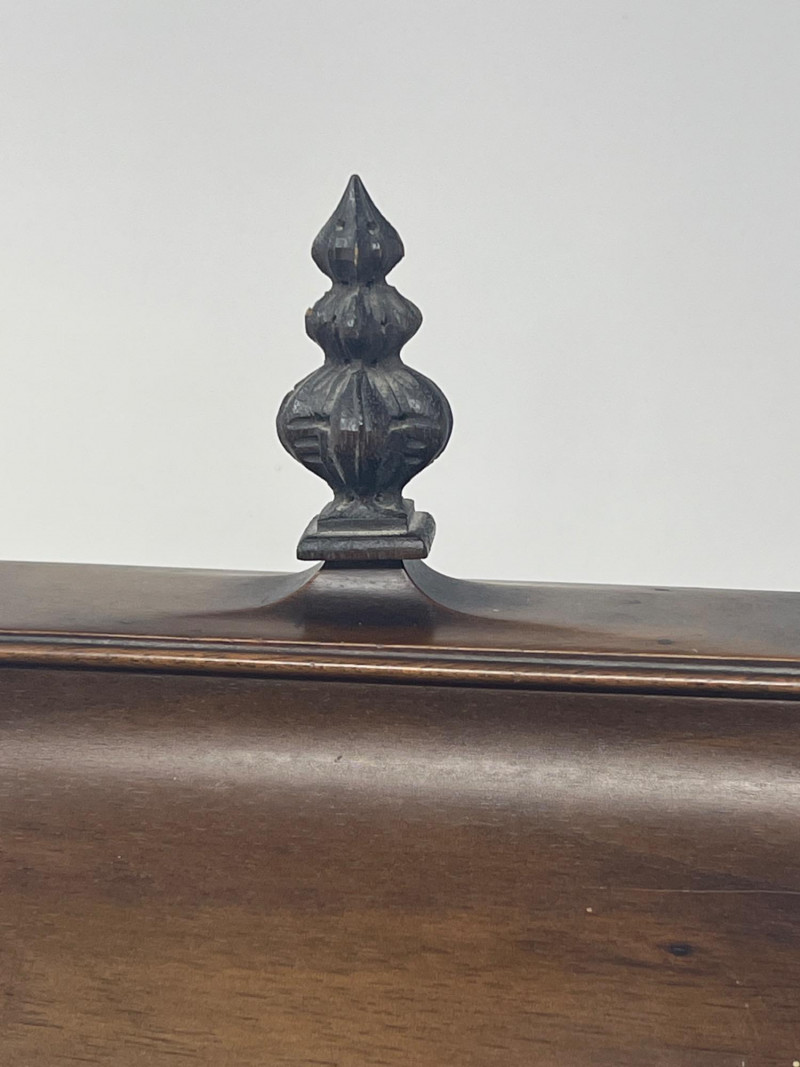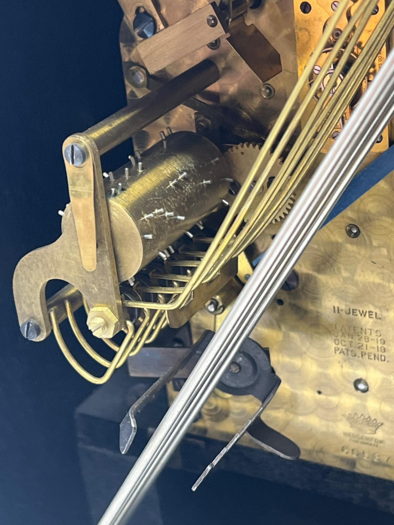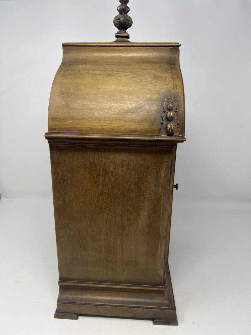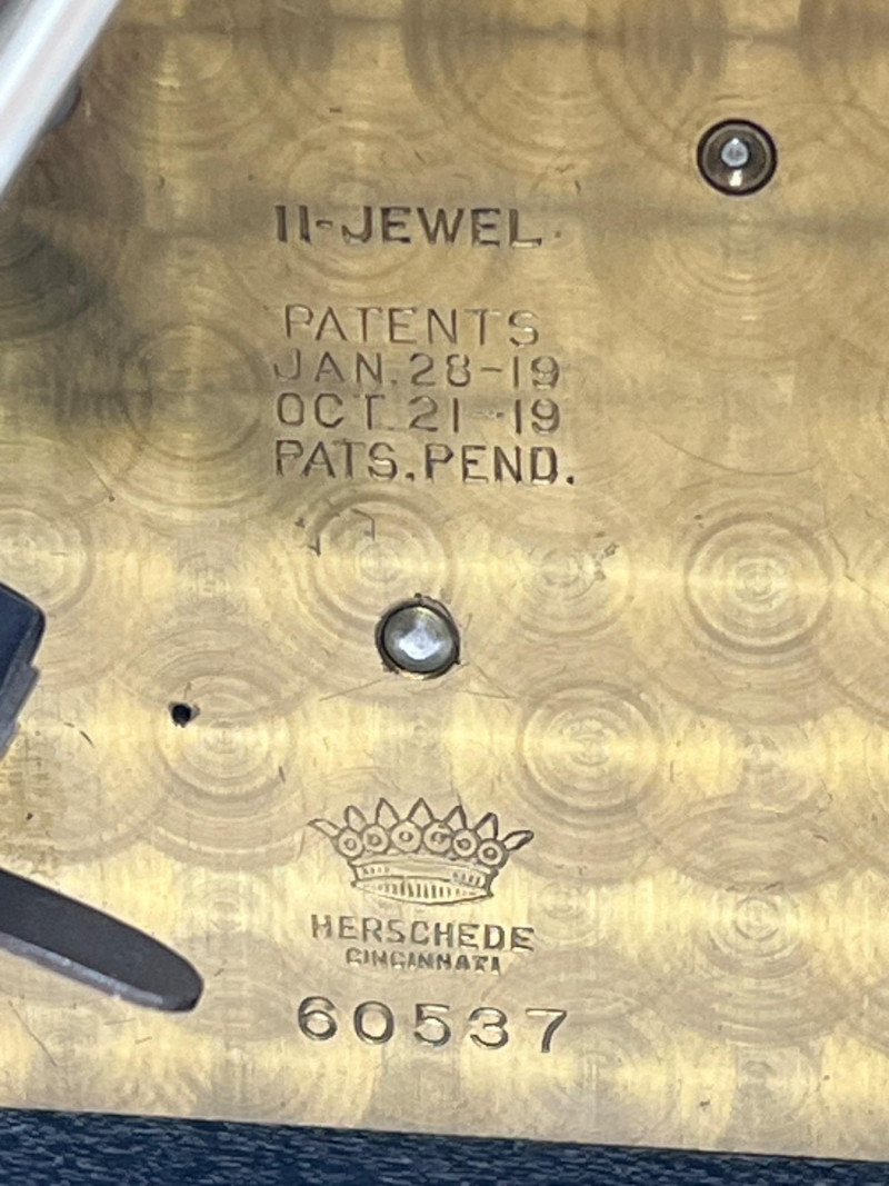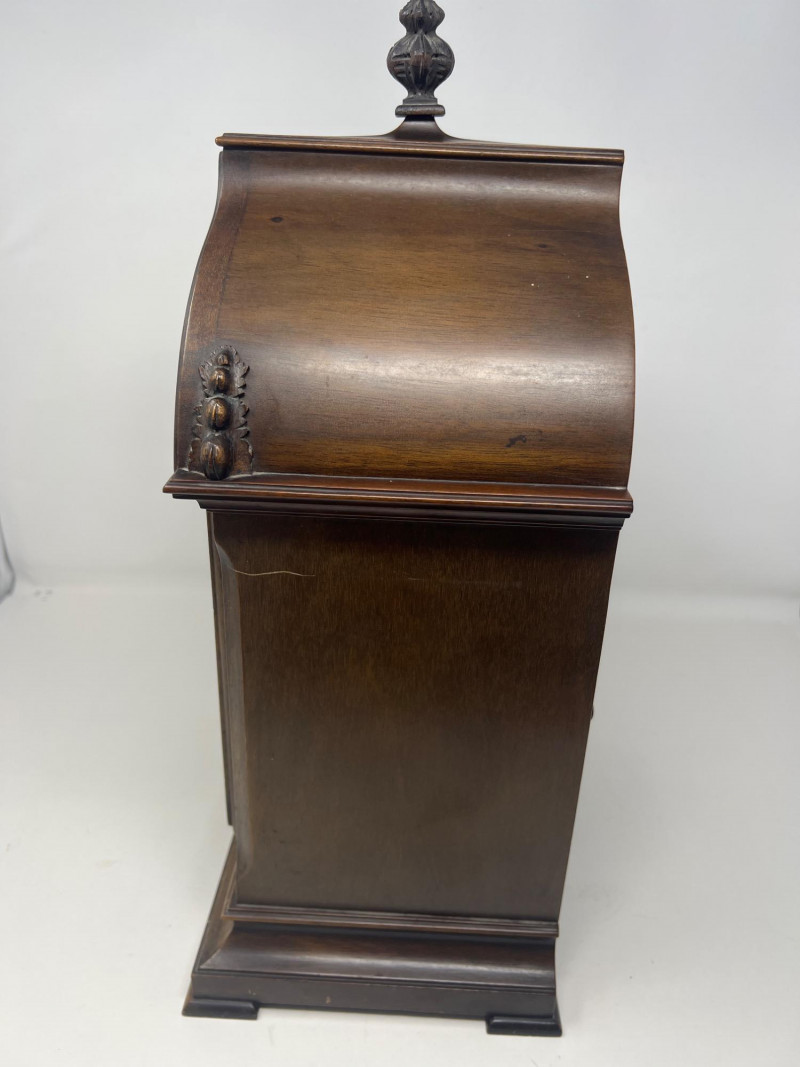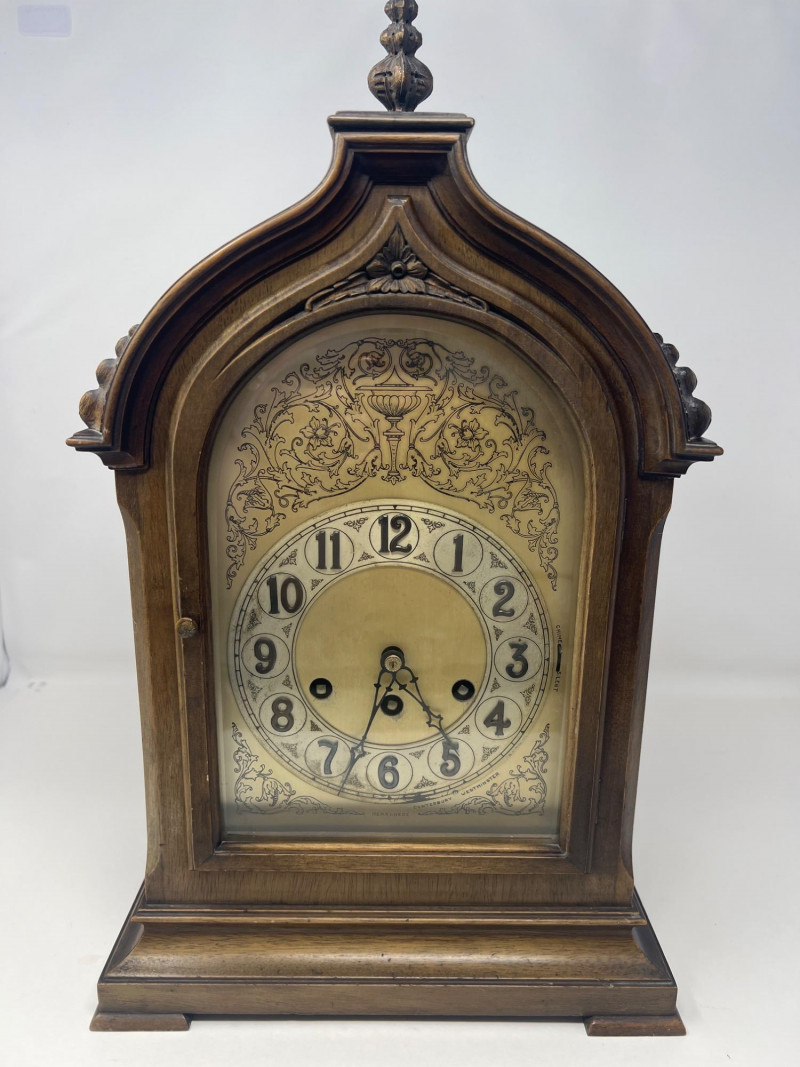 A beautifully crafted vintage mantel clock by Herschede Hall Clock Co., Cincinnati, USA. This Westminster chime clock features a classic wood encasement with an ornate silvered dial, Roman numerals, and elegant black hands. The clock offers both Westminster and Canterbury chime options. Maker: Herschede Hall Clock Co., Cincinnati, Ohio, USA Model: 10, Lever Westminster Mantel Chime Clock Chime Options: Westminster and Canterbury Movement: 11-Jewel, patented Jan. 28, 1919 and Oct. 21, 1919 Serial Number: 60537 Features: Ornate silver-tone dial with floral engraving Original Herschede winding key included Internal instructions label still attached Brass movement with visible chime rods and hammer mechanism Note: The clock will need servicing to be fully operational