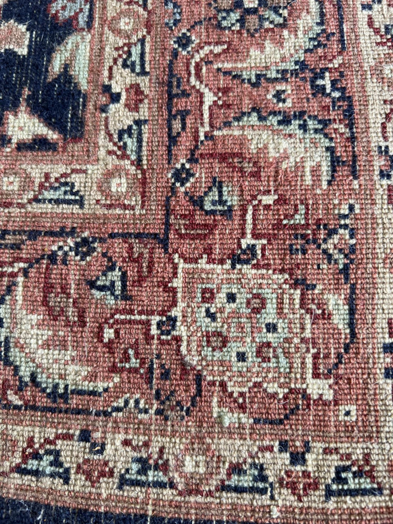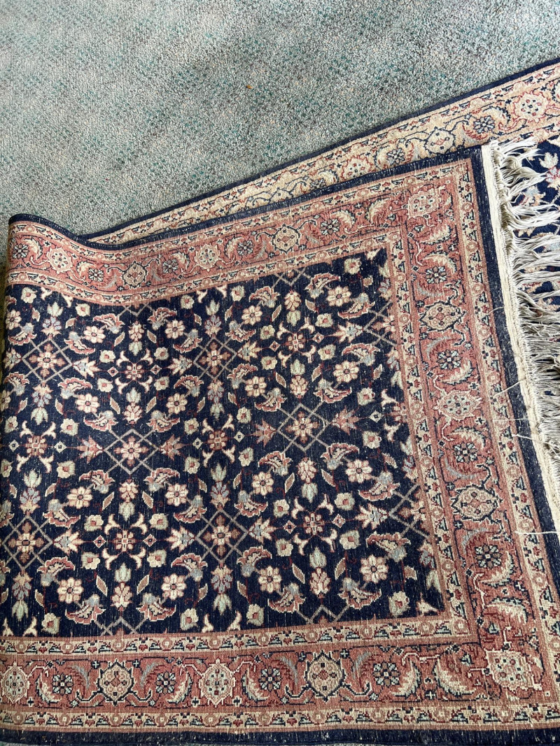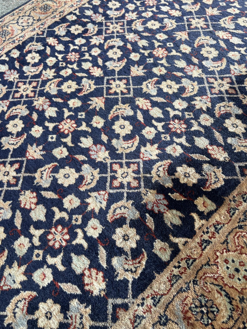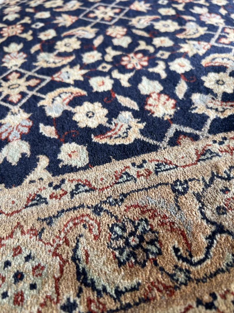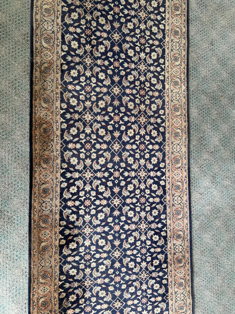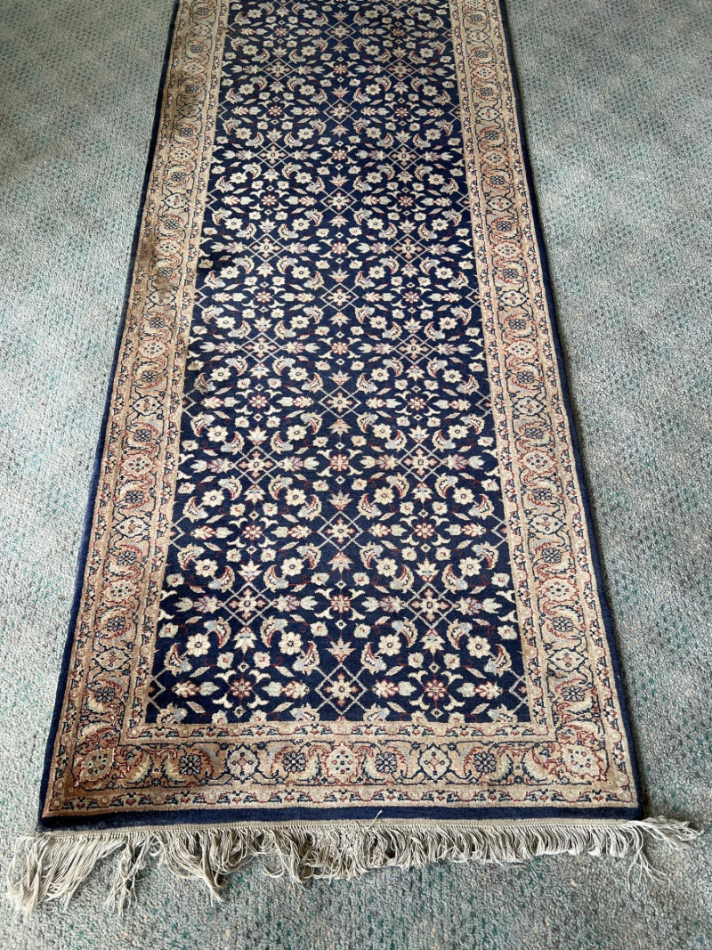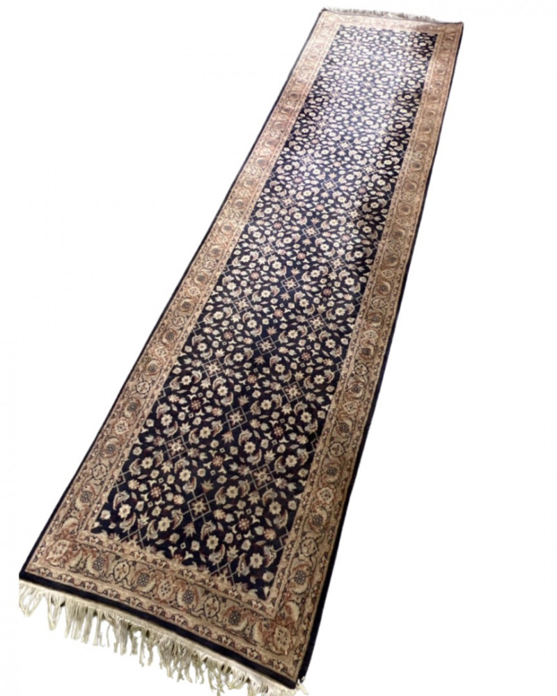 Add timeless elegance to your space with this beautiful Persian Tabriz runner rug. Featuring a classic floral design on a rich navy blue field, this hand-knotted piece is bordered with intricate motifs in shades of beige, rose, and soft blues. Details: Type: Persian Tabriz Runner Rug Technique: Hand-knotted Pattern: Allover floral with intricate borders Colors: Navy blue field with beige, rose, and light blue accents Material: Wool pile