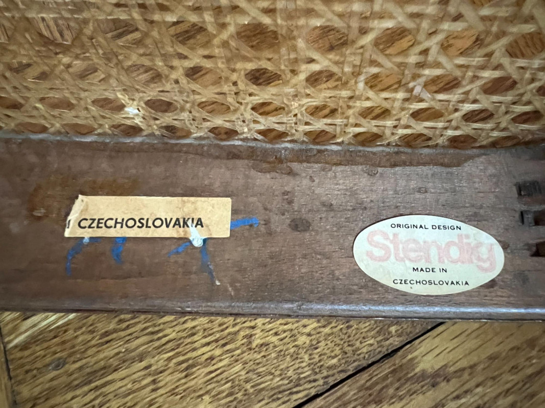 Classic bentwood and cane dining chairs designed by Josef Hoffmann for Stendig, made in Czechoslovakia. Known as the "Prague" or "Bentwood" chair, this Bauhaus-era design features a rounded, caned back and seat with elegant bentwood frames. Set includes 4 chairs: 3 in lighter wood finish, 1 in darker wood finish Original "Stendig – Made in Czechoslovakia" labels intact Timeless mid-century design attributed to Hoffmann's iconic work