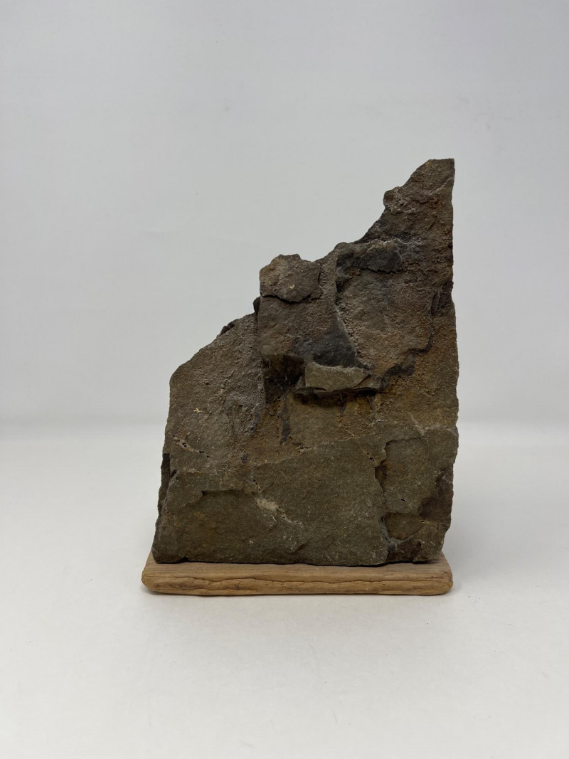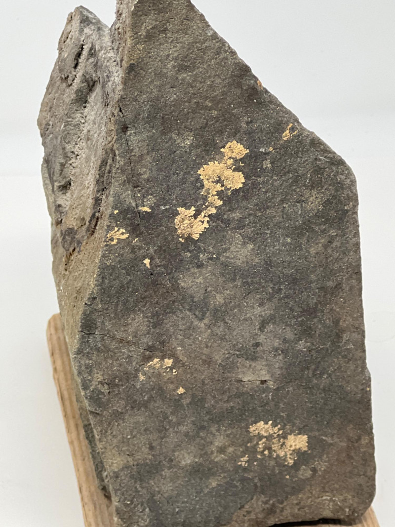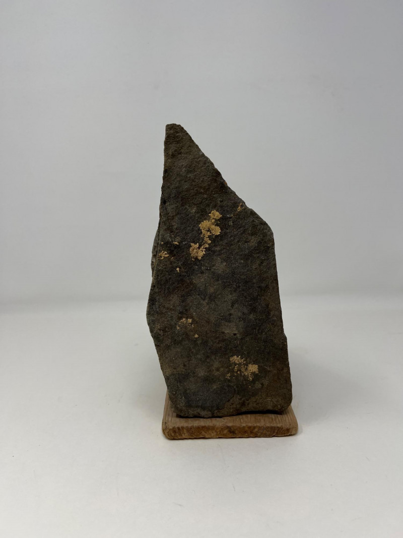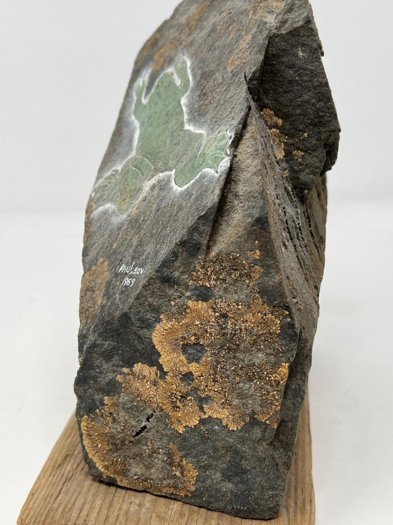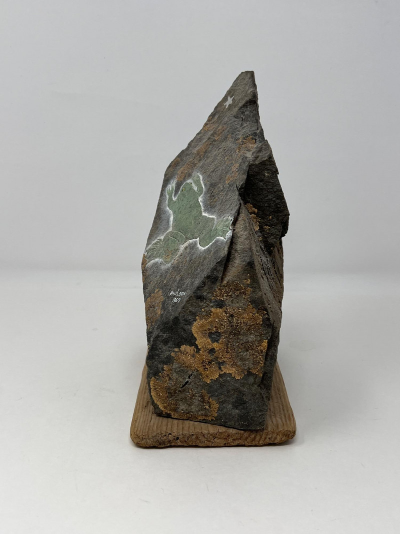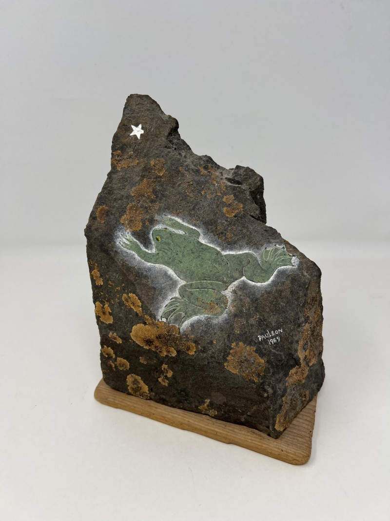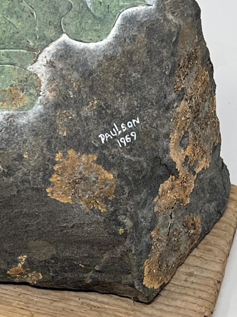 Intriguing hand-painted stone sculpture signed Paulson 1969, featuring a stylized green frog outlined in white, etched into the surface of a dark, heavy stone. A white star motif appears near the peak, adding a celestial touch. The stone shows rich patination with rusty, golden patches, reminiscent of iron oxidation often seen in meteorites—suggesting this may have been created on a space rock, though unconfirmed. The piece stands vertically on a custom-carved wooden base and offers full sculptural presence from all sides. A compelling example of mid-century natural surface art, with potential ties to meteorite folk art traditions. Key Details: Signed: Paulson Dated: 1969 Medium: Painted and carved natural stone (possible meteorite), wood base Subject: Frog with white star