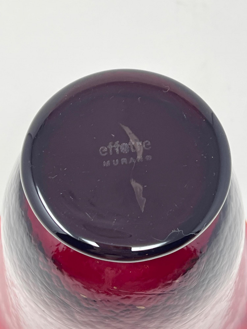 A striking example of Venetian craftsmanship, this ruby red vase by Effetre Murano features deep, rich tones with a glossy finish and subtle surface texture. Its flared lip and rounded base create a refined, elegant form that stands beautifully on its own or as a vessel for floral arrangements. Brand: Effetre Murano (etched on base) Color: Ruby red with dark undertones at the base Material: Hand-blown Murano glass Origin: Murano, Italy