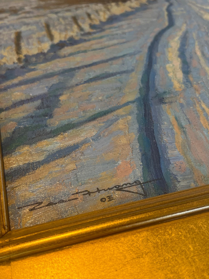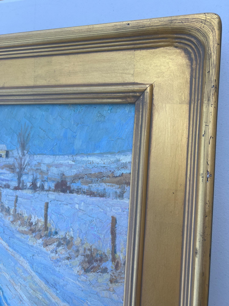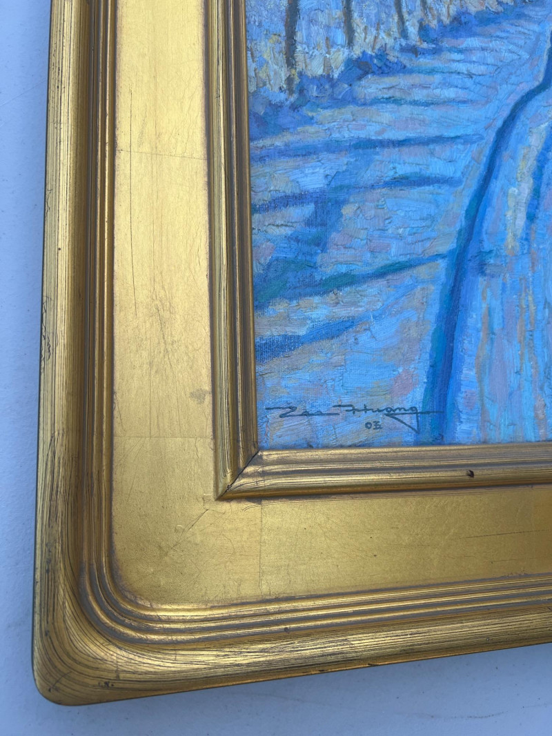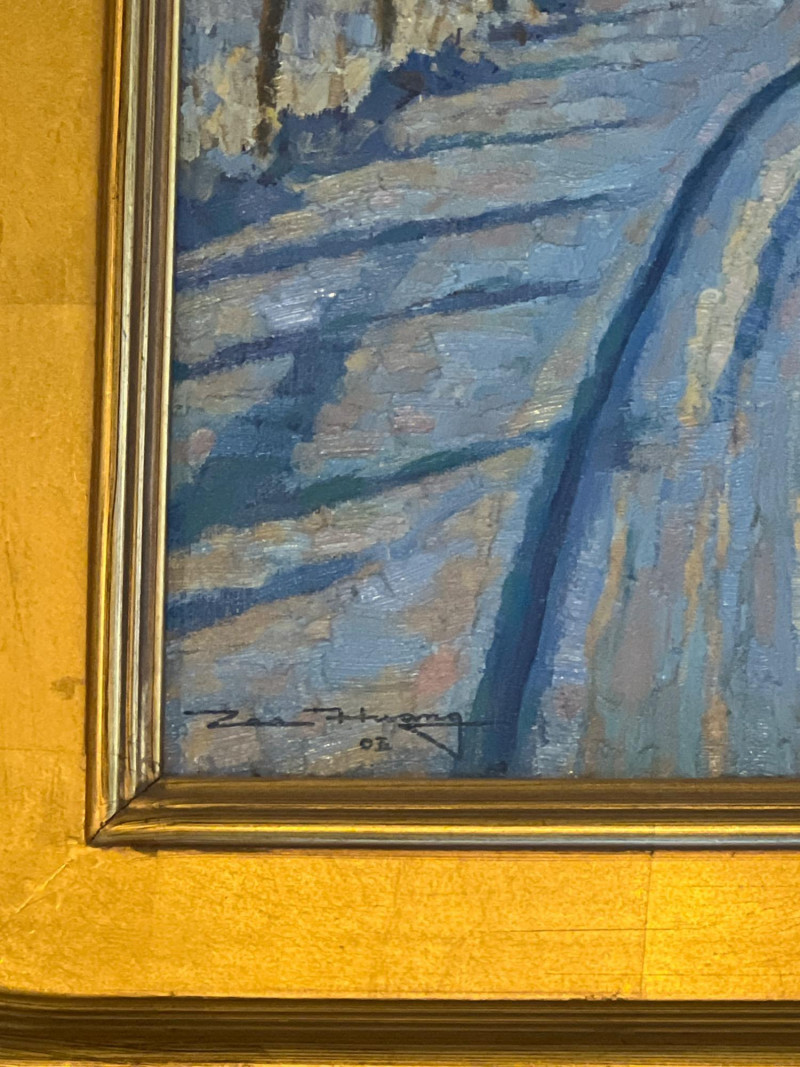 A tranquil winter landscape by Zee Huang, Snow Covered Ranch Road captures the serene beauty of a snowy countryside. Rendered in cool blue and lavender tones, the painting features a winding snow-covered path flanked by rustic fencing and barren trees, leading to a distant farmhouse under a pale sky. Executed with thick, expressive brushwork, this oil on canvas evokes the quiet stillness and depth of rural winter scenes. Beautifully framed and signed by the artist, this piece is a striking example of Huang’s command of light and atmosphere. Title: Snow Covered Ranch Road