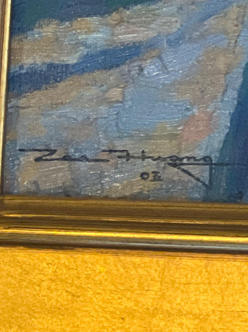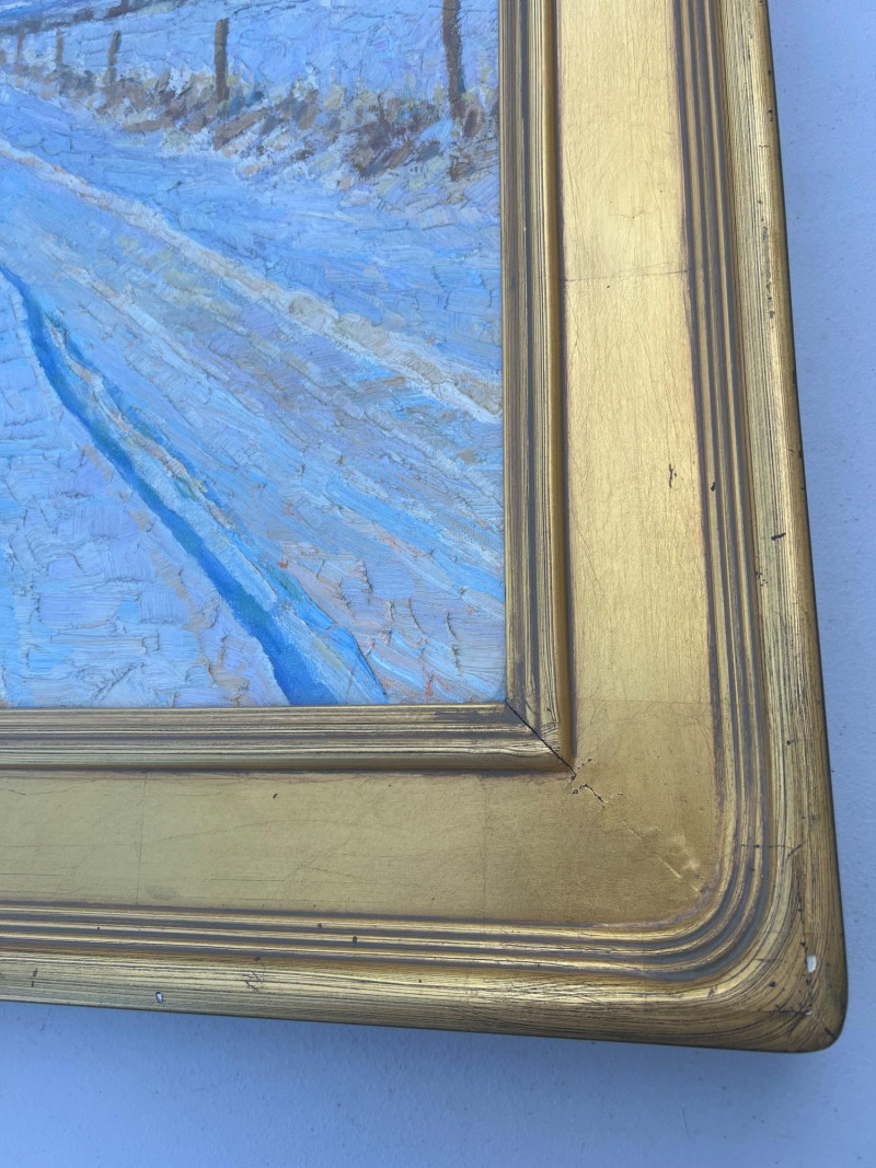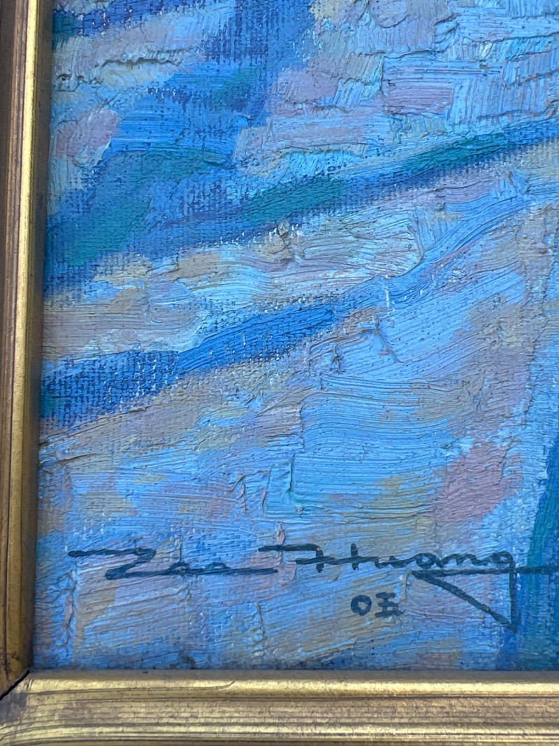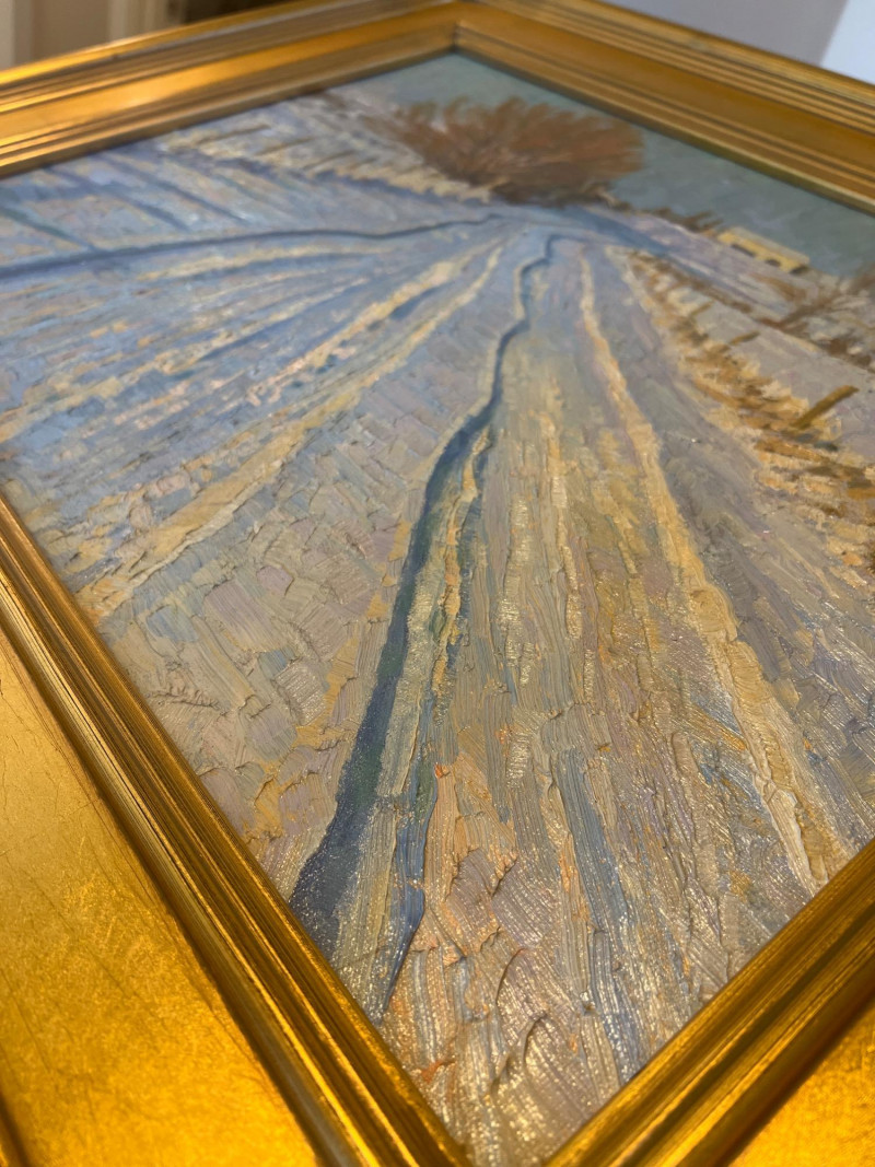 A tranquil winter landscape by Zee Huang, Snow Covered Ranch Road captures the serene beauty of a snowy countryside. Rendered in cool blue and lavender tones, the painting features a winding snow-covered path flanked by rustic fencing and barren trees, leading to a distant farmhouse under a pale sky. Executed with thick, expressive brushwork, this oil on canvas evokes the quiet stillness and depth of rural winter scenes. Beautifully framed and signed by the artist, this piece is a striking example of Huang’s command of light and atmosphere. Title: Snow Covered Ranch Road