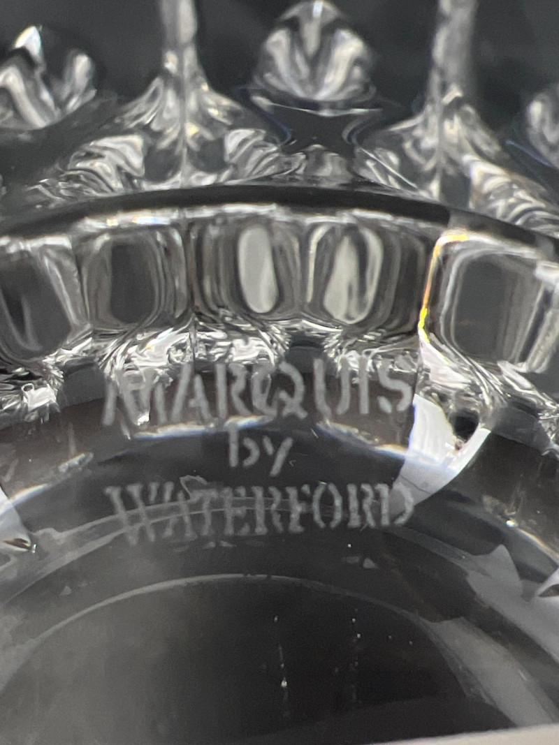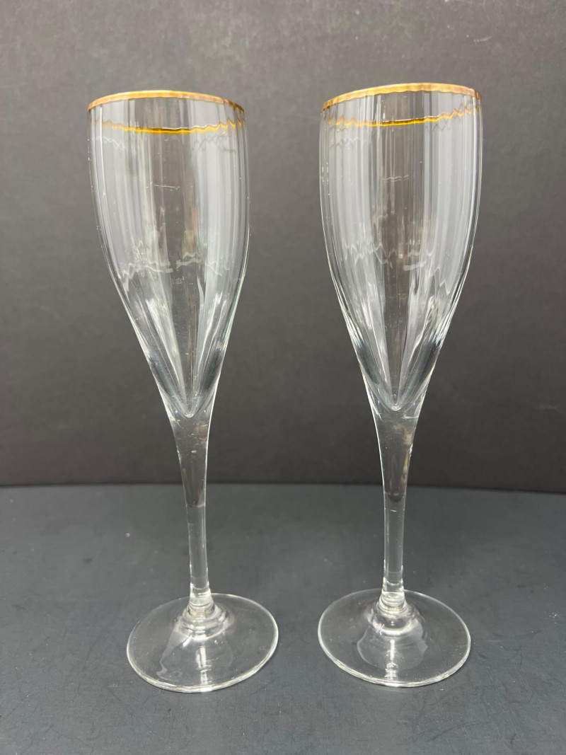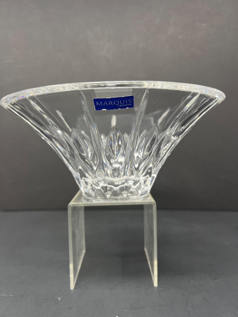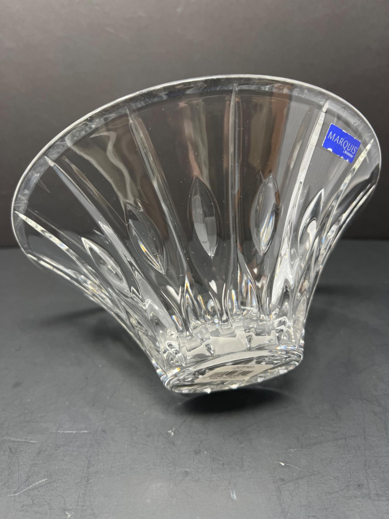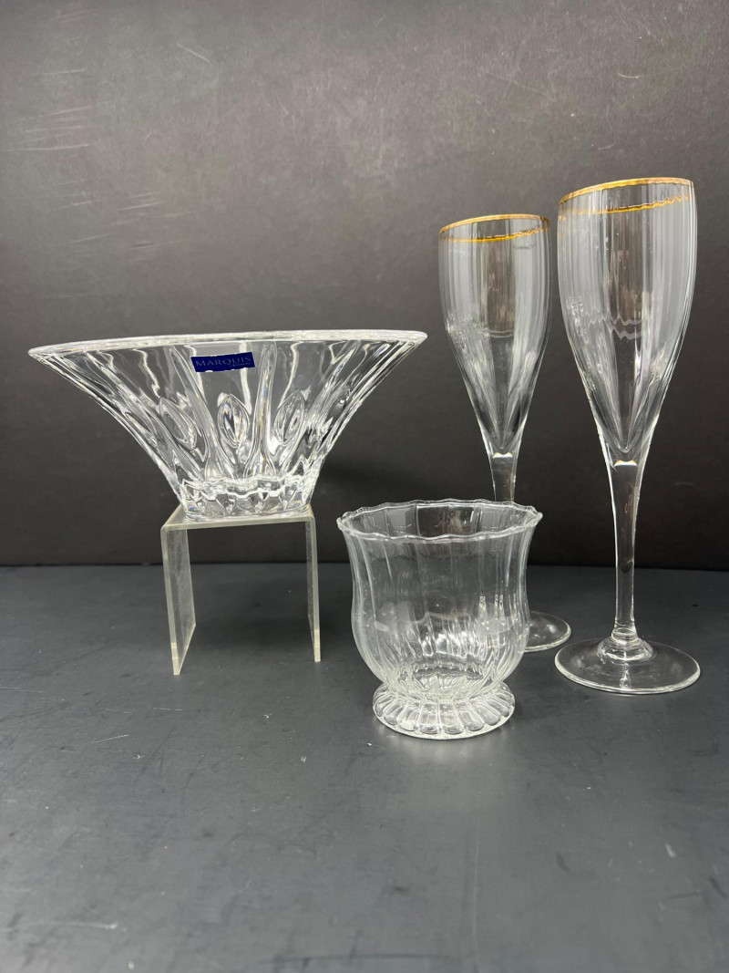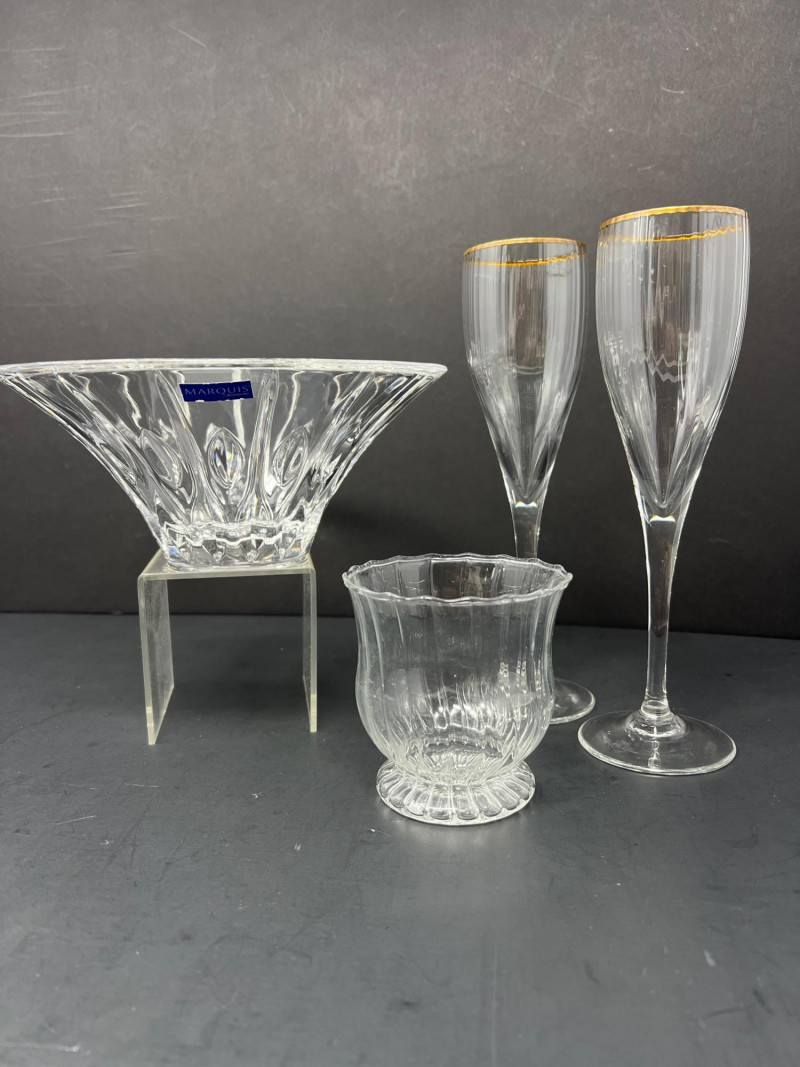 This refined crystal collection from Marquis by Waterford combines timeless elegance and exceptional craftsmanship. The set includes four beautiful pieces, ideal for both display and entertaining: Sheridan Flared Crystal Bowl – Measuring 8 inches in diameter and 3.75 inches tall, this bowl features a dramatic flared design with deep vertical cuts and teardrop accents that catch and reflect the light beautifully. The base is etched with “Marquis by Waterford,” and the original sticker is still intact. Made in Germany, this piece embodies both quality and luxury. Pair of Champagne Flutes – Each glass stands approximately 8.75 inches tall, with slender stems, elongated bowls, and a soft ribbed texture. A delicate gold rim adds a subtle touch of sophistication. These flutes are perfect for celebrating special occasions in style. Small Footed Vase – Measuring 3.75 inches tall, this petite crystal vase features a scalloped rim, ribbed bowl, and sturdy fluted base. It’s a charming addition to any table or shelf, ideal for a small floral arrangement or simply as a decorative piece.