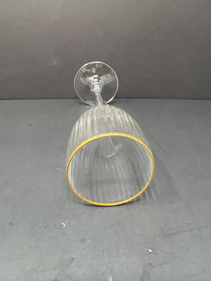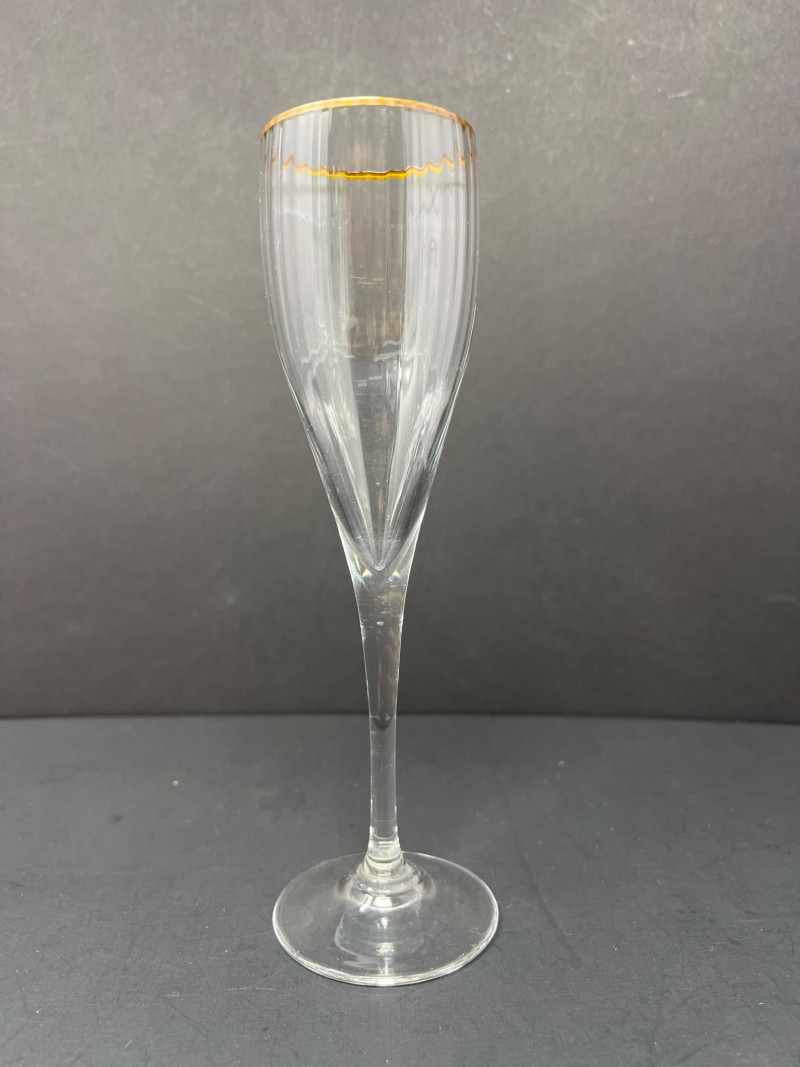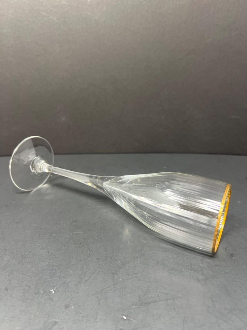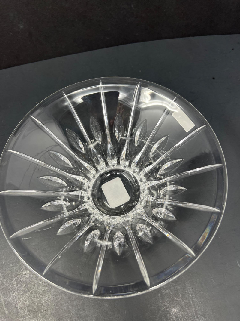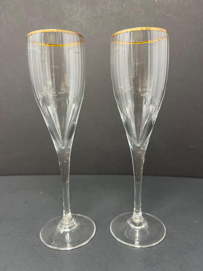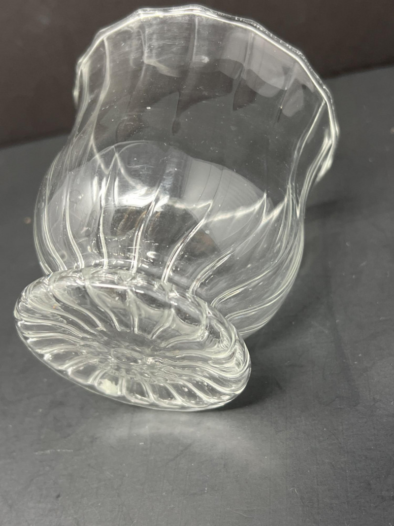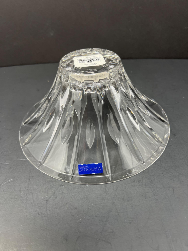 This refined crystal collection from Marquis by Waterford combines timeless elegance and exceptional craftsmanship. The set includes four beautiful pieces, ideal for both display and entertaining: Sheridan Flared Crystal Bowl – Measuring 8 inches in diameter and 3.75 inches tall, this bowl features a dramatic flared design with deep vertical cuts and teardrop accents that catch and reflect the light beautifully. The base is etched with “Marquis by Waterford,” and the original sticker is still intact. Made in Germany, this piece embodies both quality and luxury. Pair of Champagne Flutes – Each glass stands approximately 8.75 inches tall, with slender stems, elongated bowls, and a soft ribbed texture. A delicate gold rim adds a subtle touch of sophistication. These flutes are perfect for celebrating special occasions in style. Small Footed Vase – Measuring 3.75 inches tall, this petite crystal vase features a scalloped rim, ribbed bowl, and sturdy fluted base. It’s a charming addition to any table or shelf, ideal for a small floral arrangement or simply as a decorative piece.