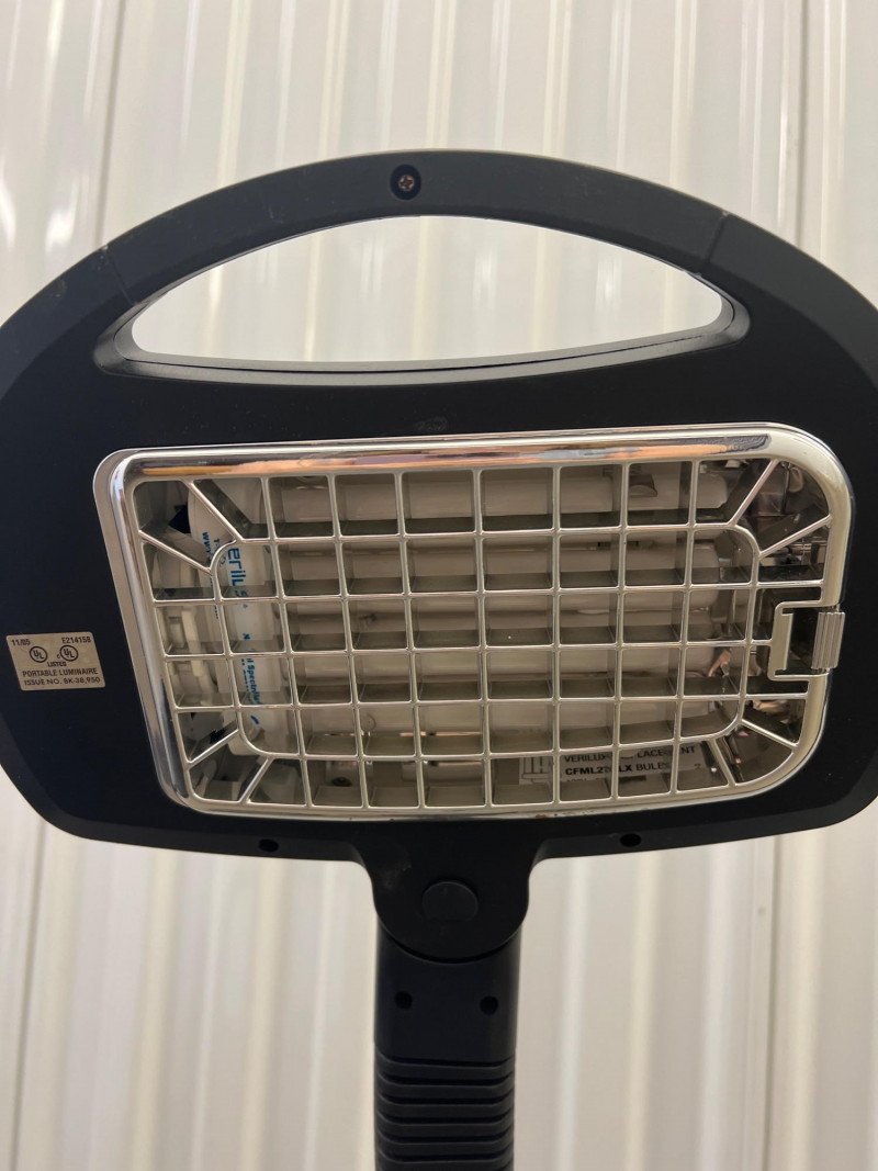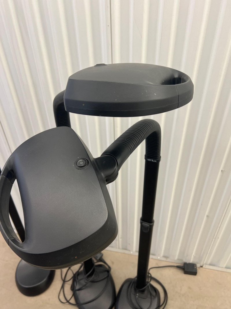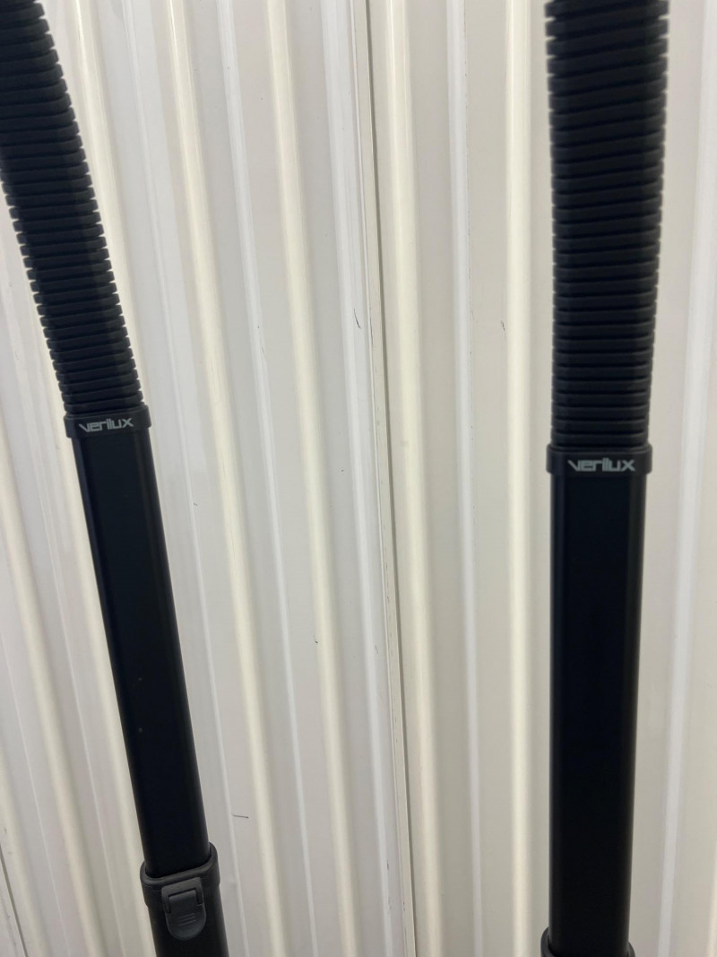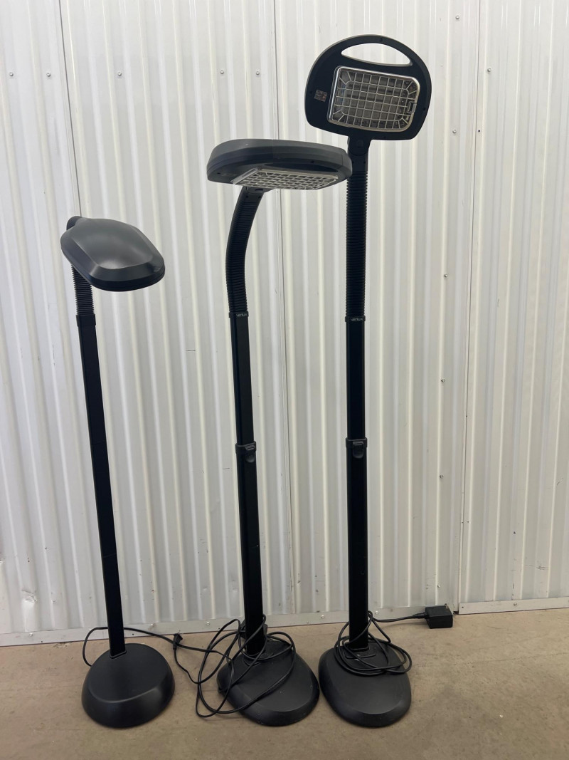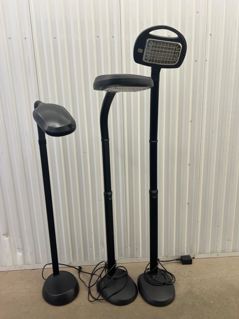 Set of three modern Verilux LED floor lamps, designed for versatile and adjustable lighting. The first lamp features an oblong head with a flexible gooseneck and a stationary post, standing at approximately 44" tall. The other two lamps offer fully adjustable functionality—heads can tilt up, down, and side-to-side, while the height-adjustable posts extend beyond 42".