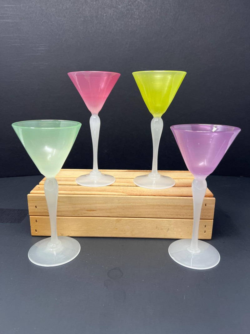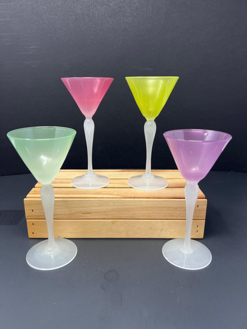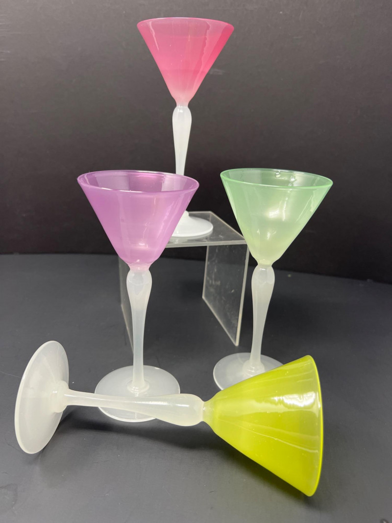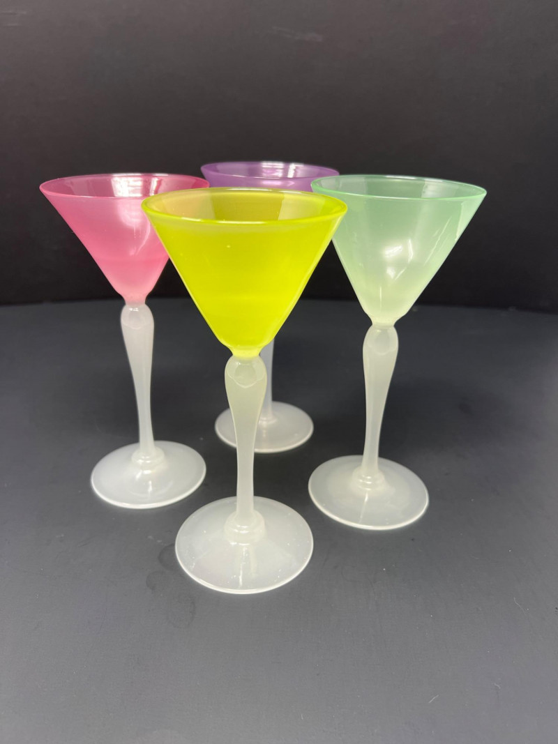 A stunning set of four vintage martini glasses attributed to Stevens & Williams, dating to the 1920s. Each glass features a satin-frosted stem and base paired with a delicately colored bowl in pastel shades of pink, green, yellow, and purple. The elegant contrast between the opalescent stems and vibrant tops showcases the craftsmanship and style of early 20th-century English glassmaking. Features: Maker: Stevens & Williams (attributed) Era: 1920s Material: Hand-blown glass Colors: Pink, Green, Yellow, Purple
