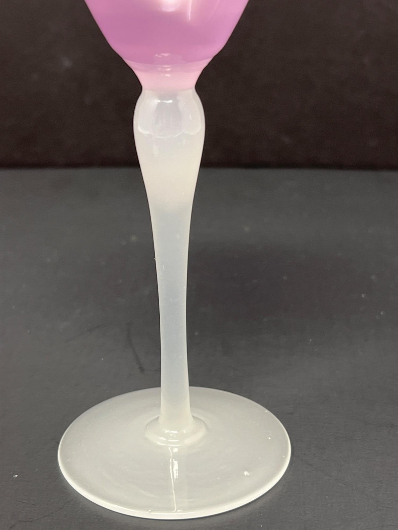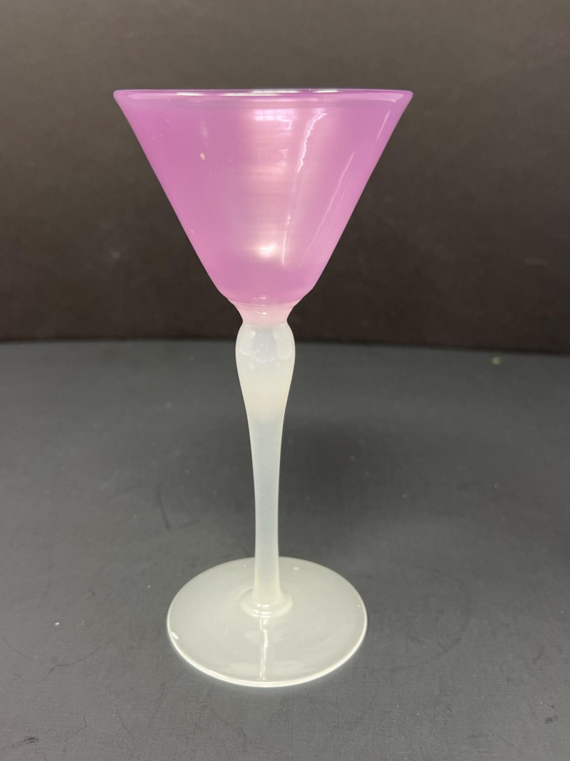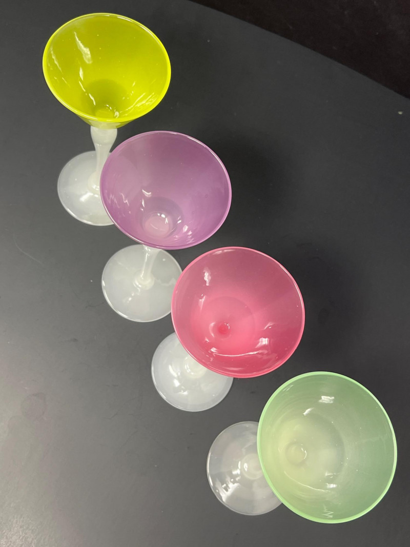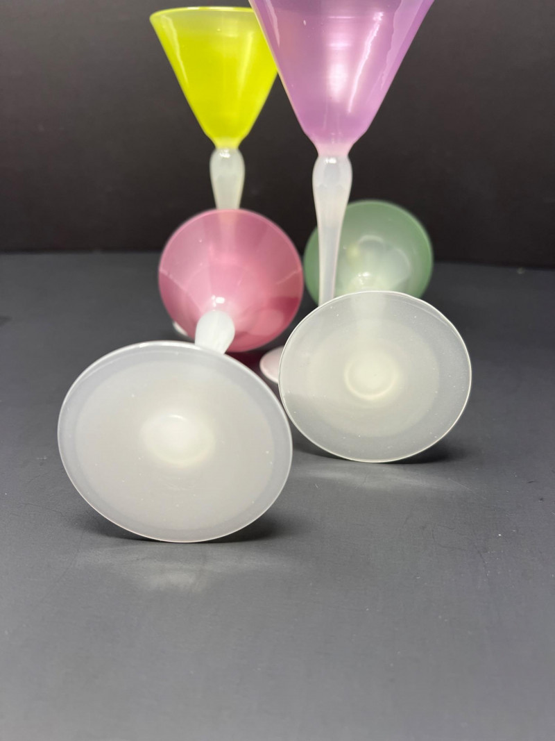 A stunning set of four vintage martini glasses attributed to Stevens & Williams, dating to the 1920s. Each glass features a satin-frosted stem and base paired with a delicately colored bowl in pastel shades of pink, green, yellow, and purple. The elegant contrast between the opalescent stems and vibrant tops showcases the craftsmanship and style of early 20th-century English glassmaking. Features: Maker: Stevens & Williams (attributed) Era: 1920s Material: Hand-blown glass Colors: Pink, Green, Yellow, Purple