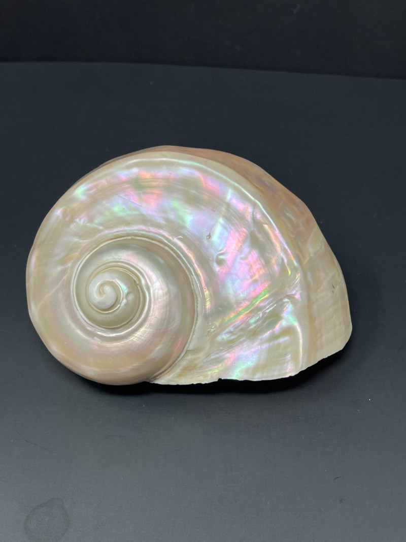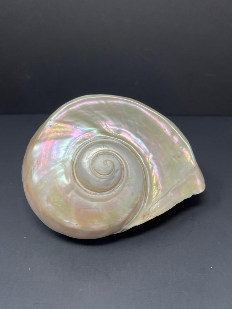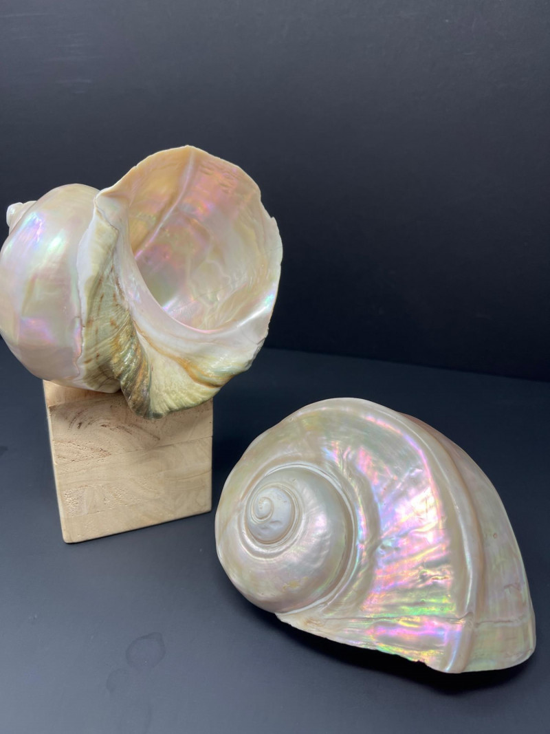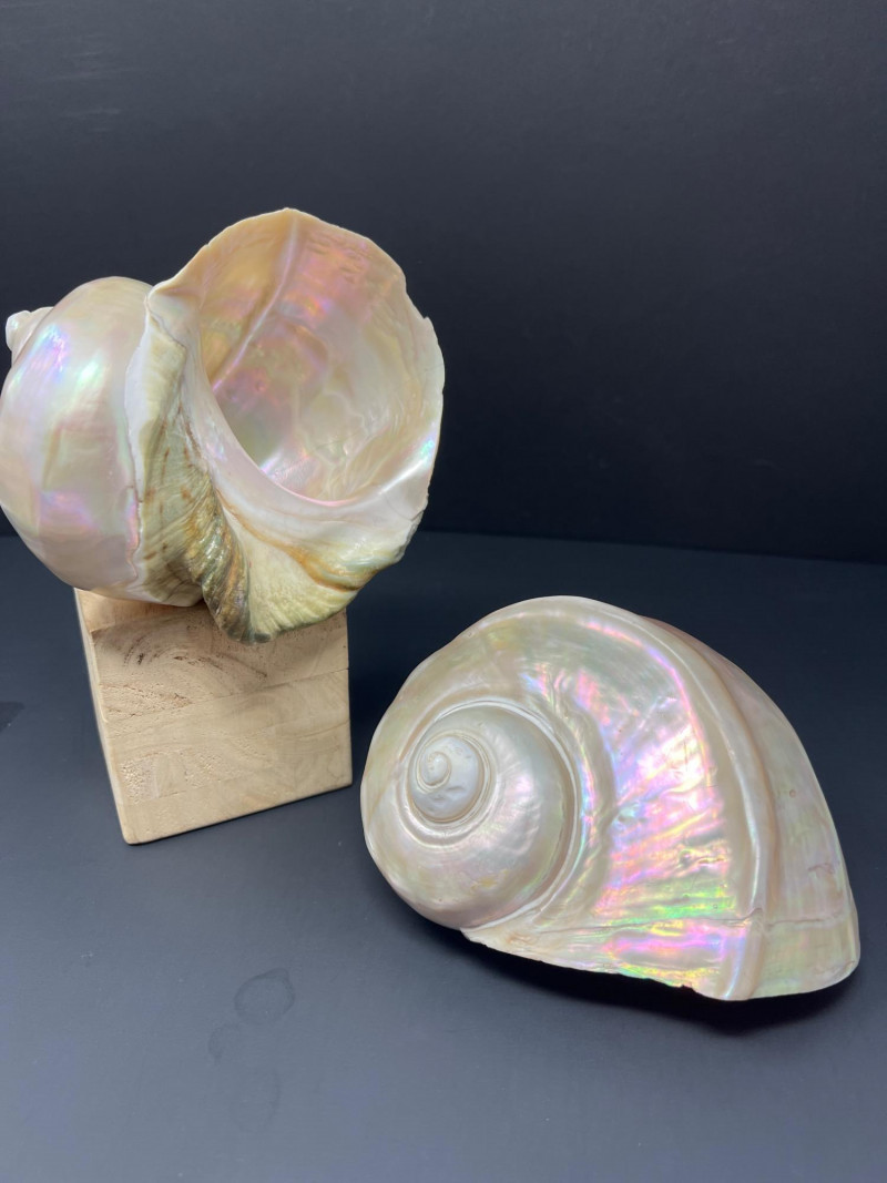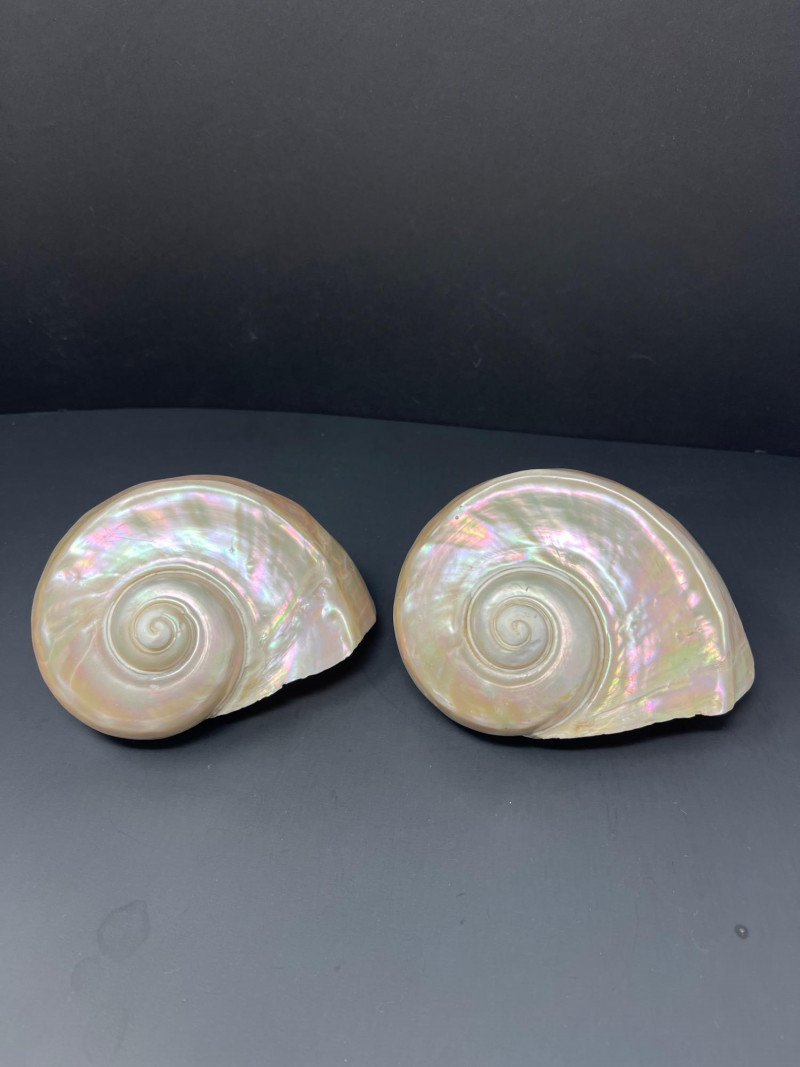 This stunning pair of Mother of Pearl Turbo shells showcases natural iridescence and creamy, pearlescent tones with hints of pink, green, and gold. These polished shells feature a spiral design and lustrous finish. Material: Natural Turbo shells with mother of pearl finish Quantity: 2 shells